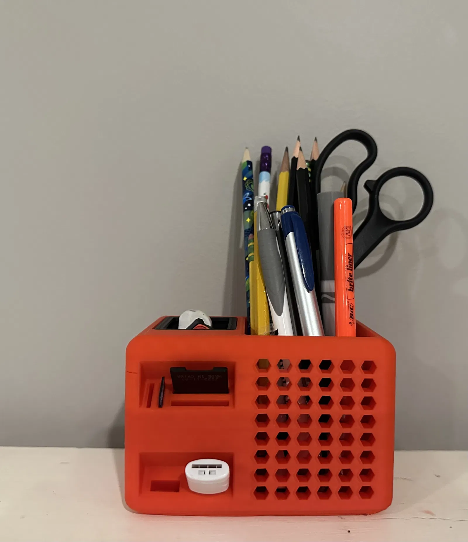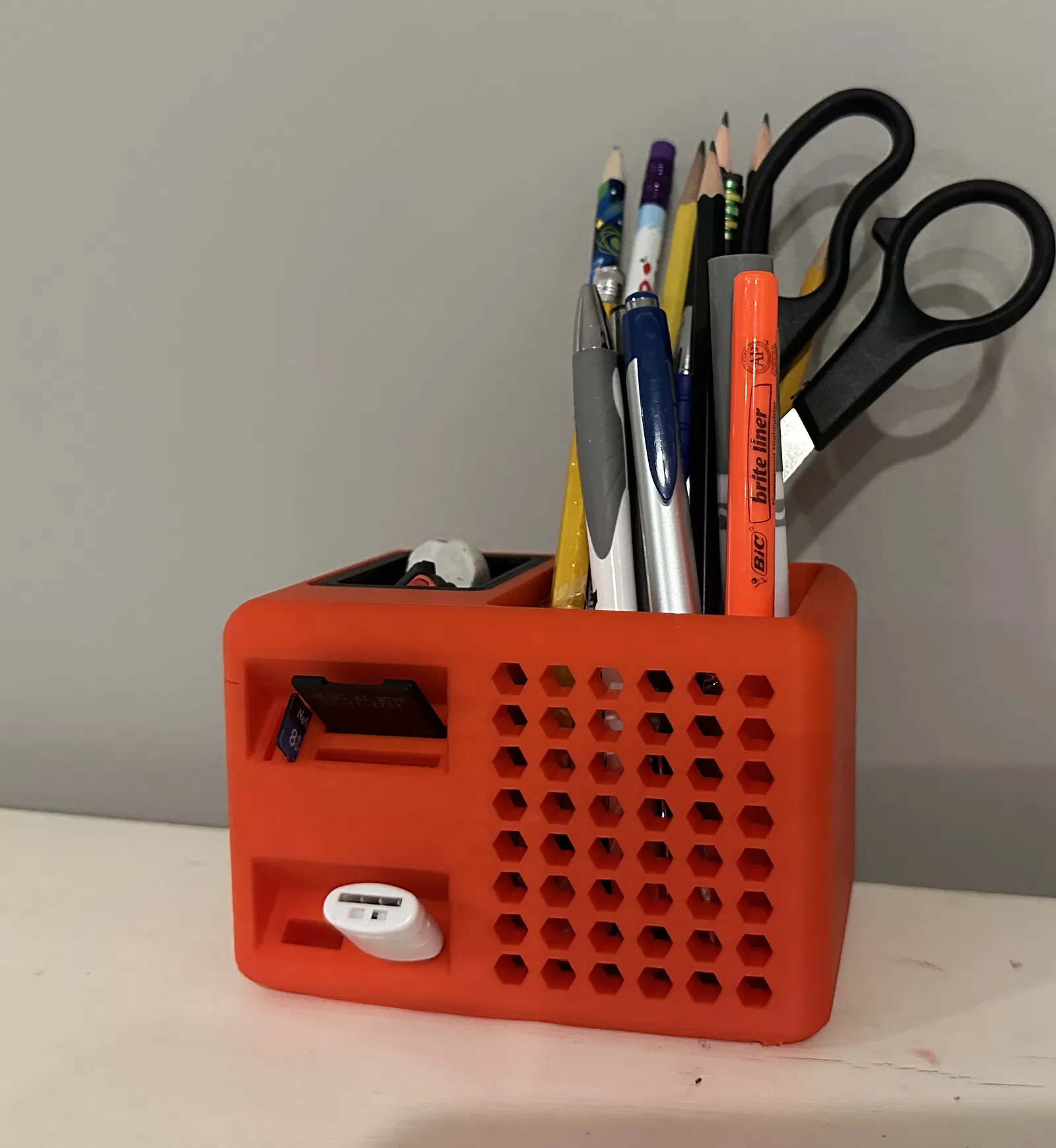 Mình tạo ra cái này để dọn dẹp bàn làm việc cho gọn gàng nè. Sản phẩm in 3D này là hộp đựng bút hình hộp, rất phù hợp để sắp xếp đồ dùng văn phòng, bàn làm việc. Với các tag như organizer, office, desk, pencil, pen, penholder, bạn có thể dễ dàng tìm thấy nó để trang trí và quản lý không gian làm việc của mình.