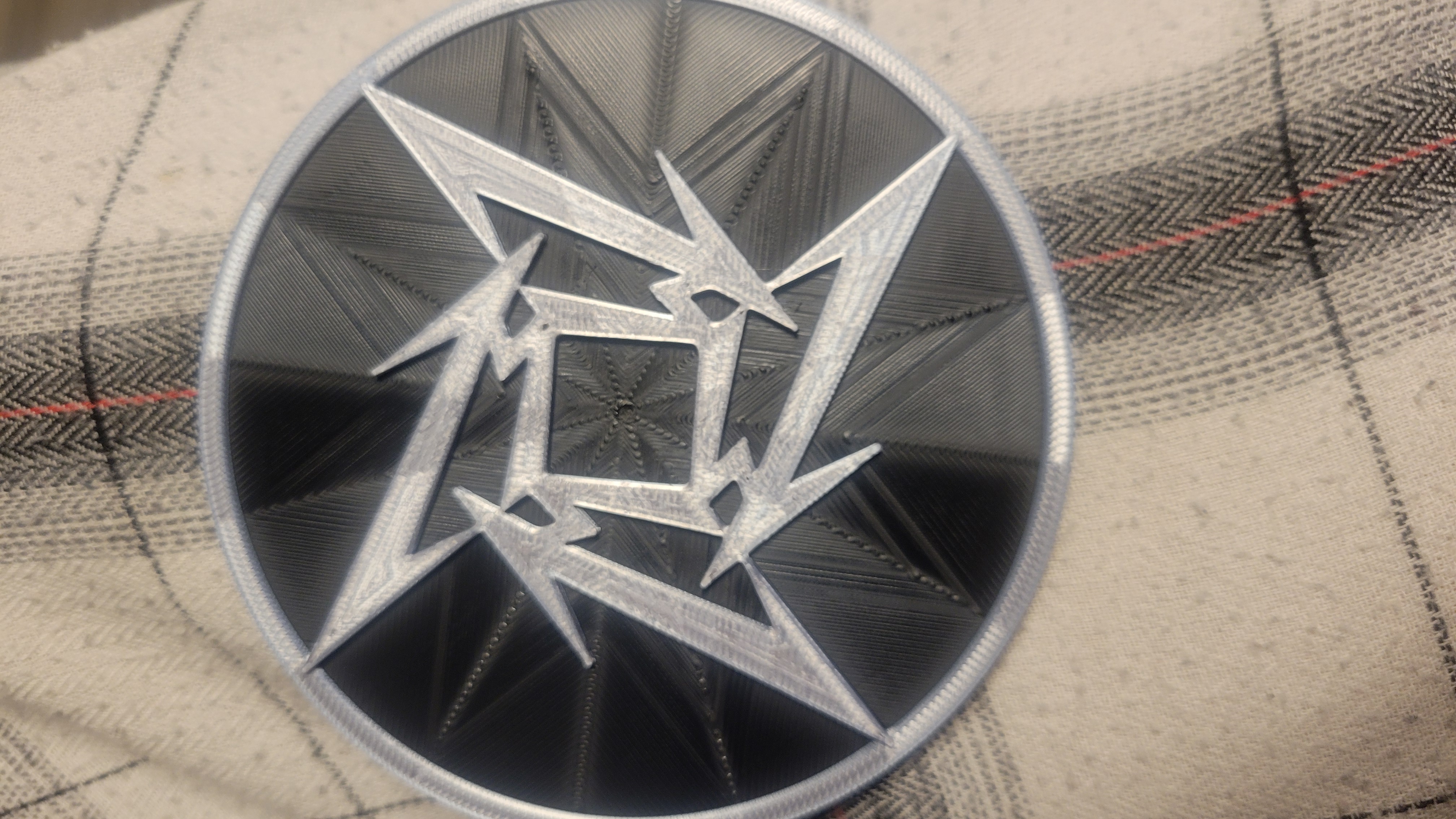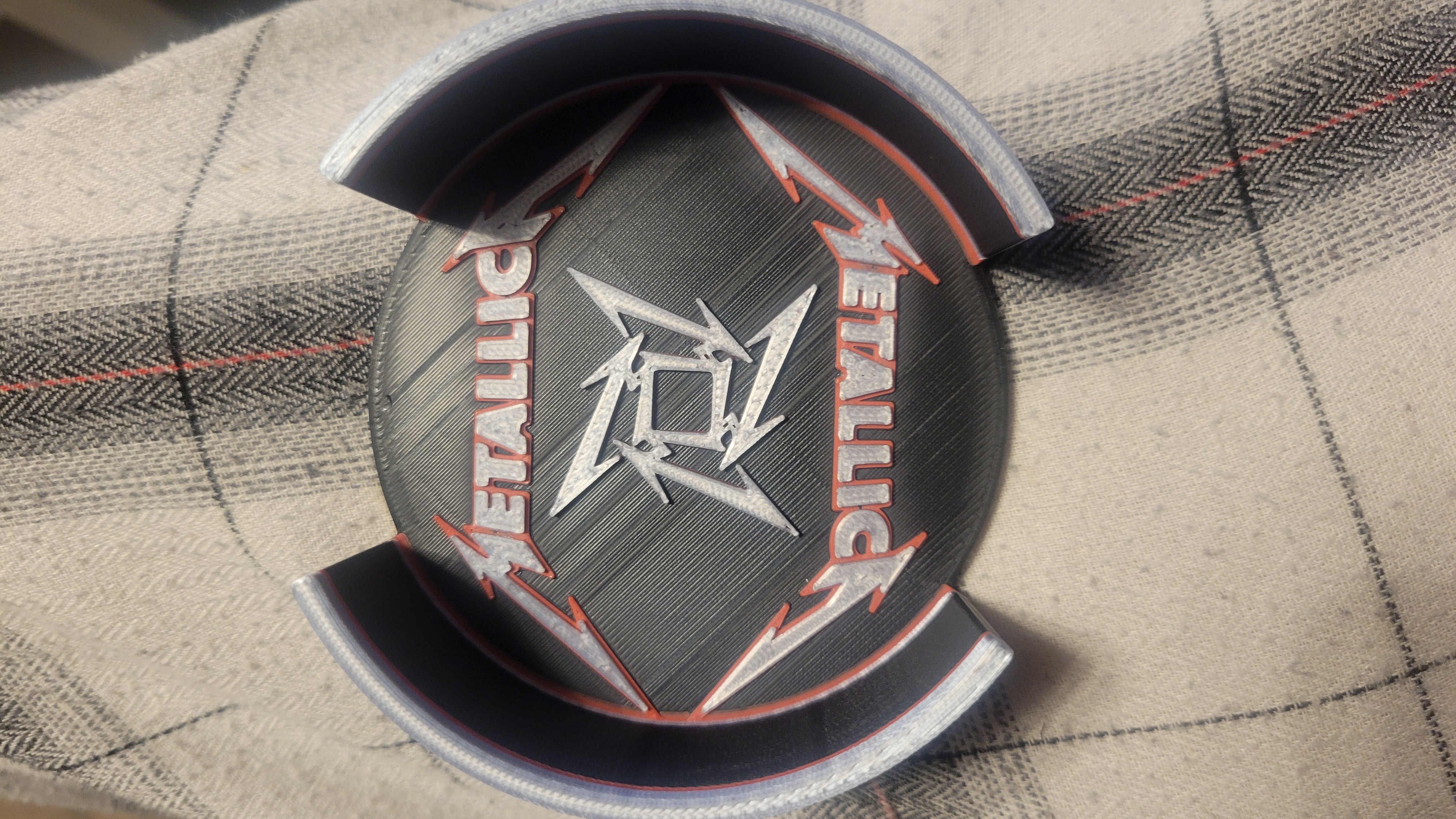 Bộ đế lót ly và đế giữ hình Metallica. Đế giữ này có thể chứa các đế lót ly có đường kính 100mm. In ở độ cao lớp 0.12mm với lưới gyroid và họa tiết bề mặt xoắn ốc octogram để tăng thêm vẻ đẹp cho logo.