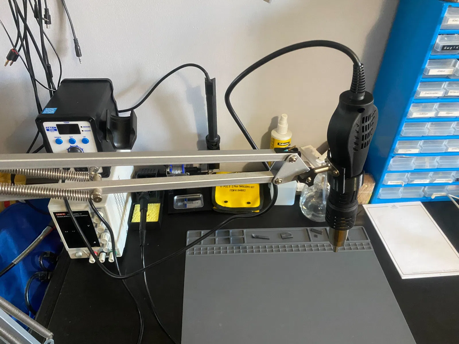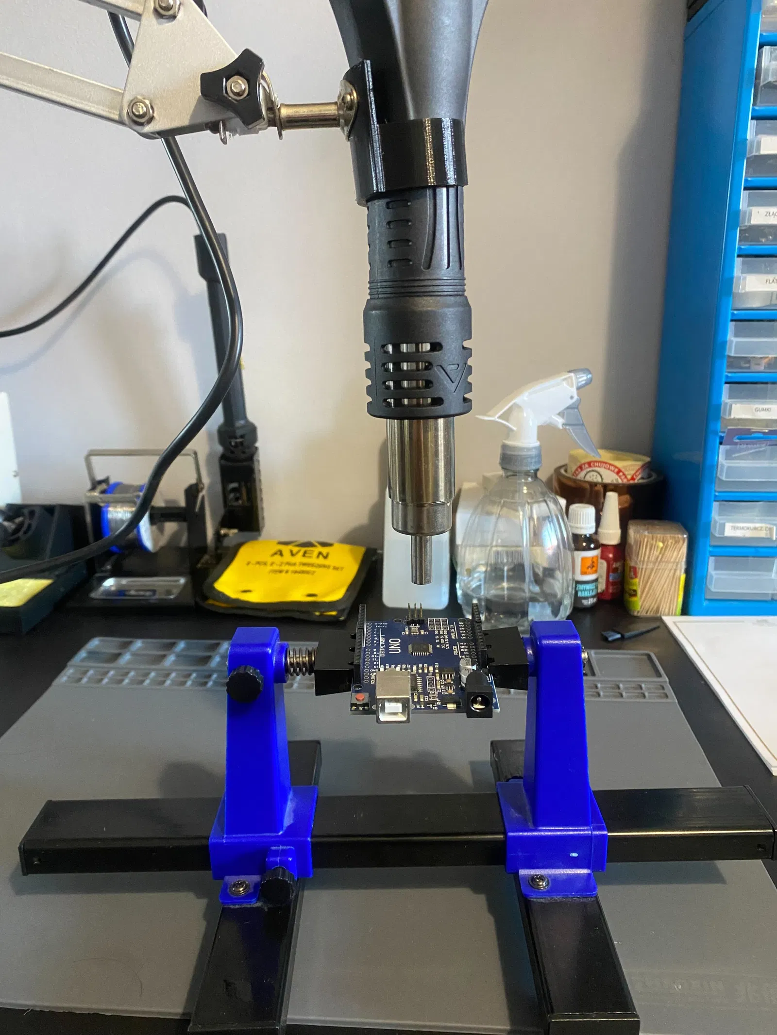 Giá đỡ có vít để gắn súng hơi nóng vào cuối cần đèn Ikea Tertial, không cần thêm phụ kiện - tái sử dụng ốc vít cũ. In bằng PETG, mật độ ruột >15%, chiều cao lớp 0.2, không cần đế đỡ. Tháo rời đèn, gỡ dây nguồn, rồi dùng ốc vít nguyên bản để gắn giá đỡ. Thử nghiệm với Atten 8586 (đường kính trong 34mm).