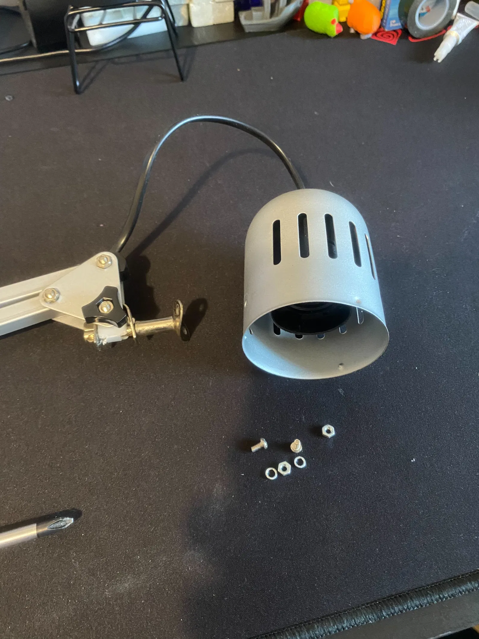 Giá đỡ có vít để gắn súng hơi nóng vào cuối cần đèn Ikea Tertial, không cần thêm phụ kiện - tái sử dụng ốc vít cũ.
