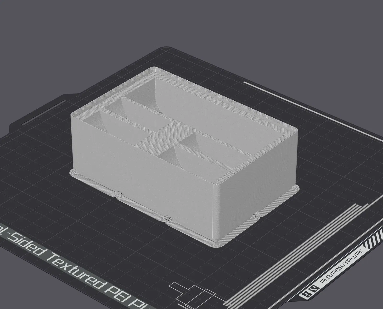 Một thùng gridfinity 2x3 cho máy in nhãn D110 Niimbot và 3 cuộn nhãn bổ sung. Mô hình gốc có 3 khe cho nhãn và bị lệch theo một cách kỳ lạ (không được căn giữa).