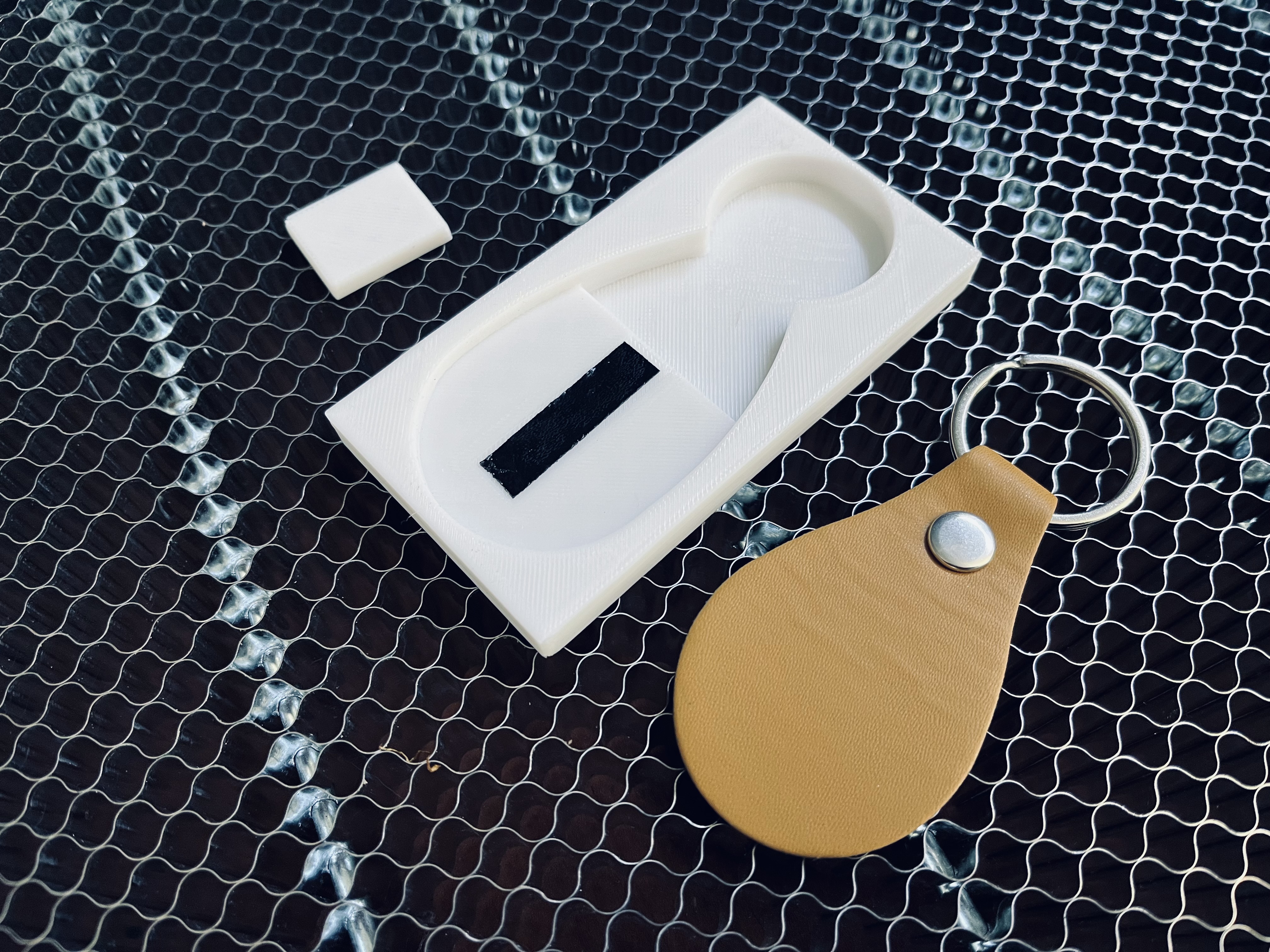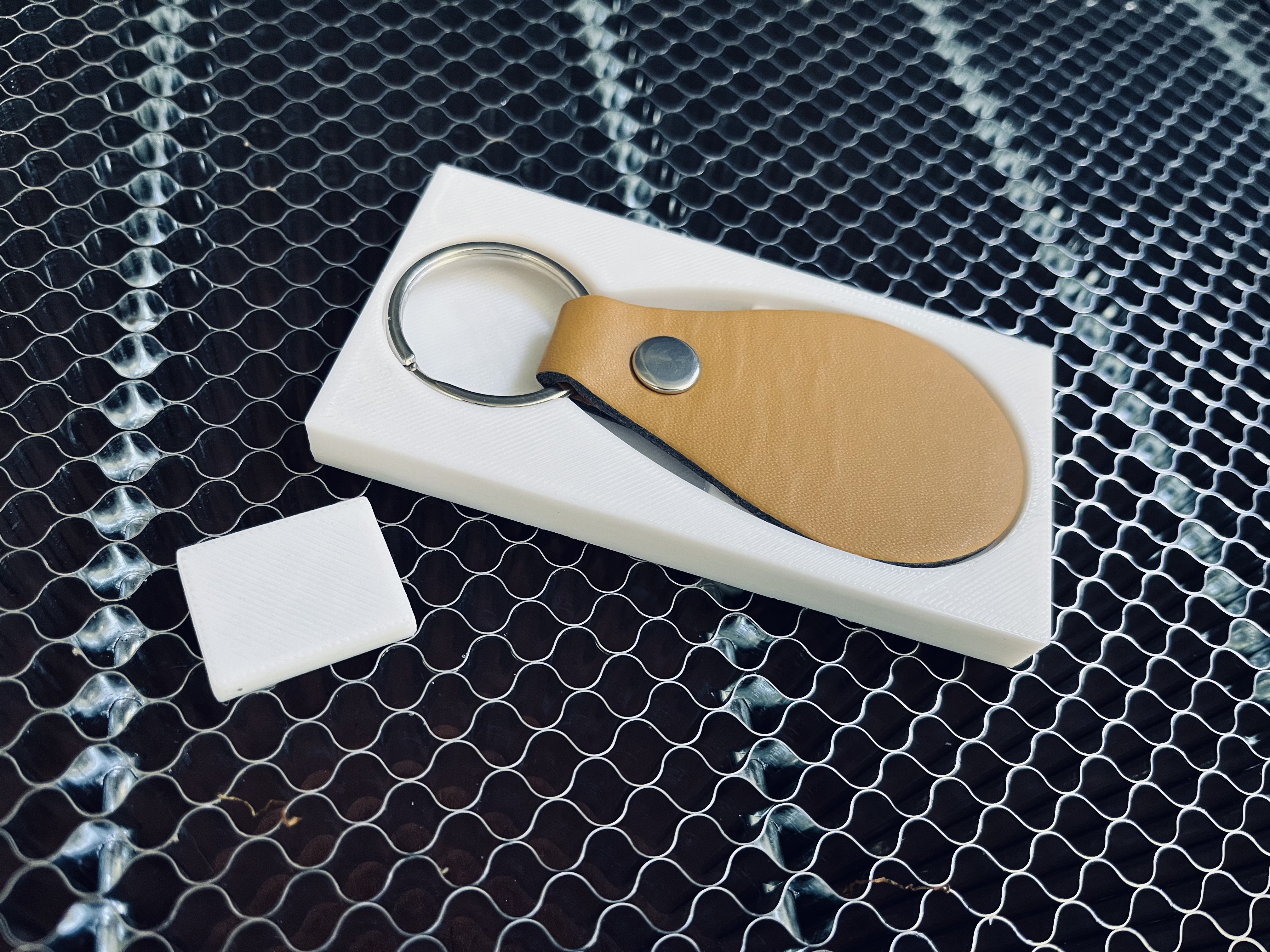 Mảnh vuông tích hợp trong bộ dẫn hướng là rất quan trọng để khắc mặt sau của móc khóa, đảm bảo vị trí hoàn toàn phẳng để khắc chất lượng cao. Ngoài ra, có một rãnh trong bộ hỗ trợ để thêm băng dính hai mặt, giữ cố định móc khóa trong quá trình khắc.