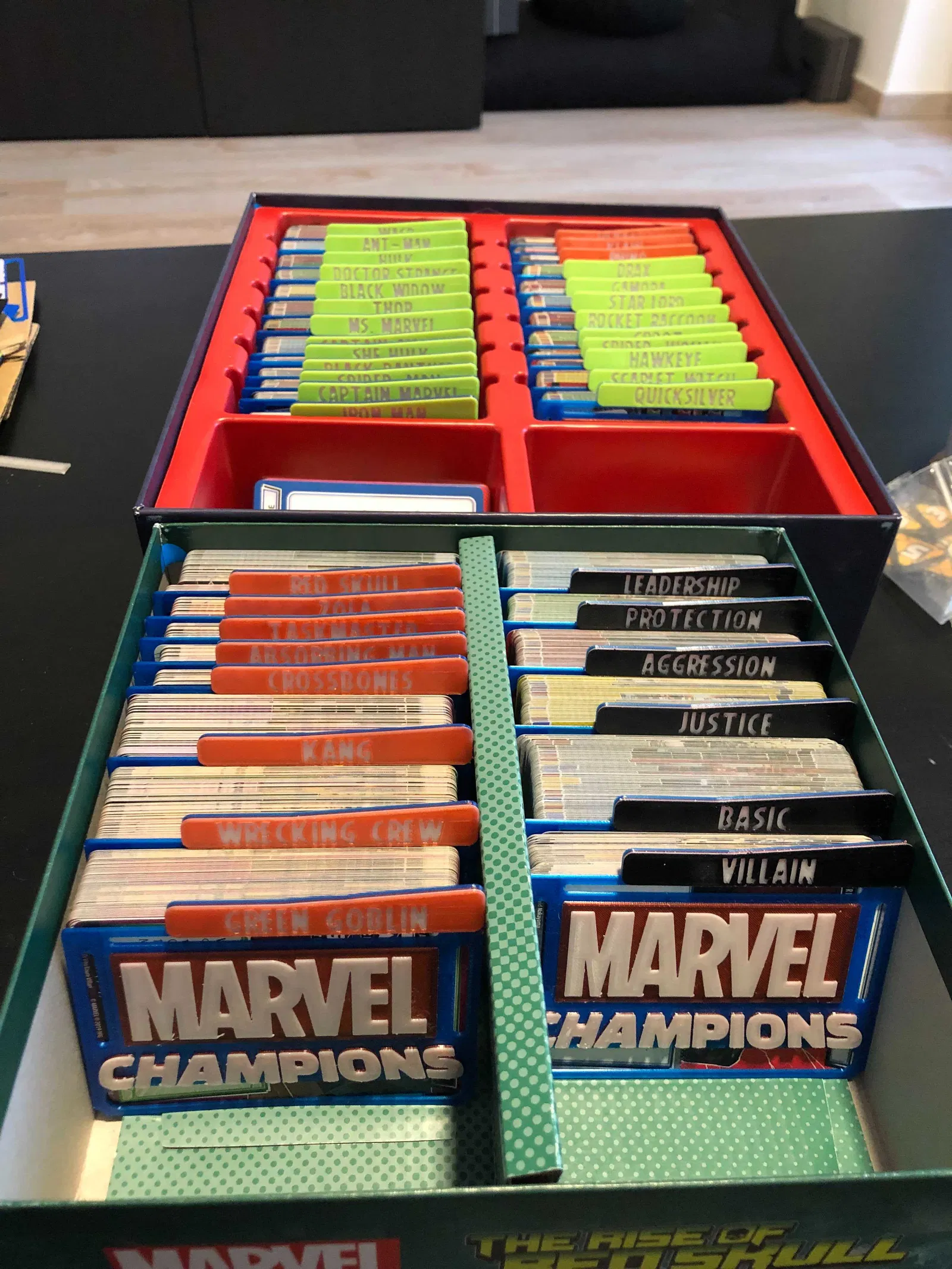 Vách ngăn Marvel Champions in 4 màu, vừa khít hộp game. Dùng để sắp xếp các nhân vật và phe trong game thẻ bài Marvel Champions. Có vách ngăn cho mọi nhân vật và phe phái. Nhắn tui nếu cần thêm nhân vật nha!