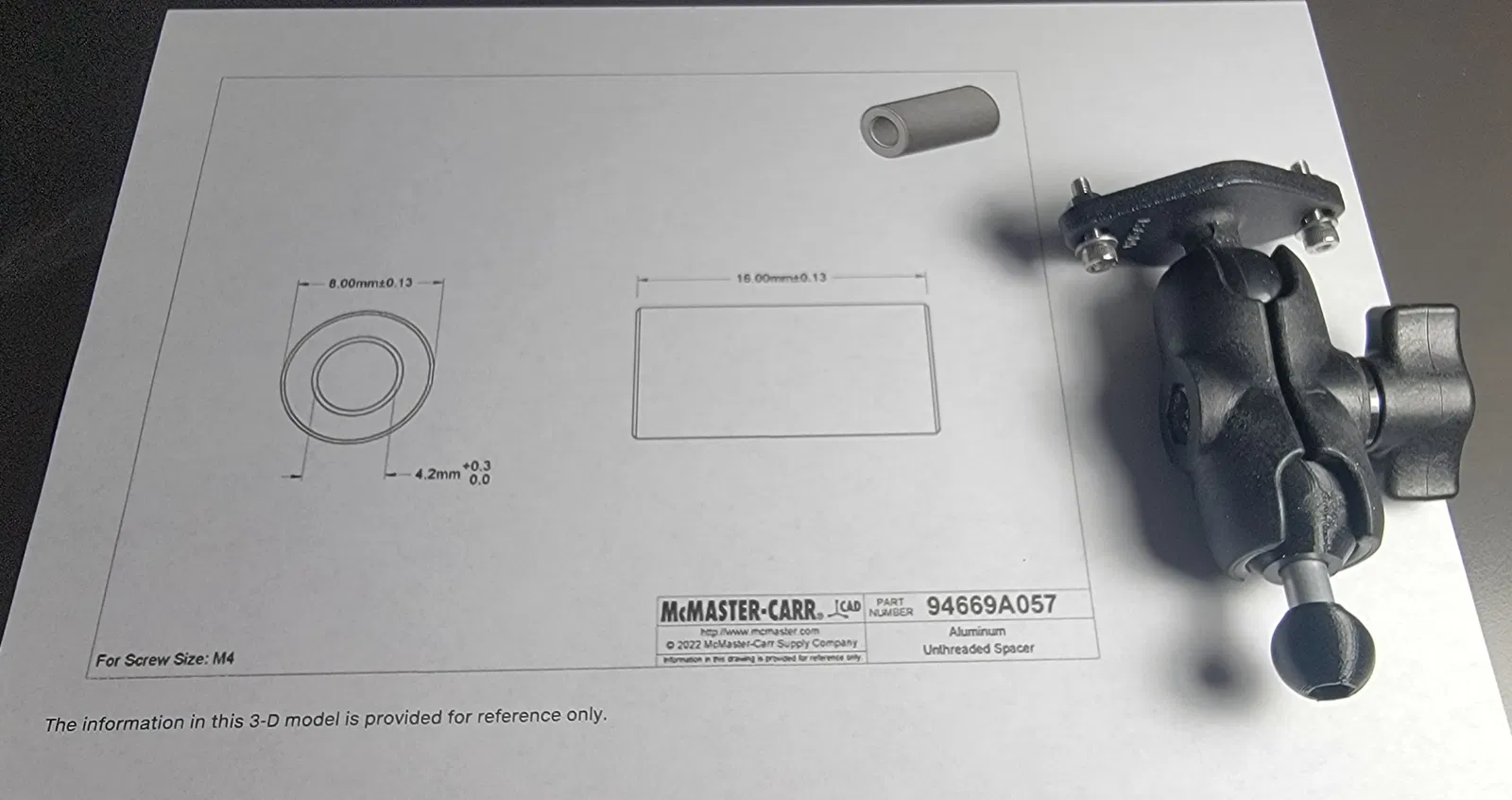 Đây là một adapter hệ thống mount Ram dạng module để gắn các loại kẹp điện thoại phổ biến trên thị trường như Amazon. Một bên là bi 1" và bên kia là bi 17MM. Cái kẹp điện thoại sạc không dây của tui có sẵn bộ phận nhận, chứ không phải dạng bi, nên đây là giải pháp cho vấn đề đó. Vì tui nghĩ phần thân sẽ yếu nếu in 3D. Tui dùng một miếng đệm nhôm từ McMaster-Carr cùng với ốc và đai ốc để làm cho nó chắc chắn hơn nhiều. Thiết kế này sẽ hoạt động với các kích cỡ bi khác, nhưng tui chỉ làm những cái phù hợp với trường hợp của tui thôi. Tui đề xuất dùng PETG vì khả năng chịu nhiệt của nó.