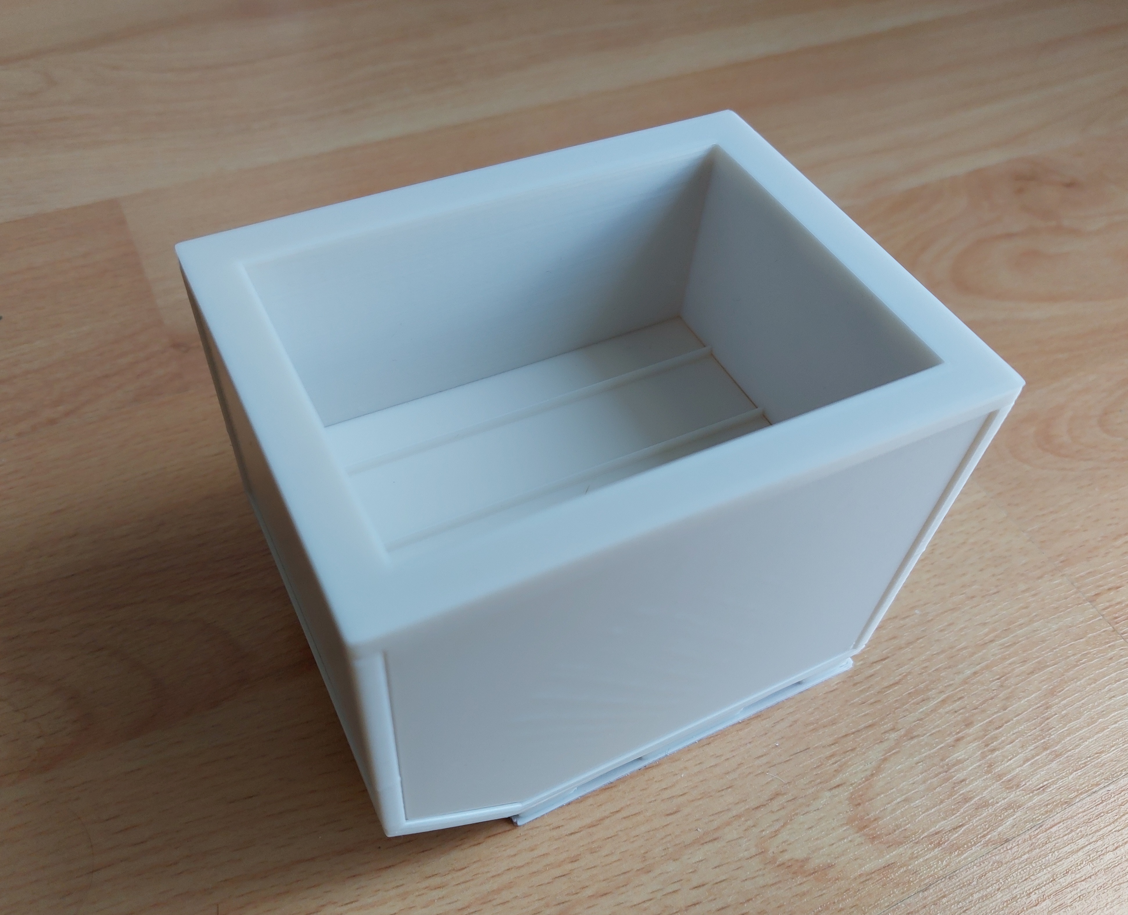 - In bằng PETG mà không có vỏ bọc gây cong vênh nghiêm trọng phần đế, khiến các cạnh không trượt xuống hết (~0,5mm khe hở ở giữa). Hoạt động khi in Đế và Nắp ở tốc độ 50%.