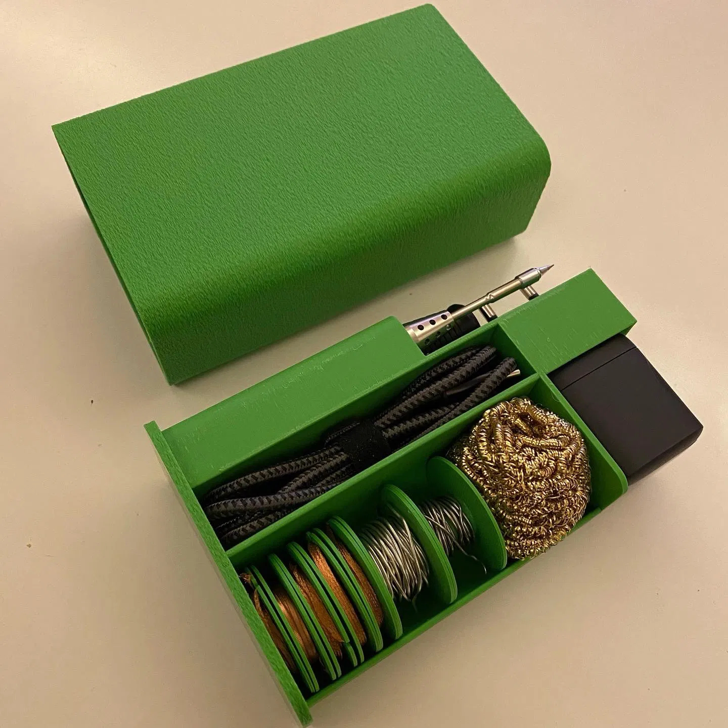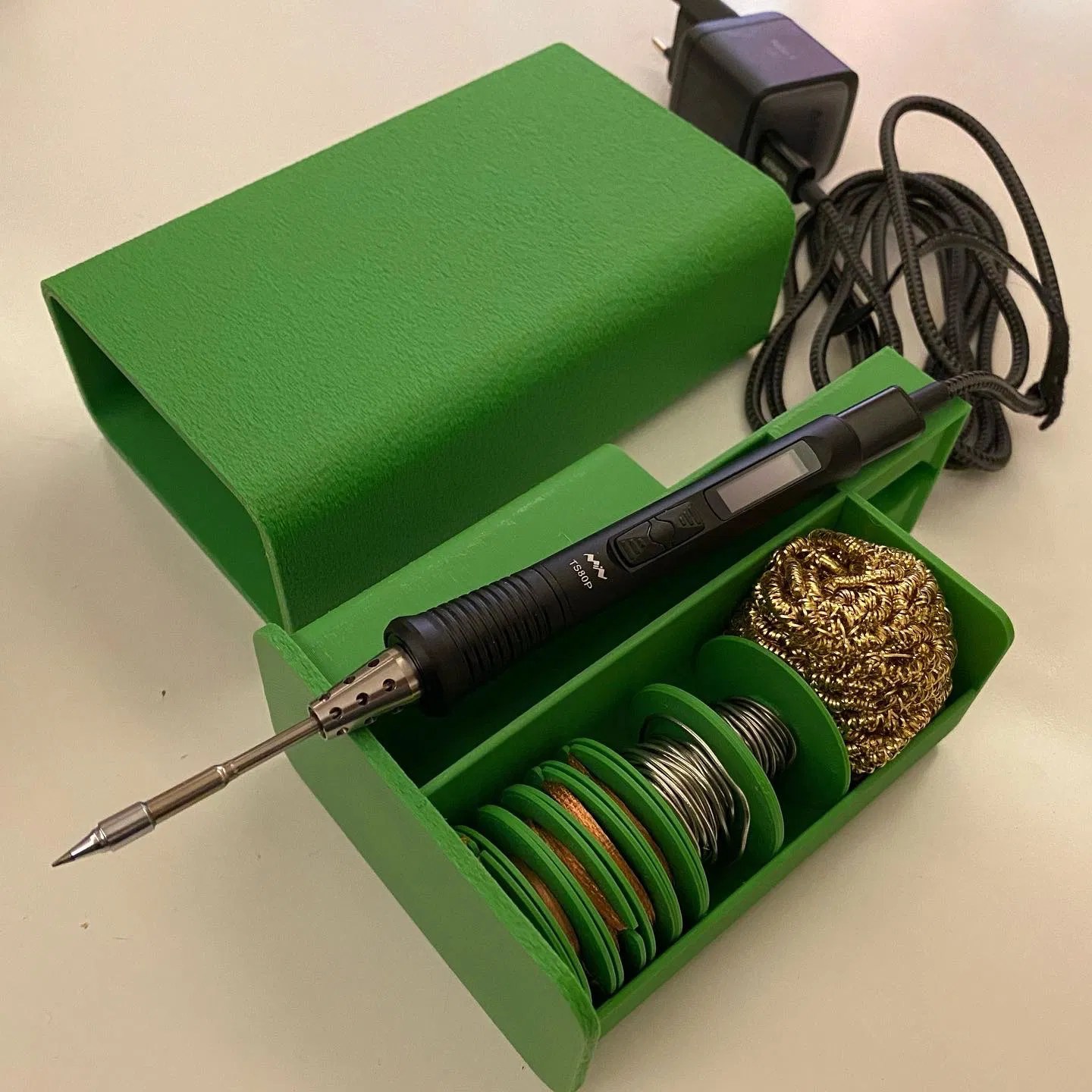 Hộp đựng Mỏ hàn TS80P (kèm 2 mũi hàn), adapter USB, dây cáp, dây thiếc,... Chế tạo từ PLA, định dạng STL. Cần keo dán và có thể thêm nam châm để giữ nắp.