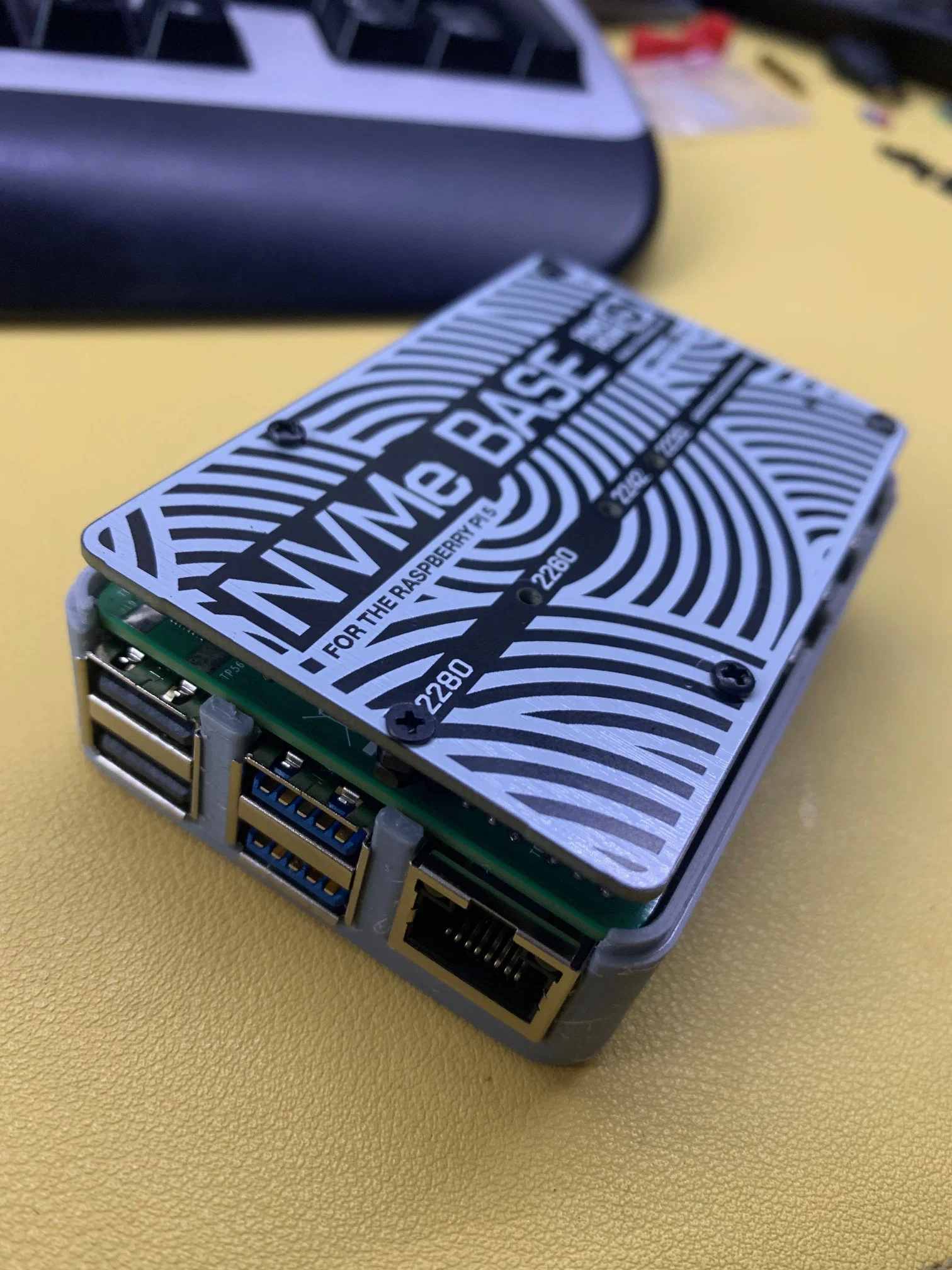 Chiếc vỏ ban đầu được thiết kế để sử dụng với bo mạch Pimoroni NVMe SSD Base, được gắn bên dưới Pi. Tôi đã sử dụng trụ đỡ M2.5 dài 5mm để gắn Pi vào các vấu lắp (sau khi đã tạo ren cho các lỗ M2.5) sau đó gắn bo mạch NVMe Base lên các trụ đỡ thông qua các lỗ trên đế vỏ.