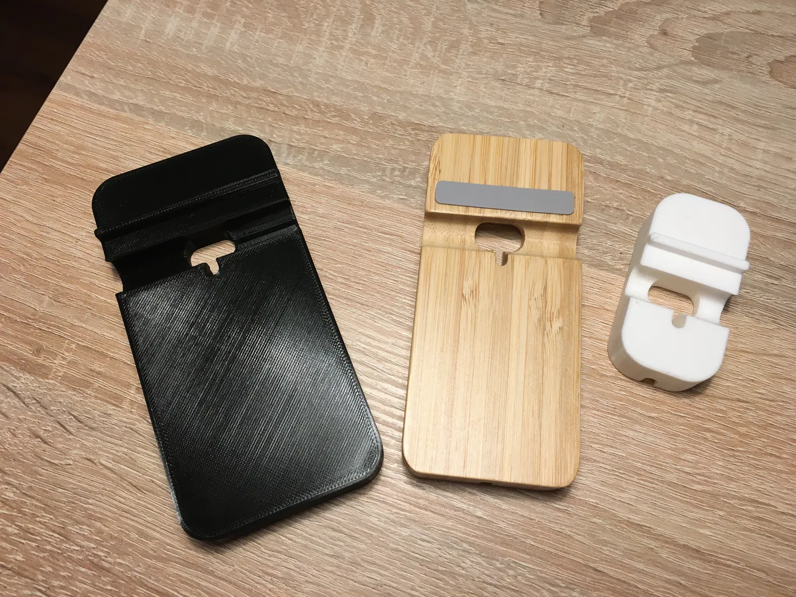 Cái bình thường (màu đen trên ảnh) hiện đang được cấu hình theo tham số trong f3d. Bản màu trắng là bản extrasmall. Bản nhỏ này quá nhỏ để giữ điện thoại an toàn, nhưng có thể dùng được nếu ai đó dán keo để cố định nó lên bàn.