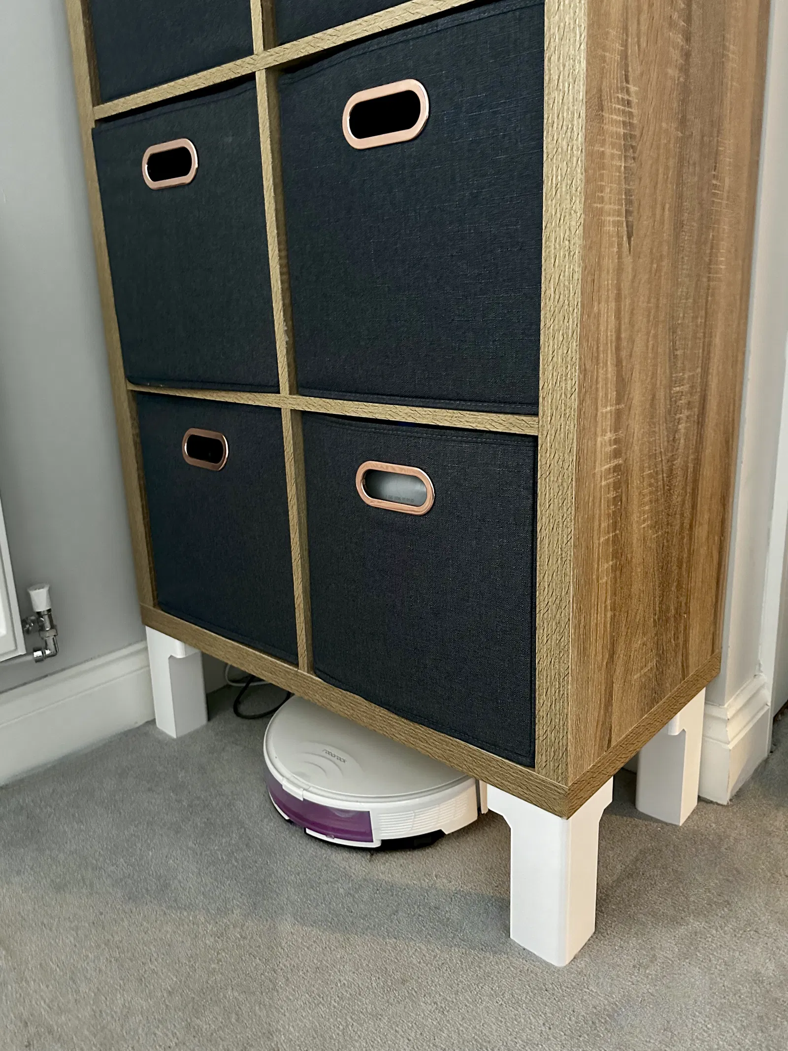 Mẫu này được thiết kế để nâng chiều cao của tủ kiểu Kallax lên 18cm, tạo khoảng trống cho robot hút bụi và đế sạc đặt gọn gàng bên dưới.