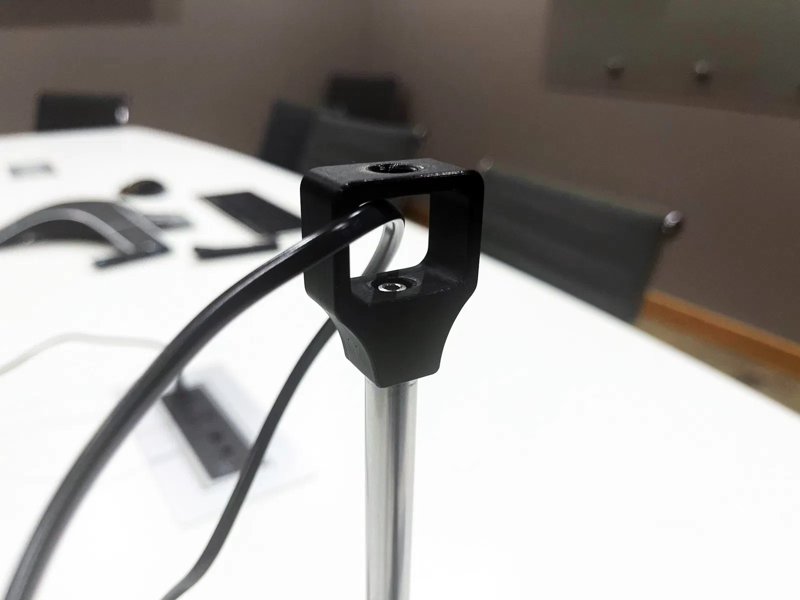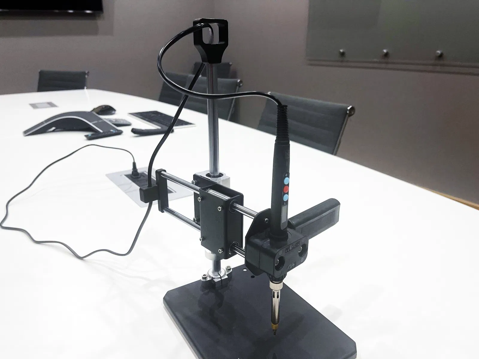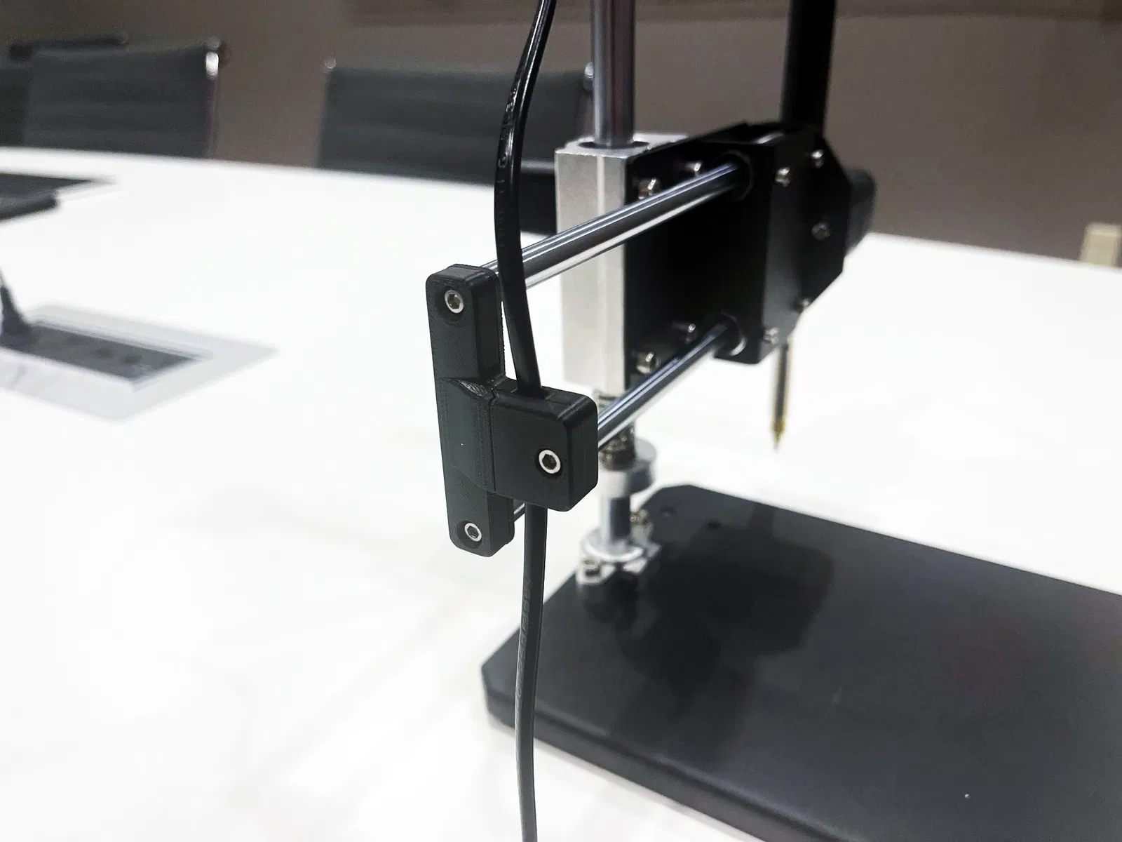 Tôi nhận thấy khi sử dụng máy, dây điện đôi khi lại tiến lại gần đầu hàn của mỏ hàn một cách không thoải mái. Tôi muốn có một cách để giữ dây cáp an toàn ra khỏi đường đi mà không cản trở phạm vi chuyển động của công cụ. Tôi đã thiết kế thêm phụ kiện đơn giản này và nó hoạt động rất tốt.
