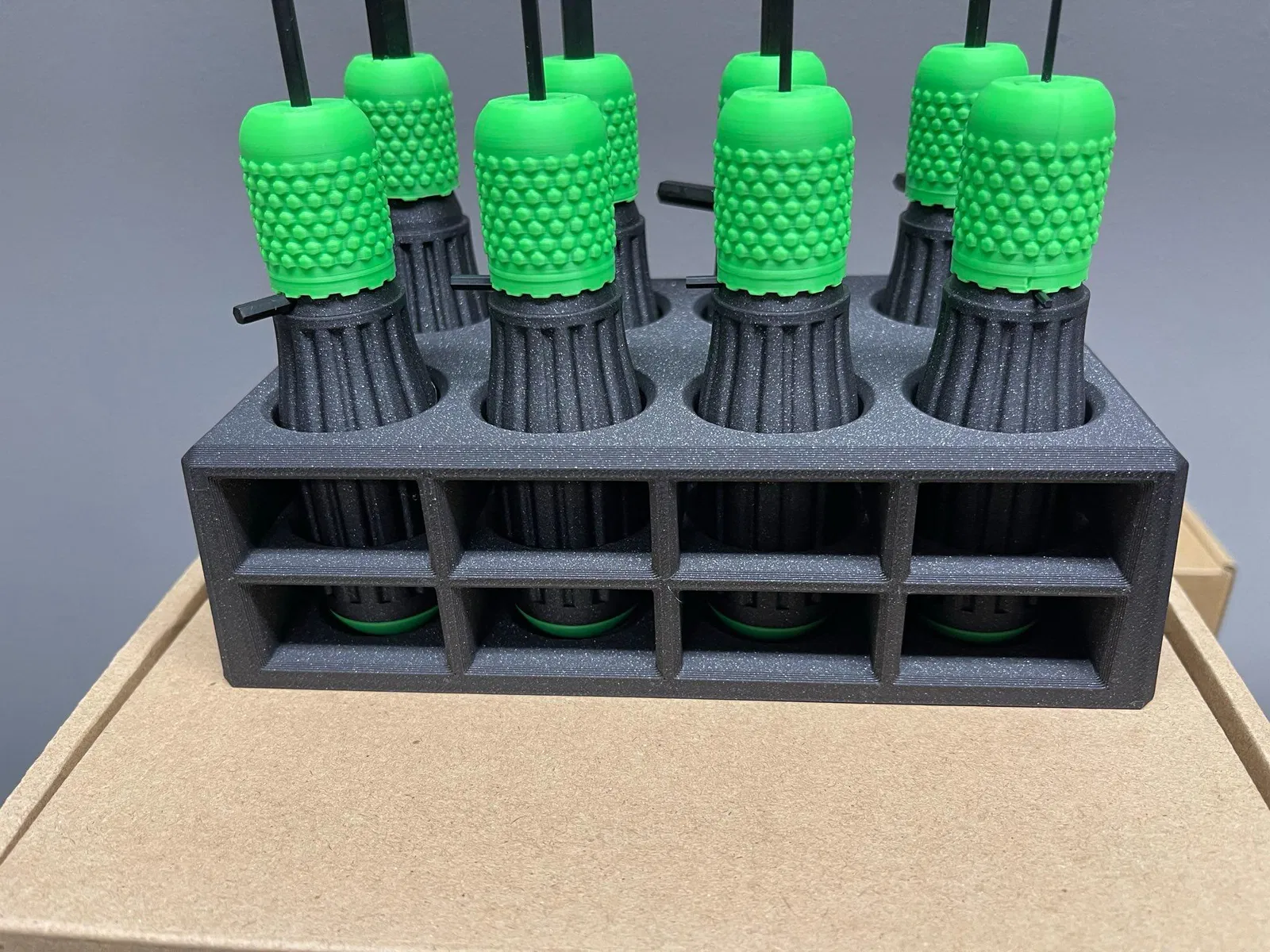 Cái đế này là để giữ bộ lục giác của @OlleMark! (/3d-model/tay-cam-luc-giac). Tôi thấy có mấy loại đế giữ được 5, 6 & 10 cái, nhưng không có loại nào vừa đúng 8 kích cỡ mà @OlleMark đã tạo ra. Hơn nữa, khi kích thước lục giác trên 4mm thì chúng trở nên rất dài. Hầu hết các đế hiện có đều giữ các chìa khóa hướng xuống dưới. Điều này có nghĩa là để giữ một chiếc lục giác 8mm, đế sẽ phải rất lớn! Vì vậy, thay vào đó, tôi đã tự thiết kế một cái đế đơn giản để giữ chúng theo chiều tay cầm xuống dưới. Điều này không có vấn đề gì lớn vì @OlleMark đã rất thông minh khi đánh dấu kích thước chìa khóa ở đầu tay cầm! Cảm ơn @OlleMark vì điều đó! Dù sao đi nữa, đây là một bản in siêu đơn giản. Không cần hỗ trợ, bạn có thể in nó ở mặt trước hoặc mặt sau. Hy vọng nó giúp giữ mọi thứ ngăn nắp cho người khác, giống như nó làm cho tôi! Hãy chia sẻ bản in của bạn và nếu thích, hãy cho nó một ❤ LIKE!