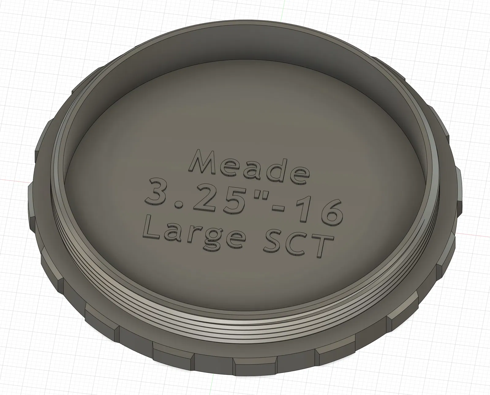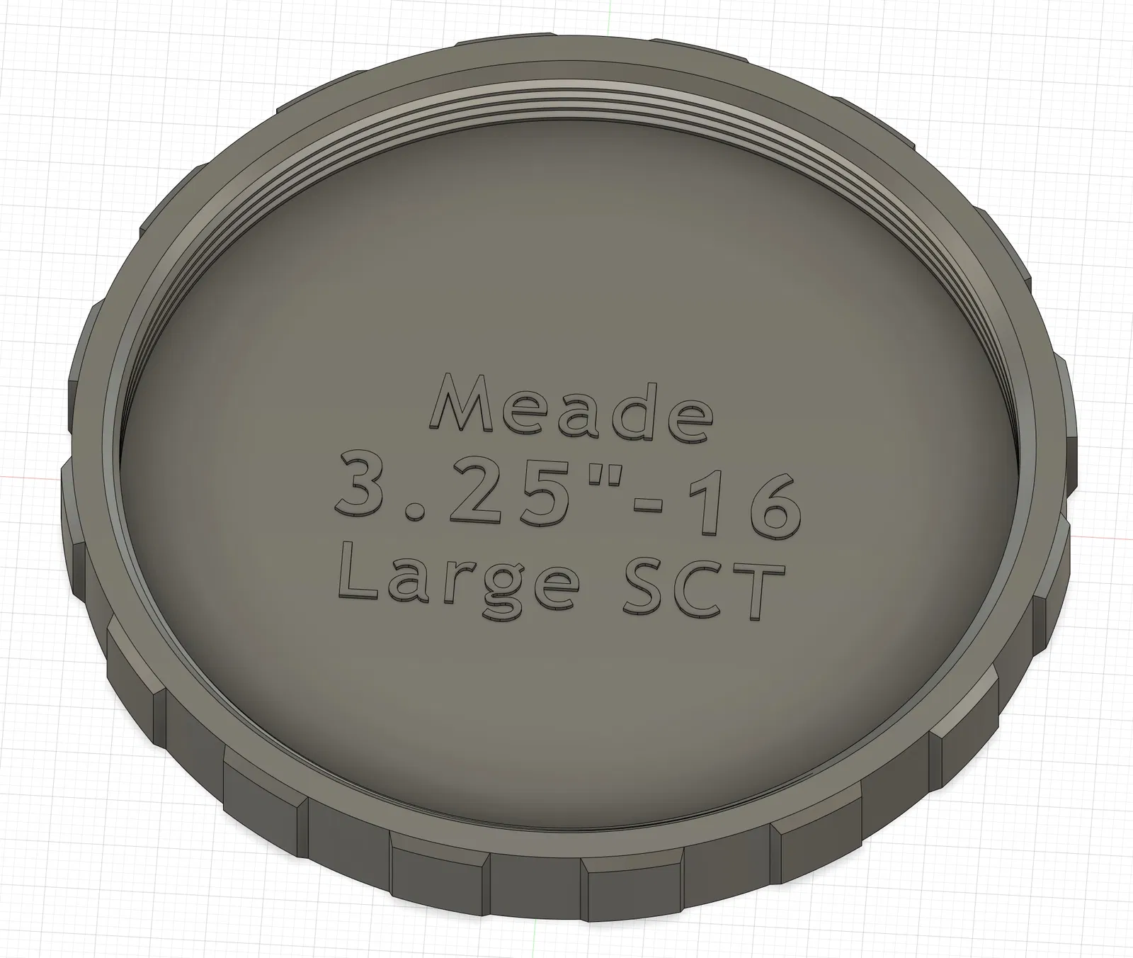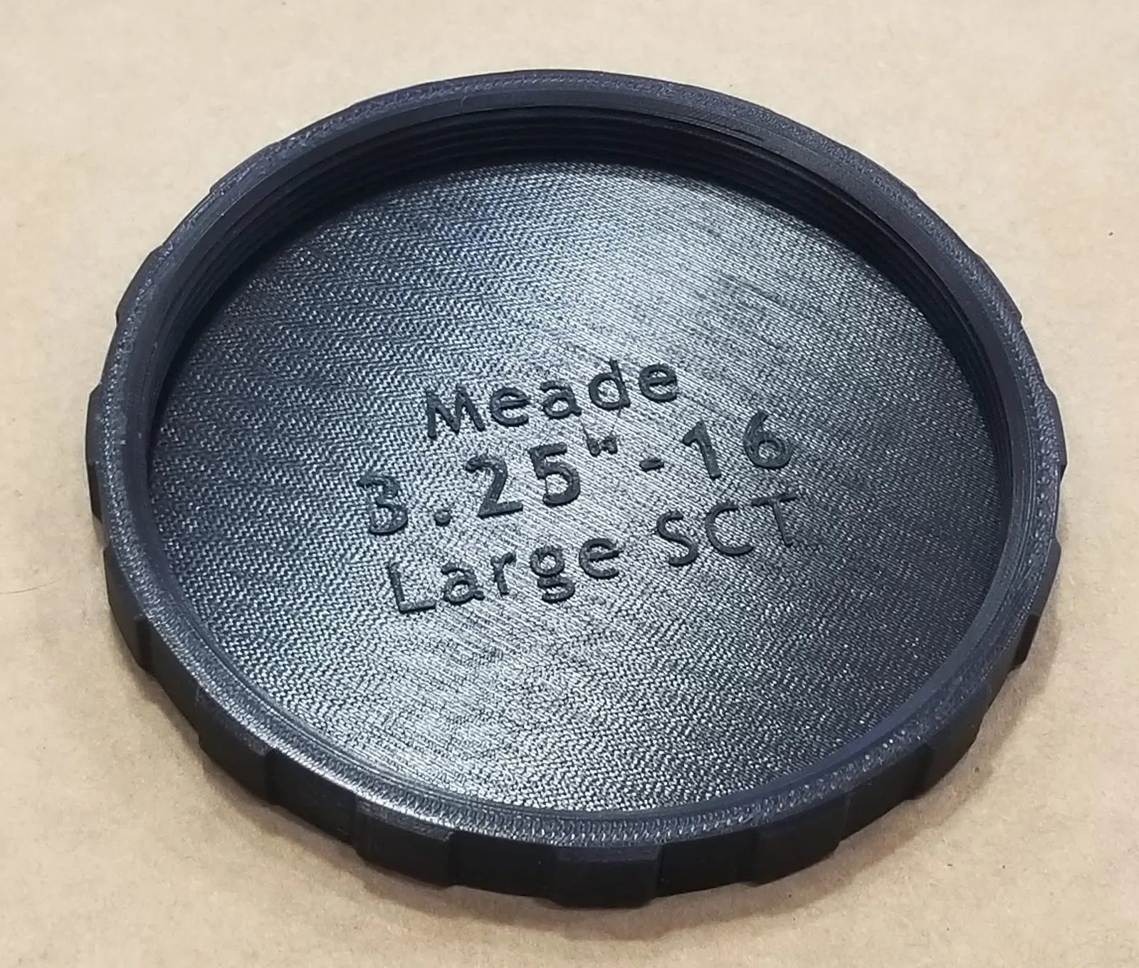 Nắp che bụi ren Meade 3.25"-16, có cả loại đực và cái, dành cho các kính thiên văn Schmidt-Cassegrain (SCT) lớn của Meade (từ 12" trở lên). Kích thước ren 3.25"-16tpi, tương tự ren Celestron. Nên in bằng PLA+ để ren khớp tốt hơn. Có thể điều chỉnh kích thước in +/- 0.5% cho vừa vặn.