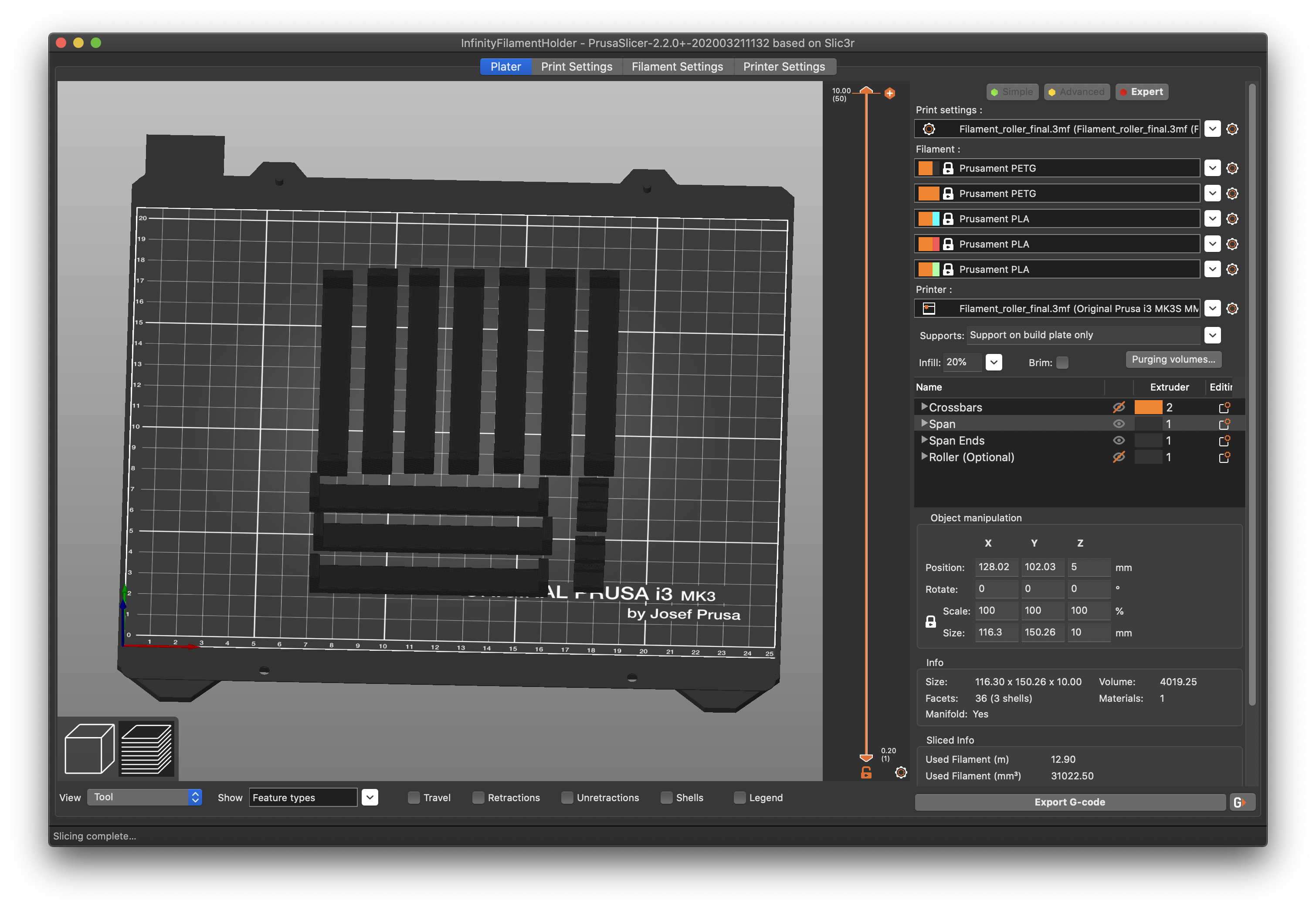 - Tệp PrusaSlicer 2.2 .3mf. với mọi thứ được thiết lập cho bộ phận 5 cuộn. Con lăn tùy chọn là loại in một lần, vì vậy hãy in hai cái cho mỗi cuộn dây filament nếu cần.