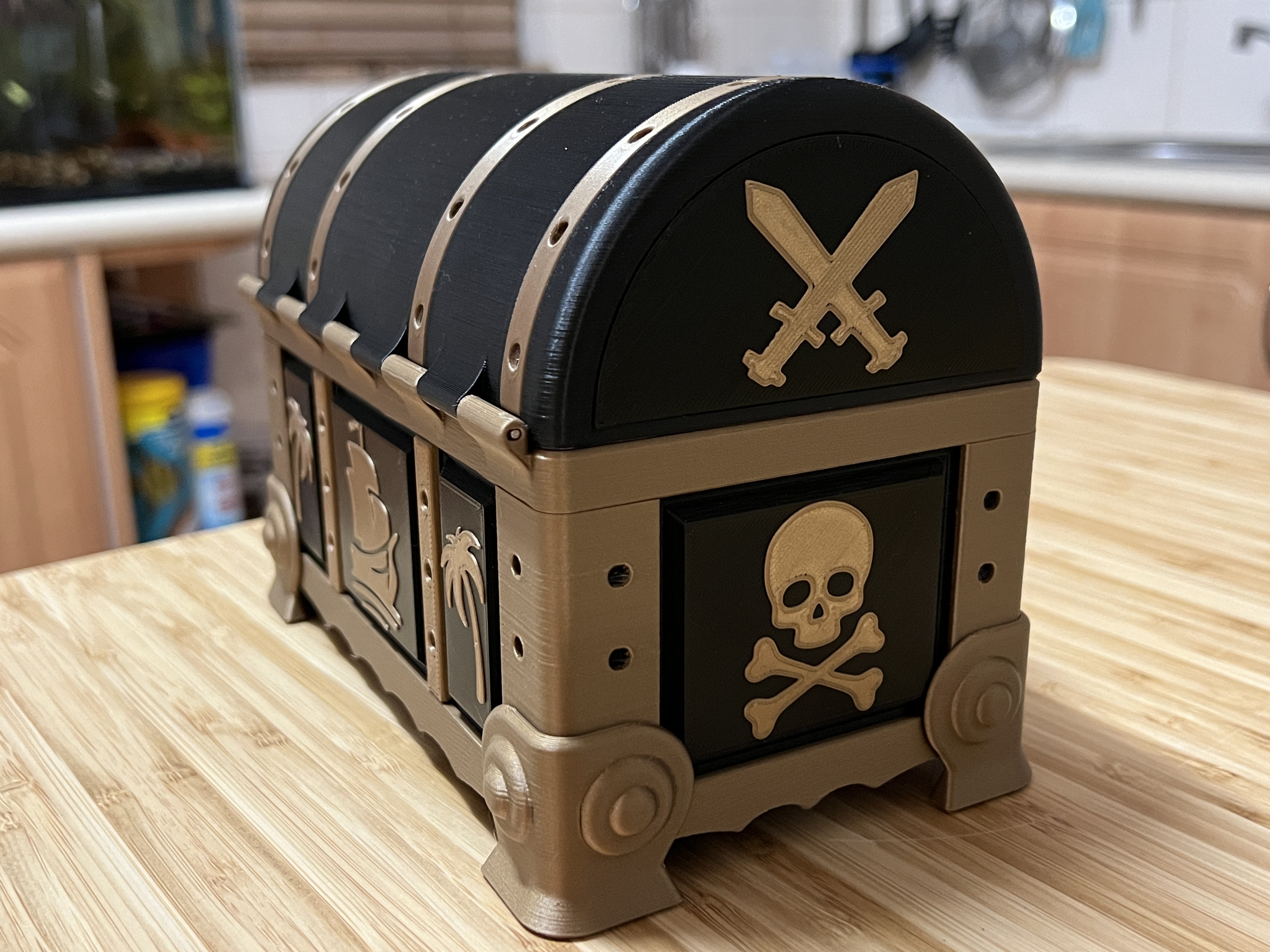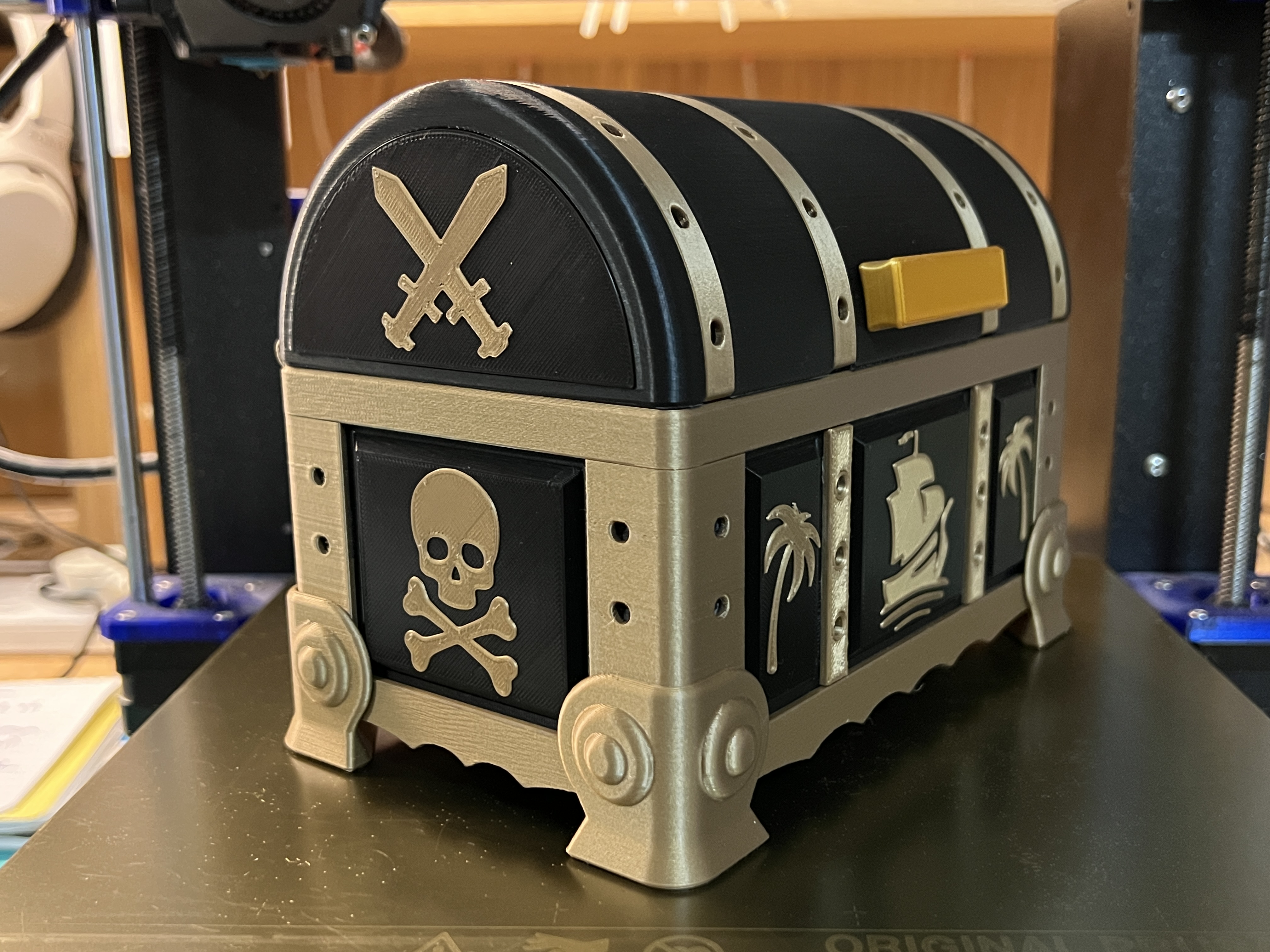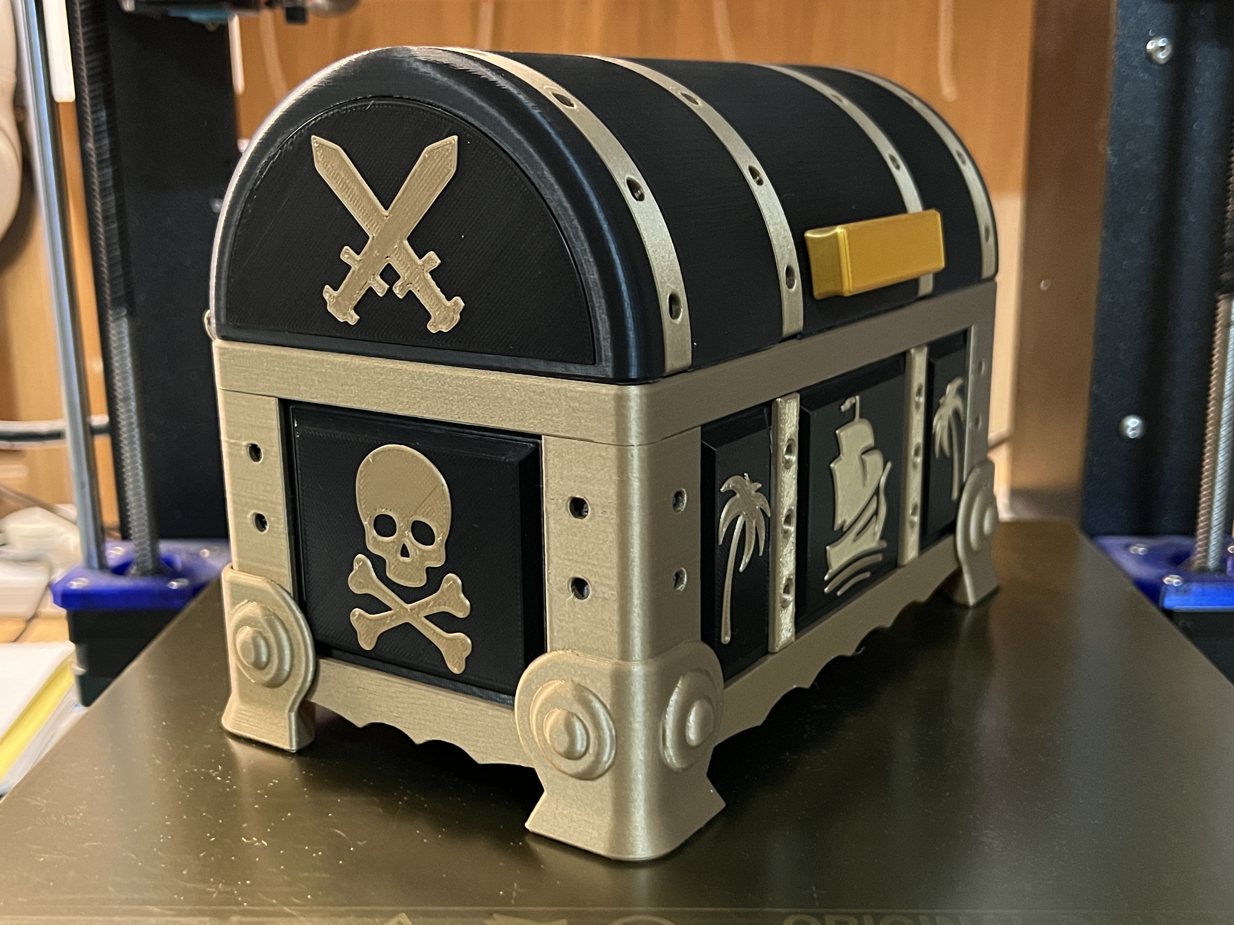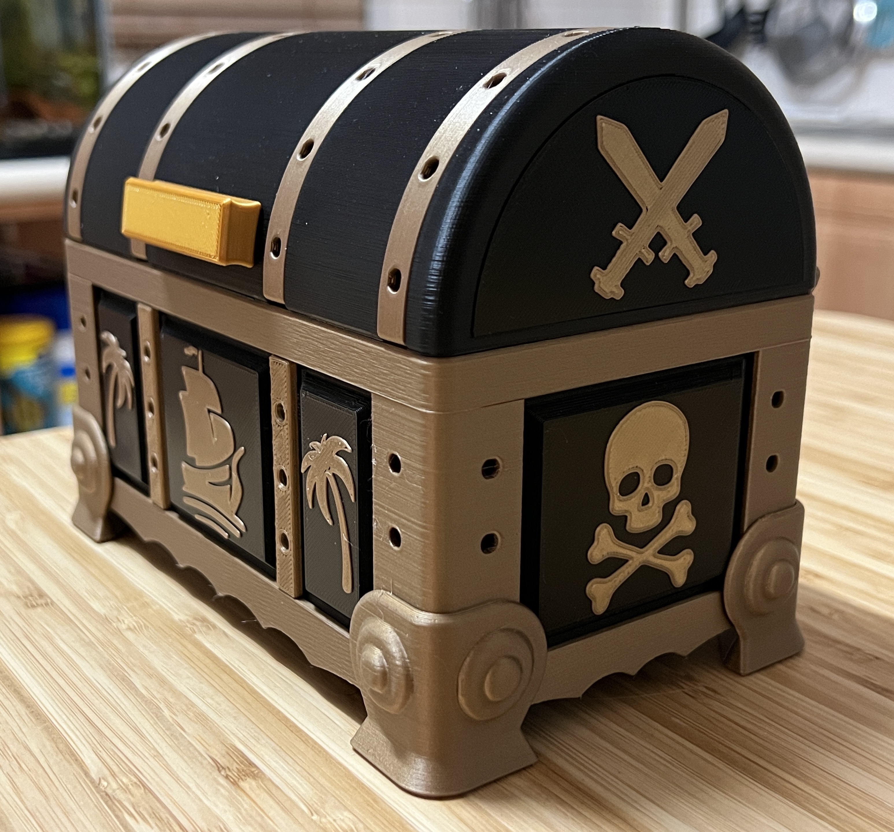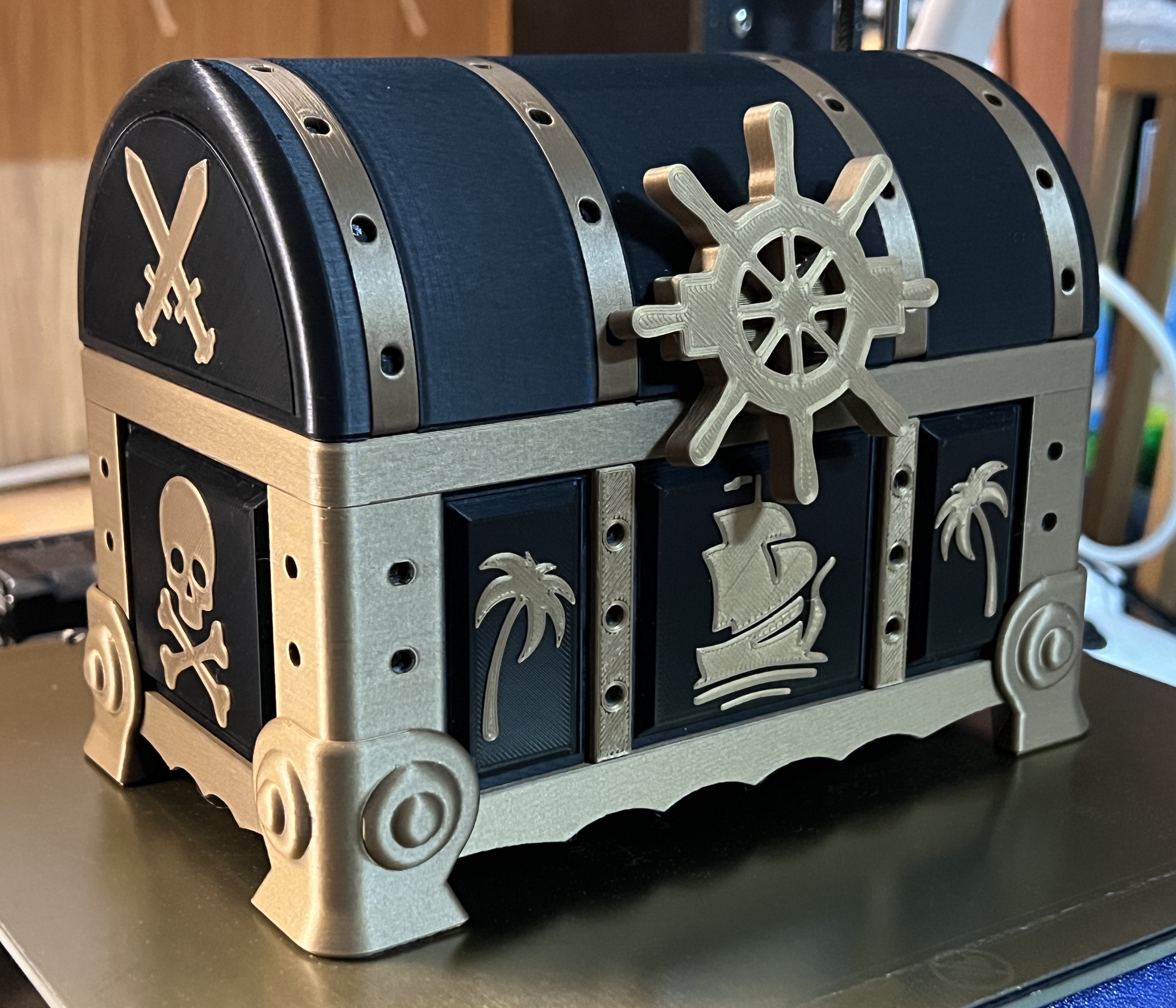 Mô hình Rương Kho Báu Cướp Biển. Cập nhật thêm tay nắm, bản lề, khóa chốt và bánh lái tàu. Kích thước ngoài 180x110x140mm. Có hướng dẫn chi tiết các bộ phận cần in, thứ tự dán keo và lưu ý khi in. Chỉ cần hỗ trợ cho phần dưới nắp.
