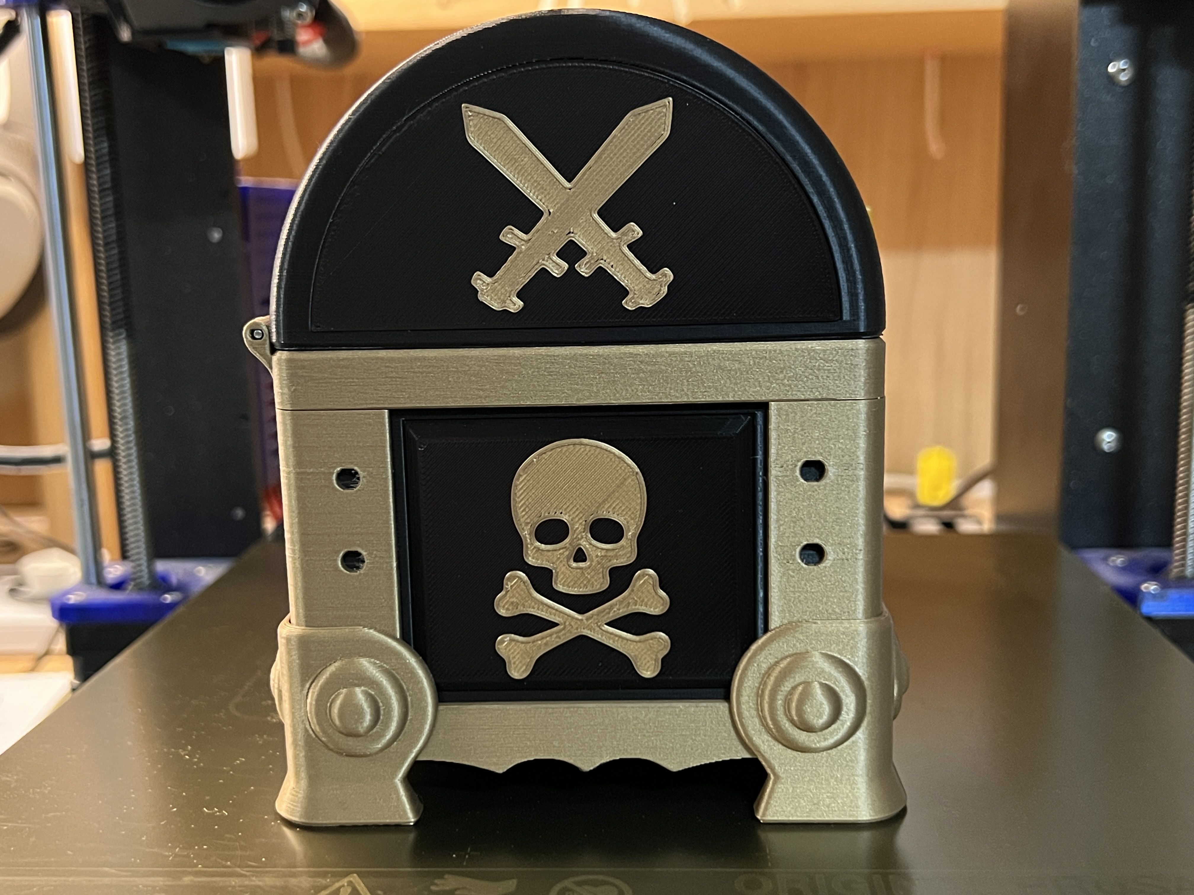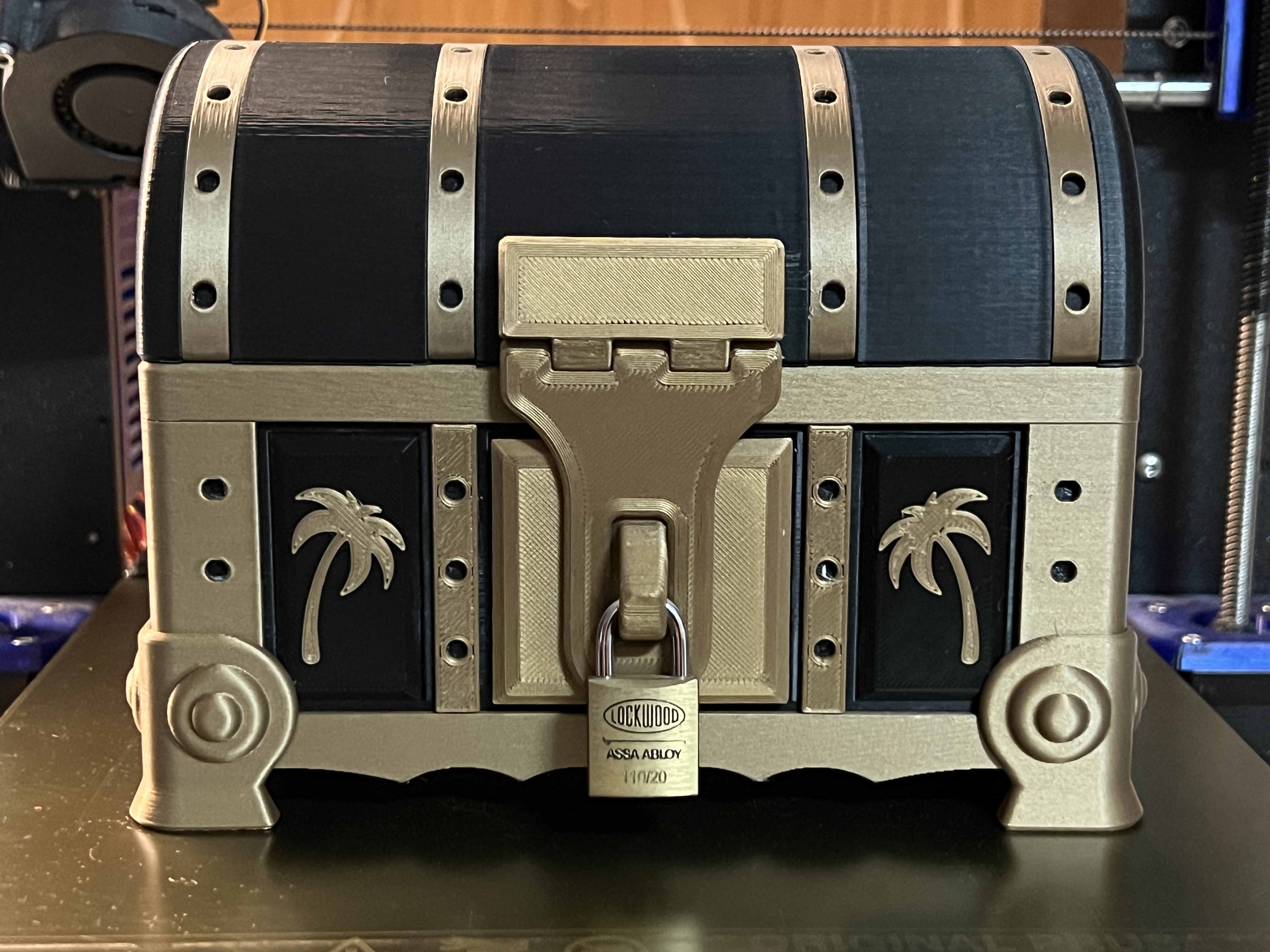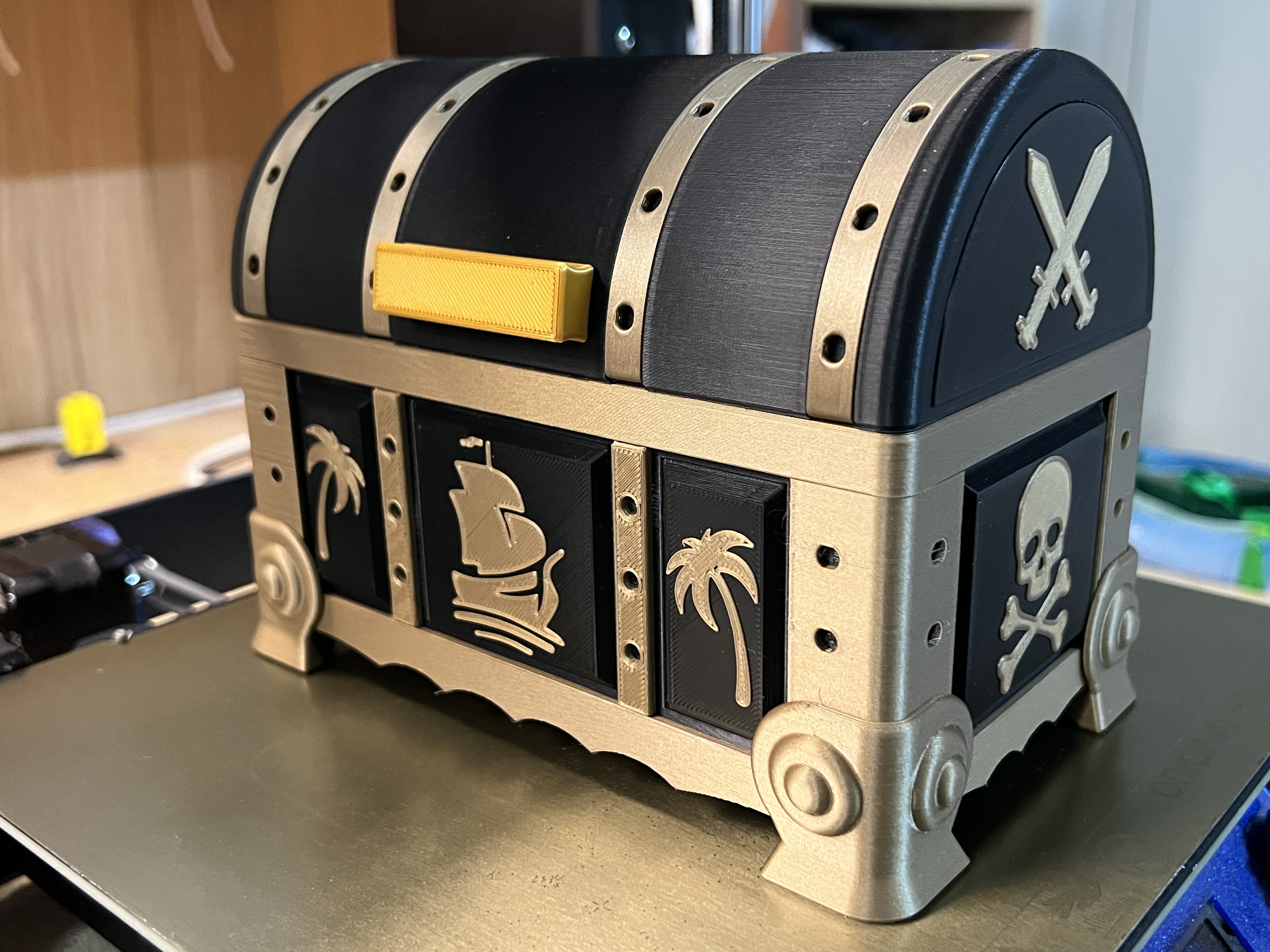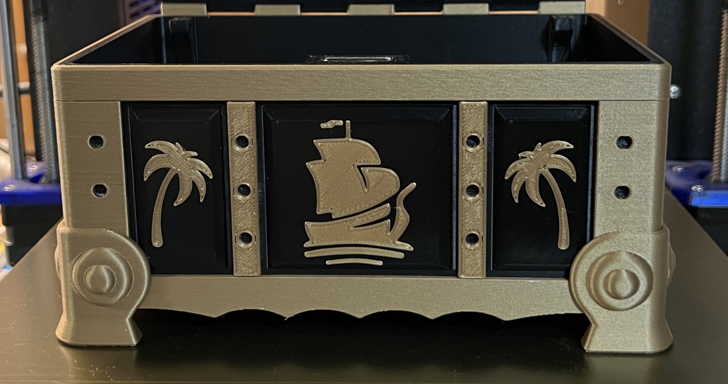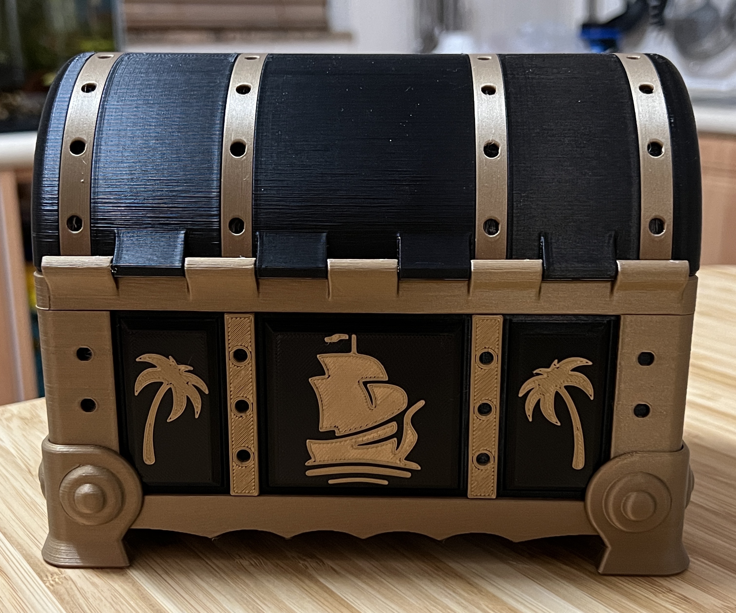 Mô hình Rương Kho Báu Cướp Biển. Cập nhật thêm tay nắm, bản lề, khóa chốt và bánh lái tàu. Kích thước ngoài 180x110x140mm. Có hướng dẫn chi tiết các bộ phận cần in, thứ tự dán keo và lưu ý khi in. Chỉ cần hỗ trợ cho phần dưới nắp.