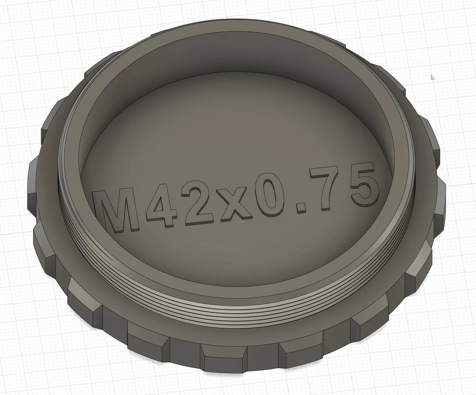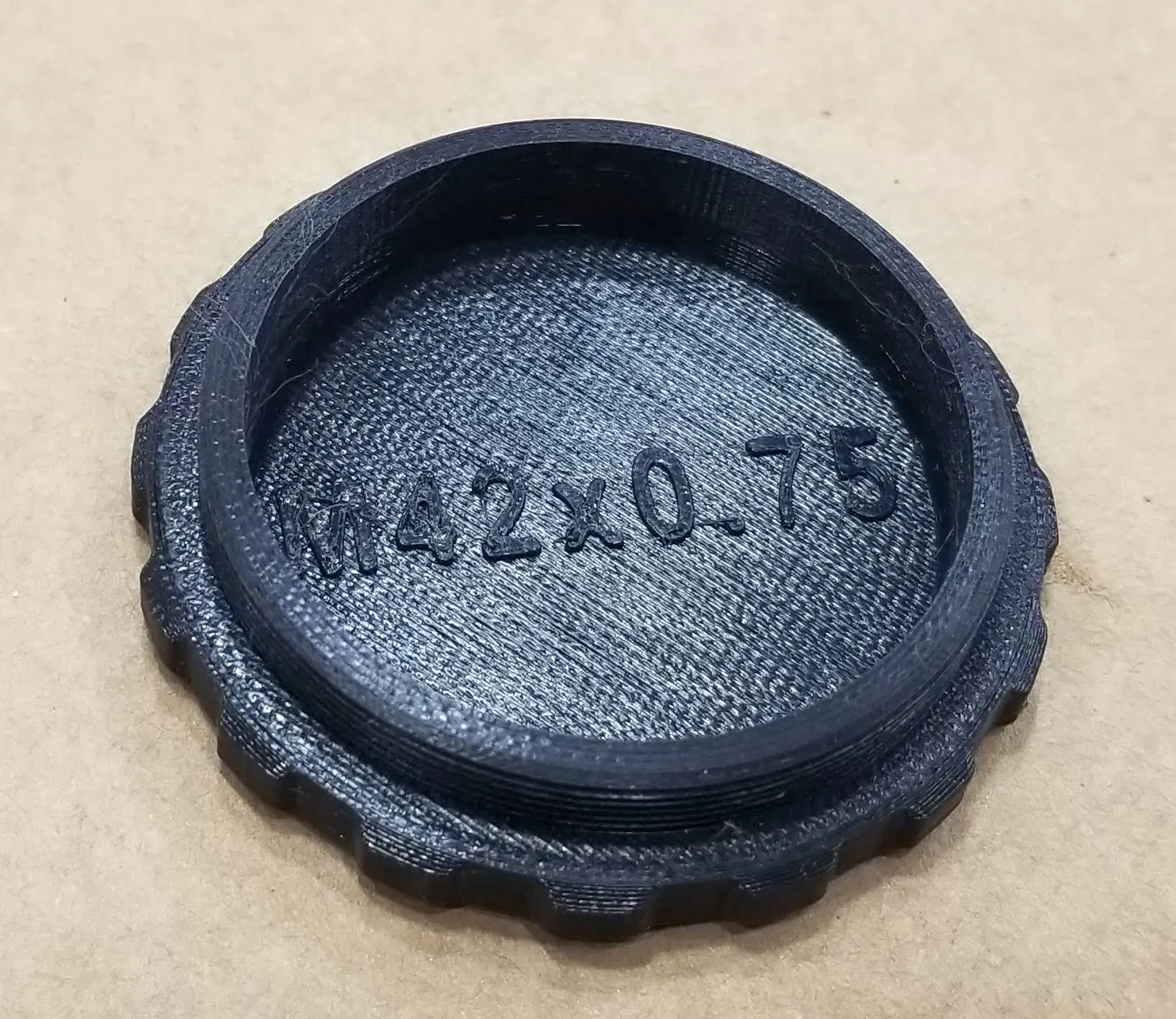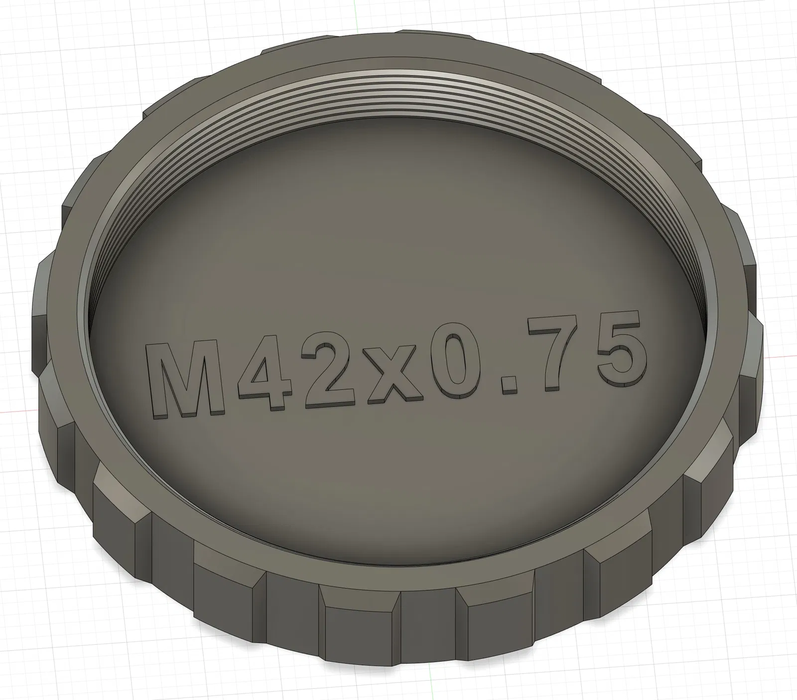 Bộ nắp đậy ren M42x0.75, dùng cho máy ảnh, kính thiên văn thiên văn. Kích thước ren này thường được gọi là "T-thread" hoặc "T2-thread". Khác với ren M42x1.0 dùng cho máy ảnh Pentax/MFT. Nên in bằng PLA+ để ren đẹp hơn. Thử X/Y +/- 0.5% nếu lỏng/chặt.