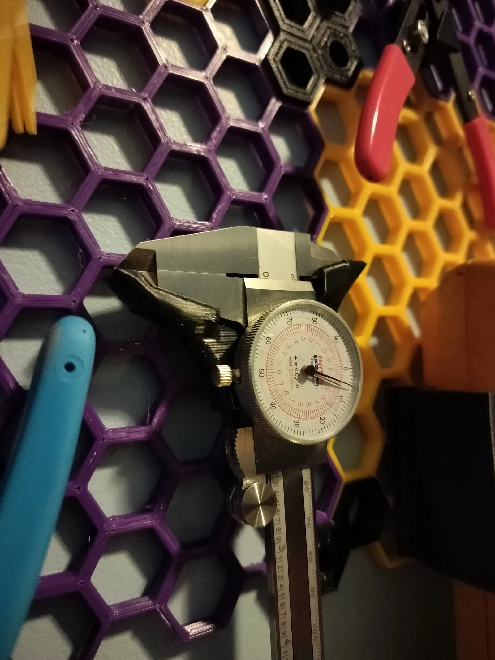 Giá đỡ thước kẹp được thiết kế để tương thích với Honeycomb Storage Wall (HSW) của RostaP. Mô hình được thiết kế ôm khít thước kẹp, có độ dày và hình dáng. In ở 0.2mm layer height, 20% infill, cần support cho overhang lớn.