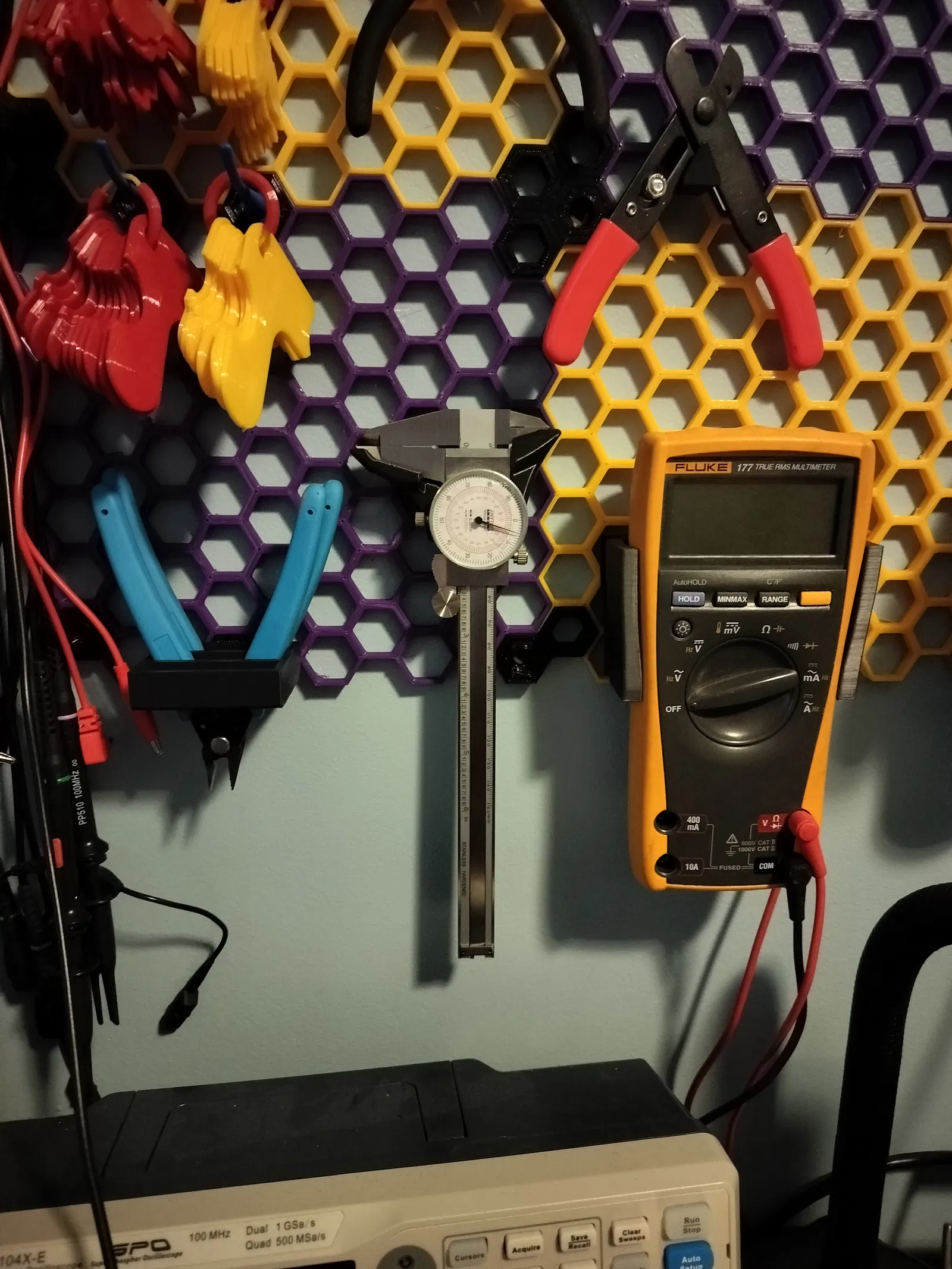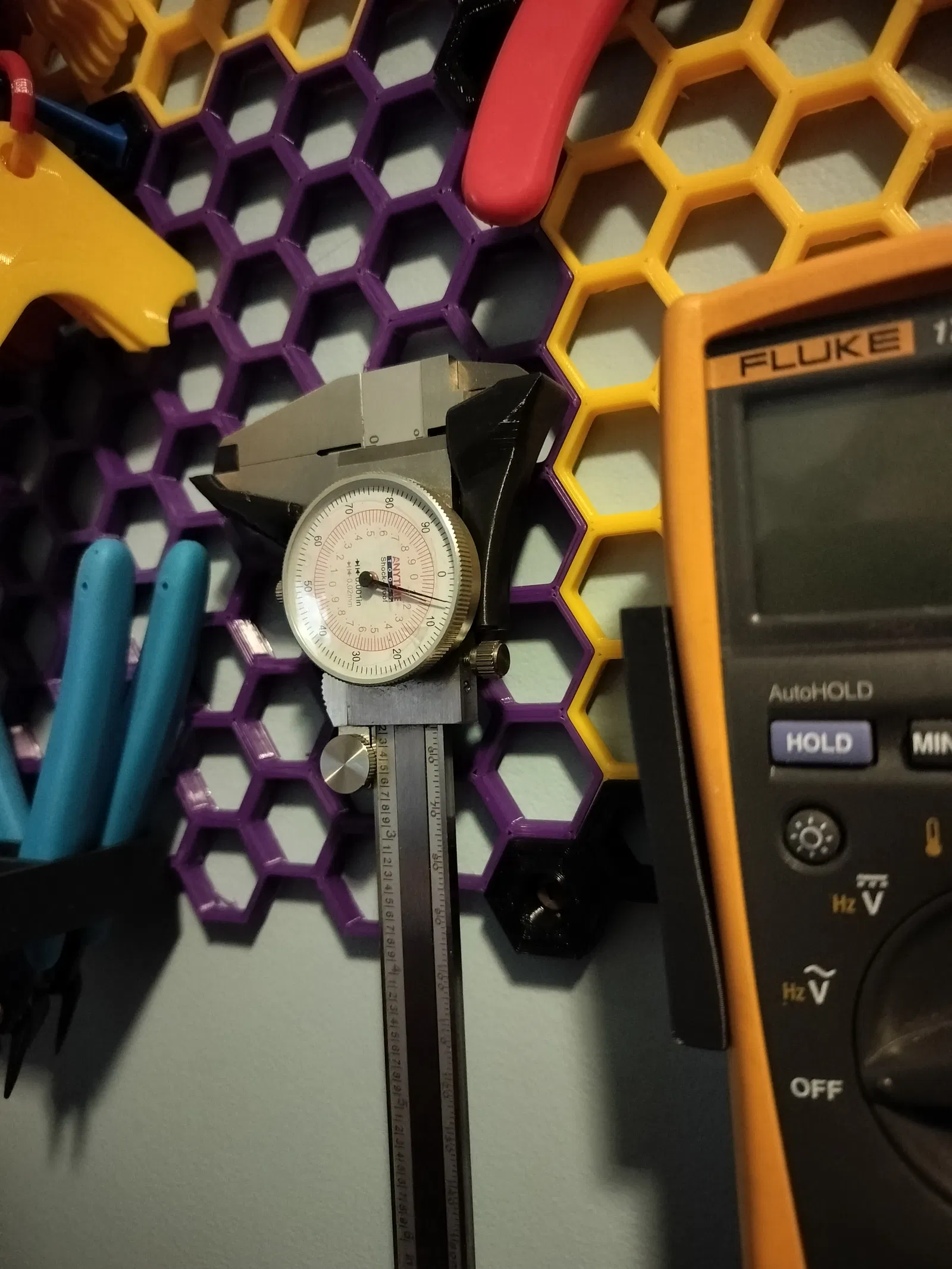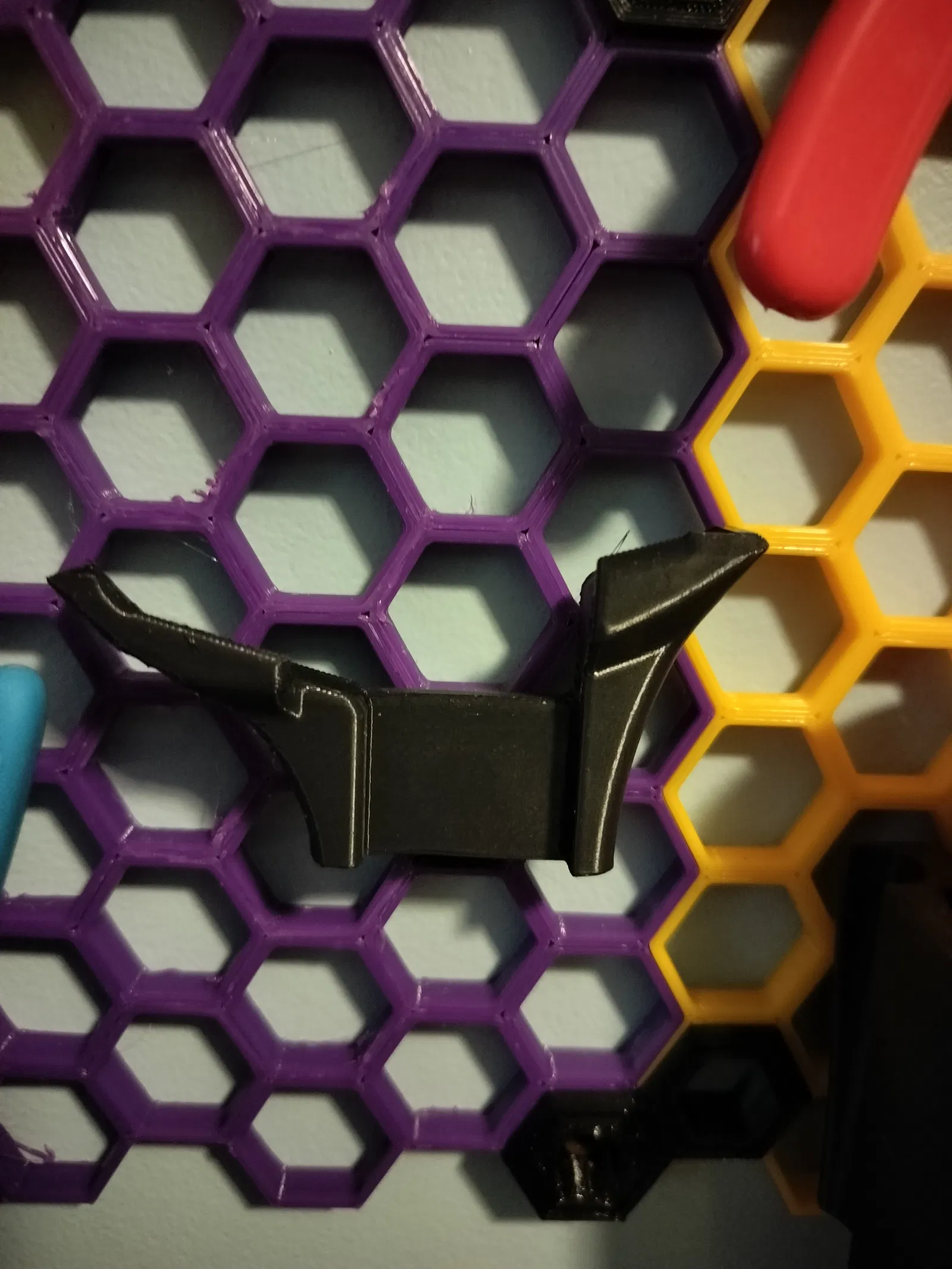 Mình đã tạo ra một cái holder tương thích với Hệ thống Honeycomb Storage Wall (HSW) của RostaP và sử dụng file “Insert-empty.stl” của anh ấy. Bạn hãy vào trang của anh ấy và tải file tại đây.