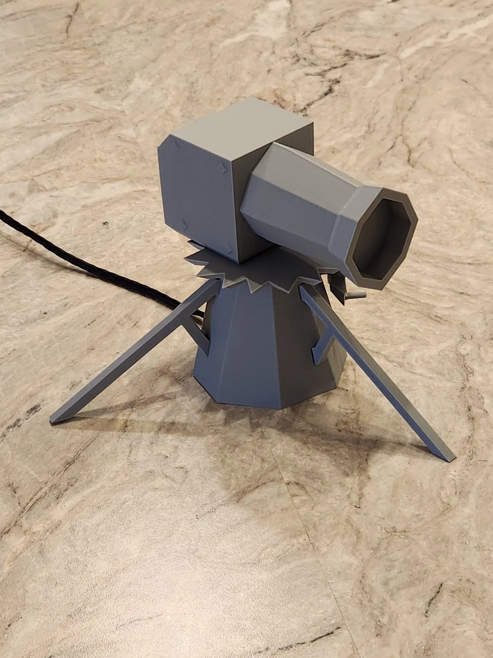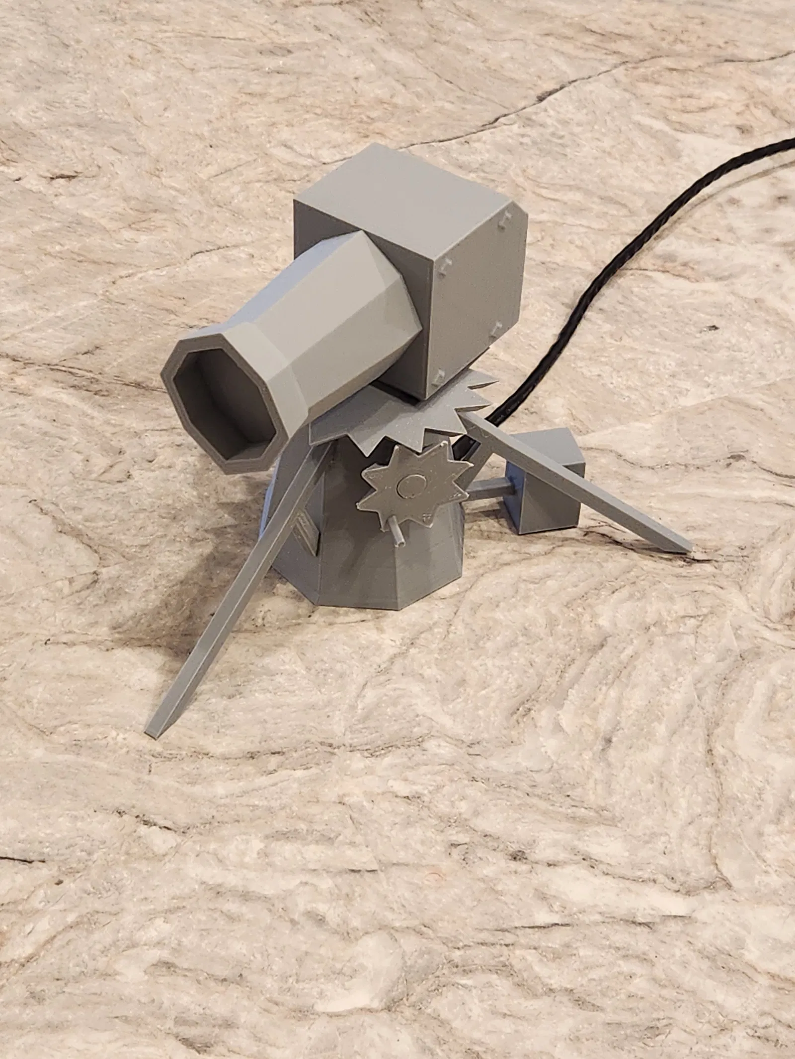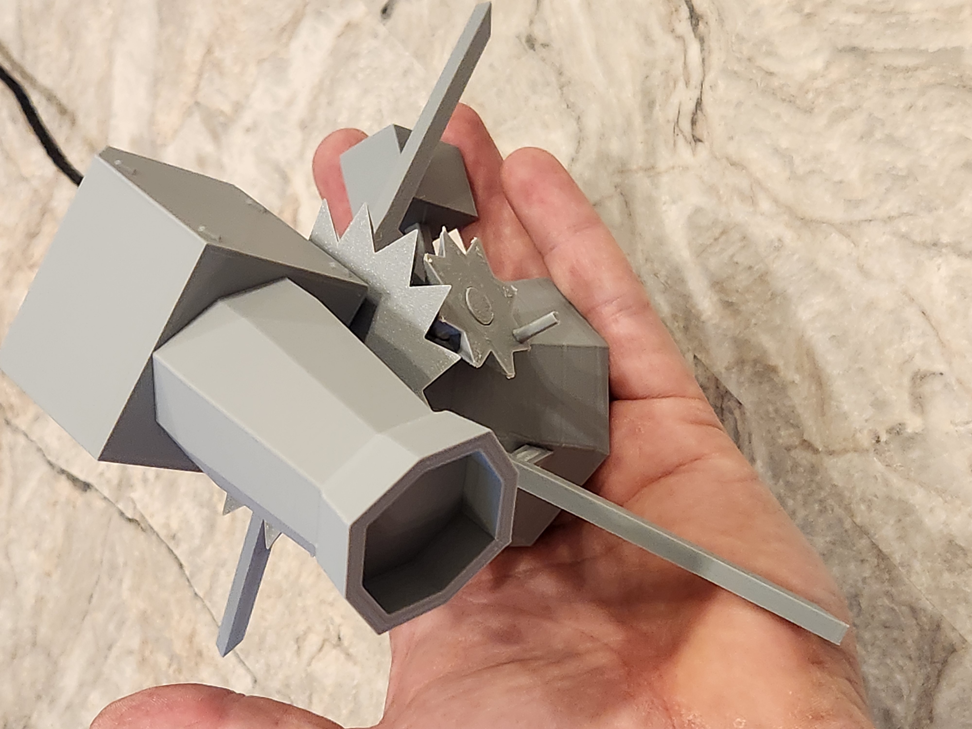 Xem bản Ver 2 để có setup tích hợp hơn nhé. Đây là Mô hình Dwarf Multi Cannon có động cơ từ game Old School Runescape. Bản gốc từ bạn Engineer4fun. Tui dùng Arduino nano để điều khiển motor bước. (Xoay 45 độ rồi dừng khoảng 18 vòng/phút y chang trong game) Xem code đính kèm cho nano nha. Tui dùng Motor bước 28BYJ-48 với Driver ULN2003, cả hai đều nằm gọn trong phần đế. Nano kết nối với driver bằng 6 sợi dây 24 awg, cấp nguồn qua mini usb. Thêm thông tin về motor bước tui dùng. Chi tiết: Điều khiển Motor bước 28BYJ-48 với ULN2003 Driver & Arduino (lastminuteengineers.com) ### Cài đặt in Hãng máy in: Creality Máy in: Ender 3 Pro Hỗ trợ in: Có ở một vài bộ phận Độ phân giải: 0.2 Infill: 30 Nhựa in: OVERTURE PLA Plus Màu Xám Nhạt (cho phần vỏ Nano tui dùng TPU 95) Lưu ý: Tấm đế hơi chật, bạn có thể scale nhỏ lại chút (1-5%) nha.