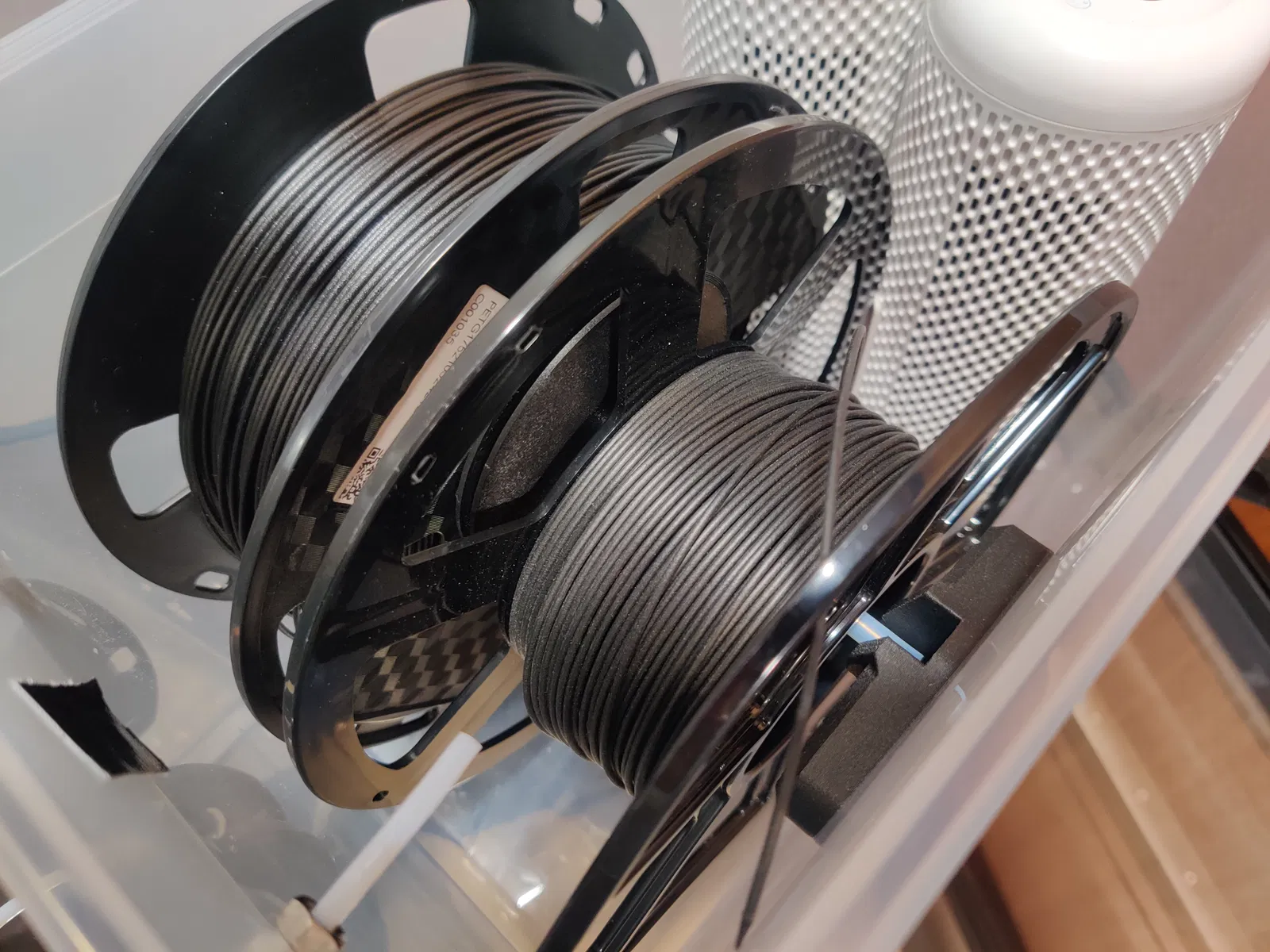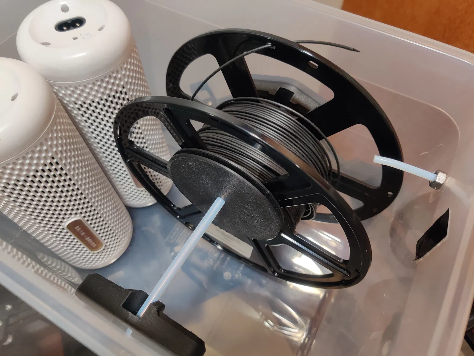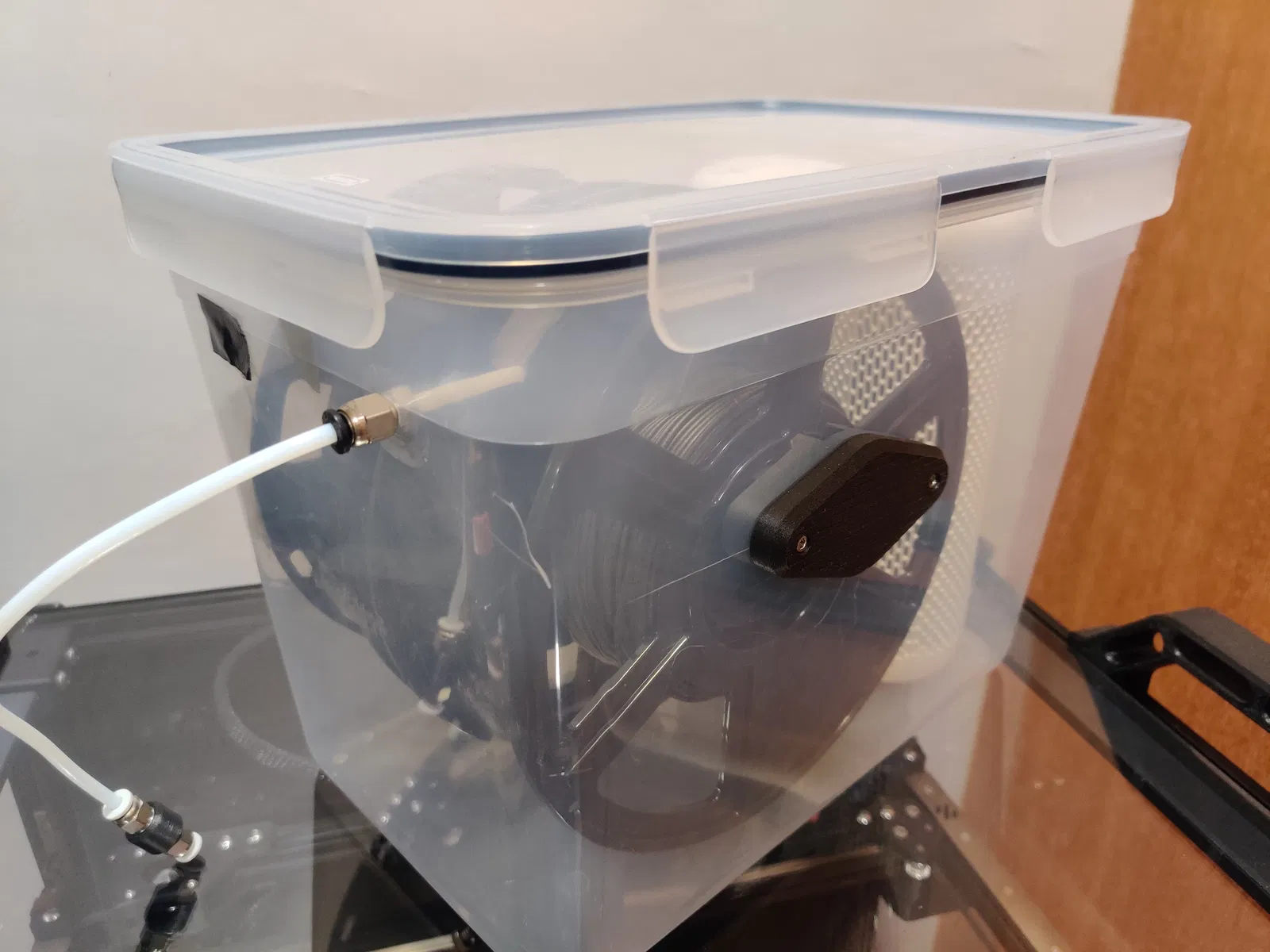 Hộp sấy dây nhựa với ma sát thấp nhất, dựa trên hộp Ikea 365+ 10.6L. Giải pháp cho vấn đề dây nhựa bị kẹt, giúp kéo dây mượt mà hơn qua bộ dẫn hướng đảo chiều. Có tùy chọn sử dụng thanh trần nếu không có ống PTFE.