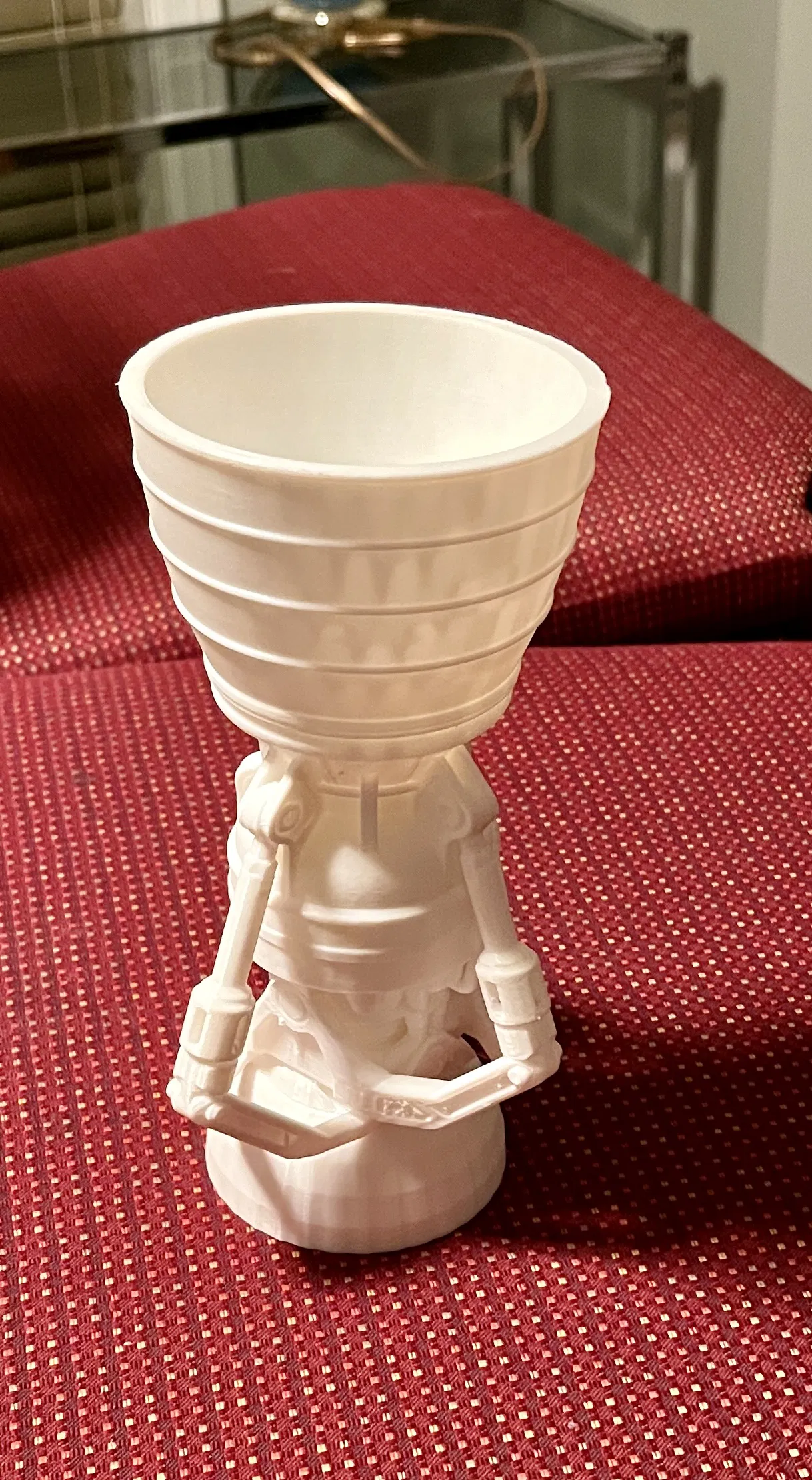 Chiếc ly độc đáo này được thiết kế dựa trên hình ảnh động cơ tên lửa úp ngược, với phần vòi phun được bịt kín và thêm một phần đế chắc chắn. Thích hợp để đựng rượu vang, mang đến trải nghiệm thưởng thức mới lạ.