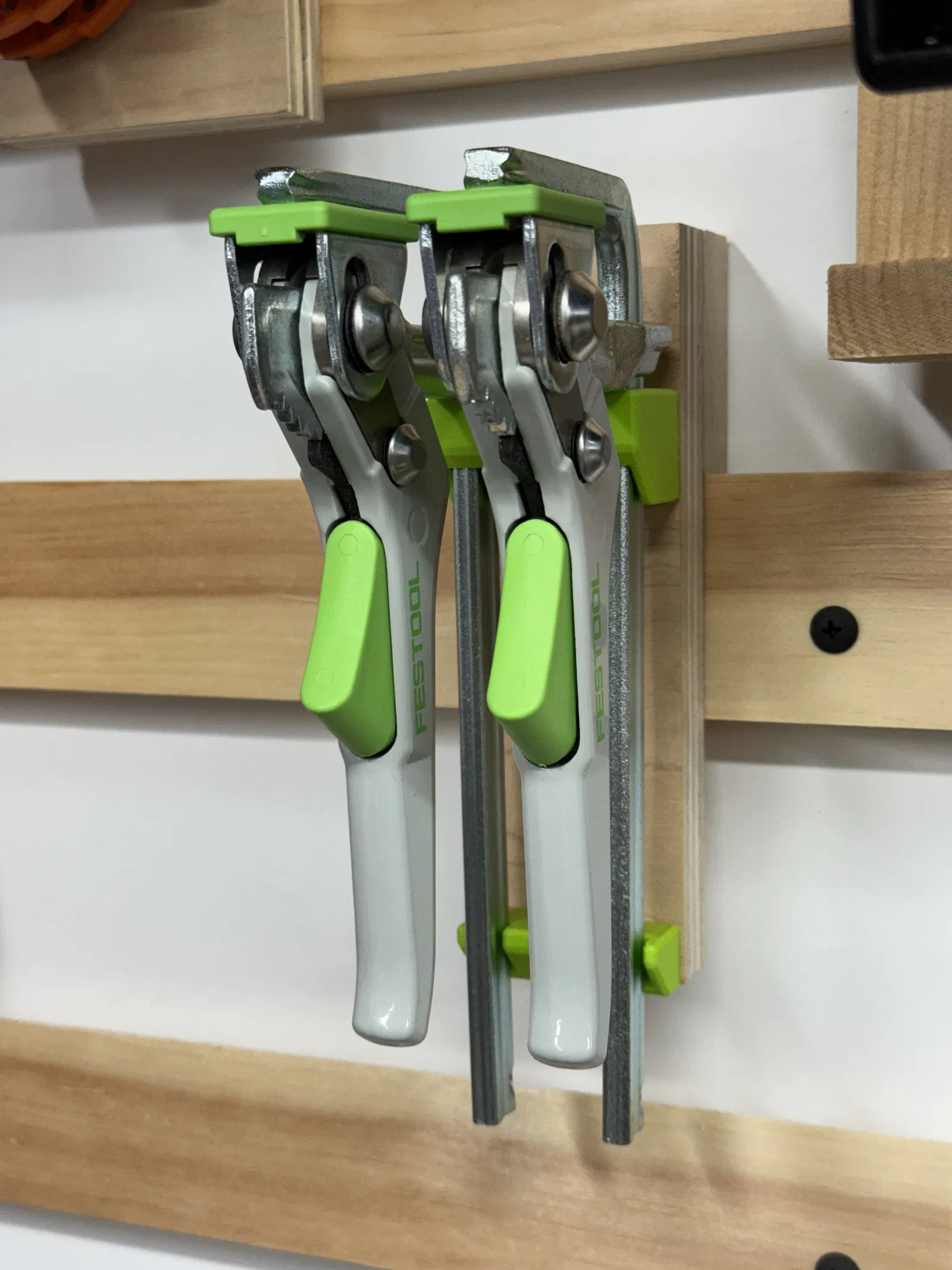 Phiên bản remix này được chế tạo để giữ được hai kẹp ray dẫn hướng thay vì sáu cái như bản gốc. Một giải pháp lưu trữ gọn gàng và hiệu quả cho các loại kẹp của Festool, Bessey và Makita, giúp không gian làm việc của bạn trở nên ngăn nắp hơn. Rất phù hợp cho anh em xài đồ của mấy hãng này.