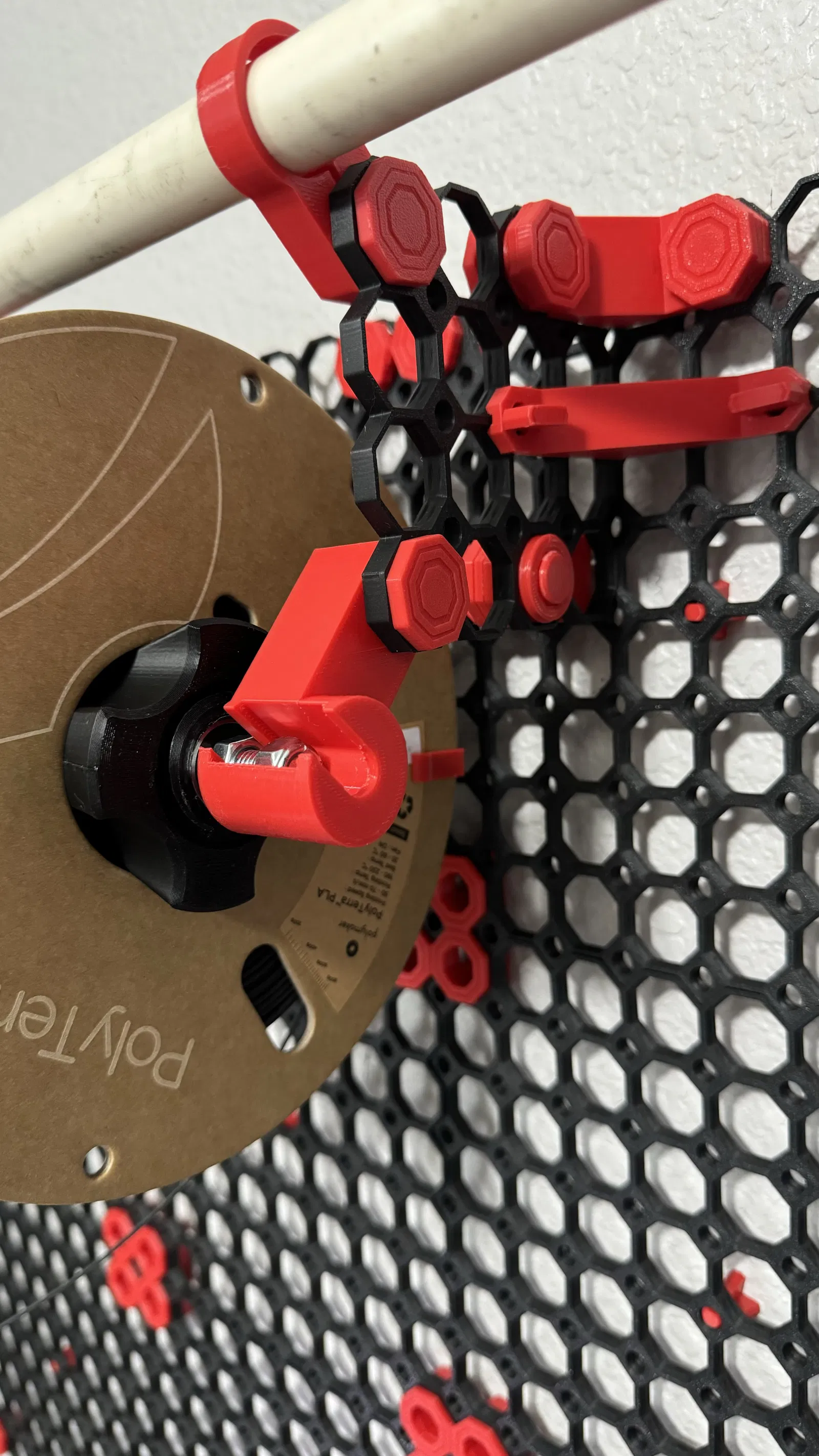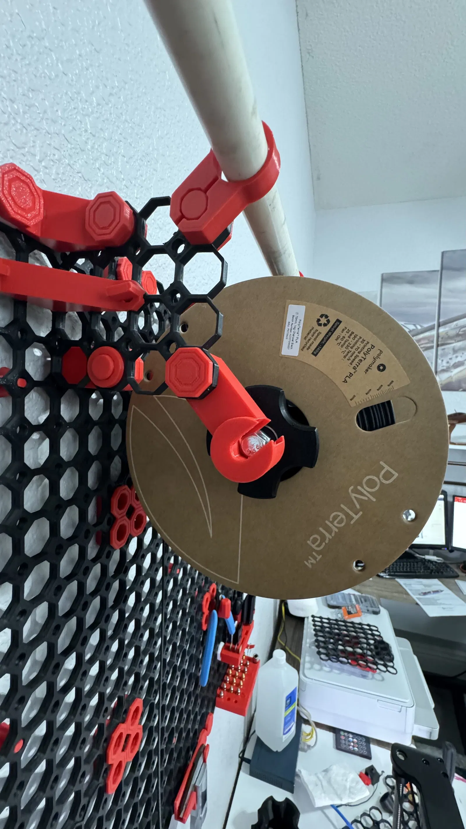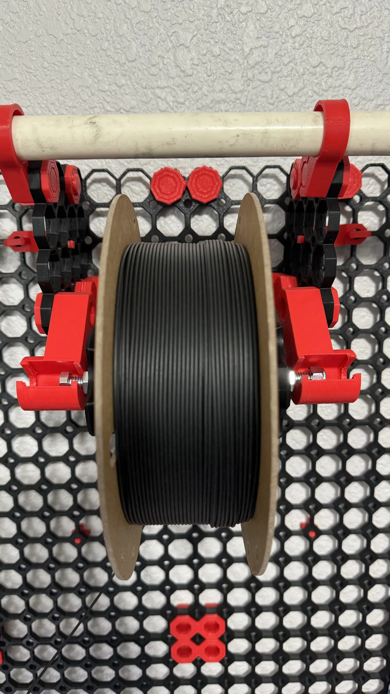 Tôi đang sử dụng một tấm 5x5 để kéo dài Multiboard theo trục y thay vì Giá đỡ tấm (Tile Bracket) để tôi có thể gắn Giá đỡ cuộn chỉ ở phía dưới và vẫn sử dụng Bộ giá đỡ cột ngang Multiboard (Multiboard Horizontal Pole Mount) ở phía trên để treo thêm cuộn chỉ (tạm thời minh họa bằng ống PVC trong ảnh).
