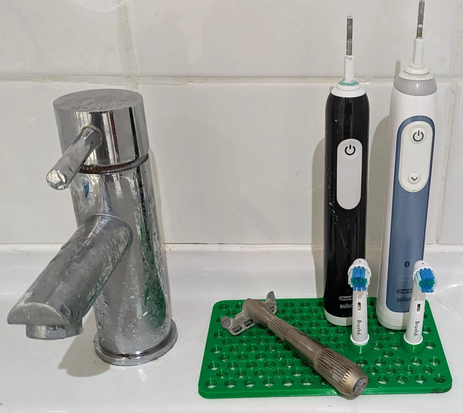 Có hai phiên bản, bản D12 mm (hình trong ảnh) thì phần giữ đầu bàn chải hơi chật ở vòng màu nên mình làm thêm bản D12.5 mm nhưng chưa in thử xem có tốt hơn không nha. Tự chịu trách nhiệm khi in đó nghen.