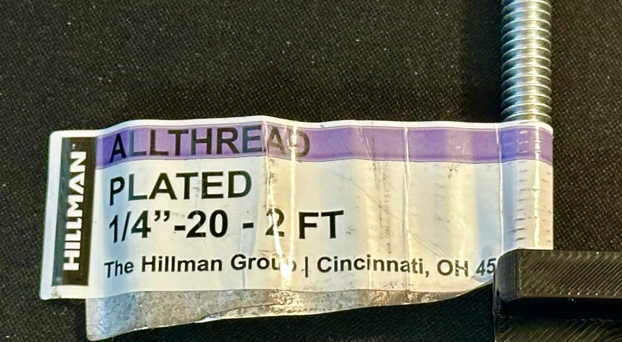 Mặt khác, thanh ren ¼"-20 chỉ có giá khoảng 2 đô la cho đoạn dài 2ft tại các cửa hàng lớn thuộc loại Màu xanh hoặc Màu cam. Bạn có thể thấy một cái được chụp trong thư viện.
