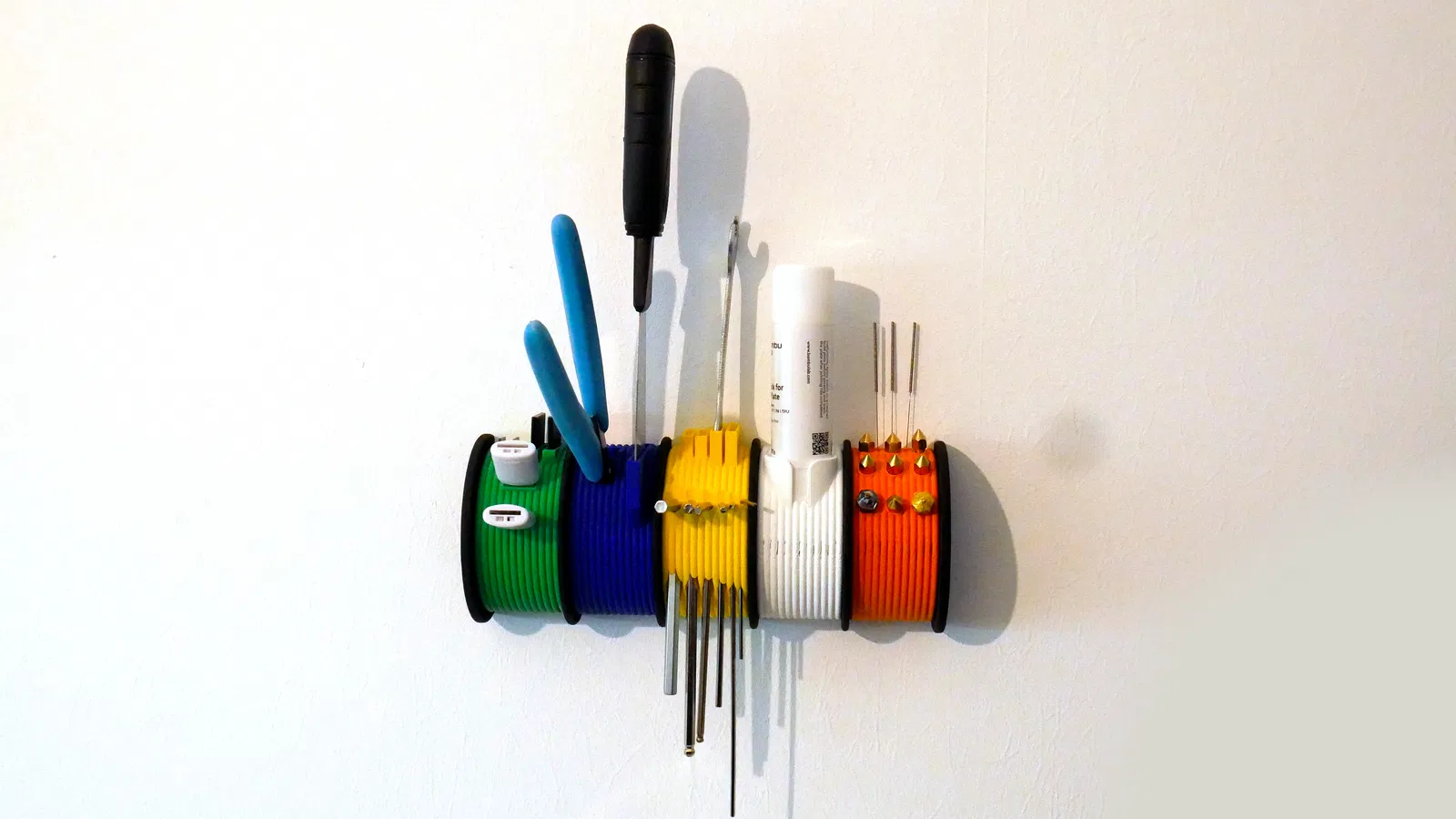 Tất cả đều linh hoạt! Mỗi mô-đun được thiết kế độc lập, cho phép bạn kết hợp và tùy chỉnh theo ý thích. Biến nó thành của riêng bạn! Kệ này có các khe cắm hình cuộn dây (spool) được chế tạo đặc biệt để giữ các dụng cụ lục giác (hex keys), thẻ nhớ SD, keo dạng thỏi và nhiều hơn nữa.. Không còn cảnh dụng cụ chạy lung tung – chúng sẽ nằm gọn gàng trong các vị trí được chỉ định, sẵn sàng hoạt động.