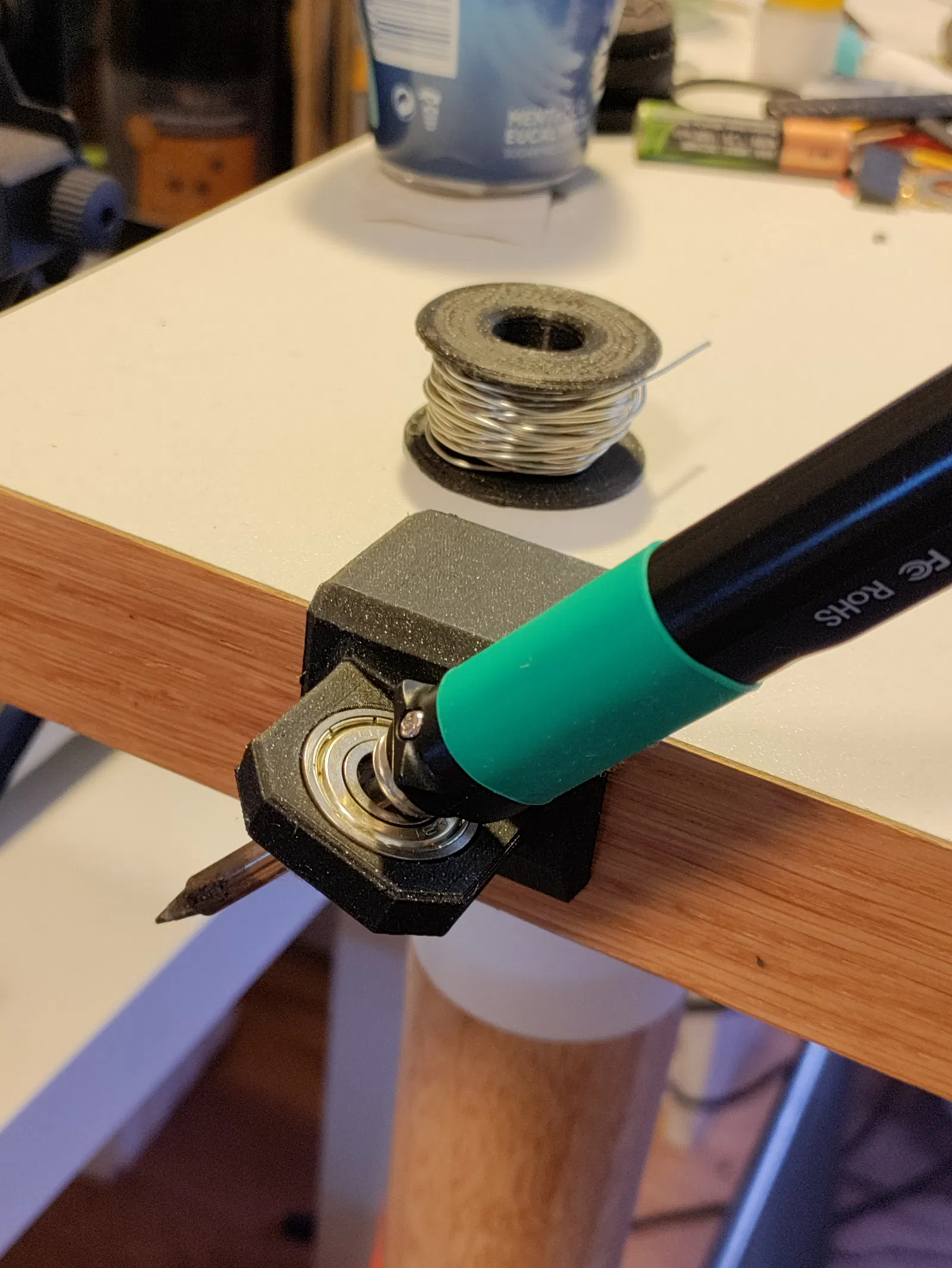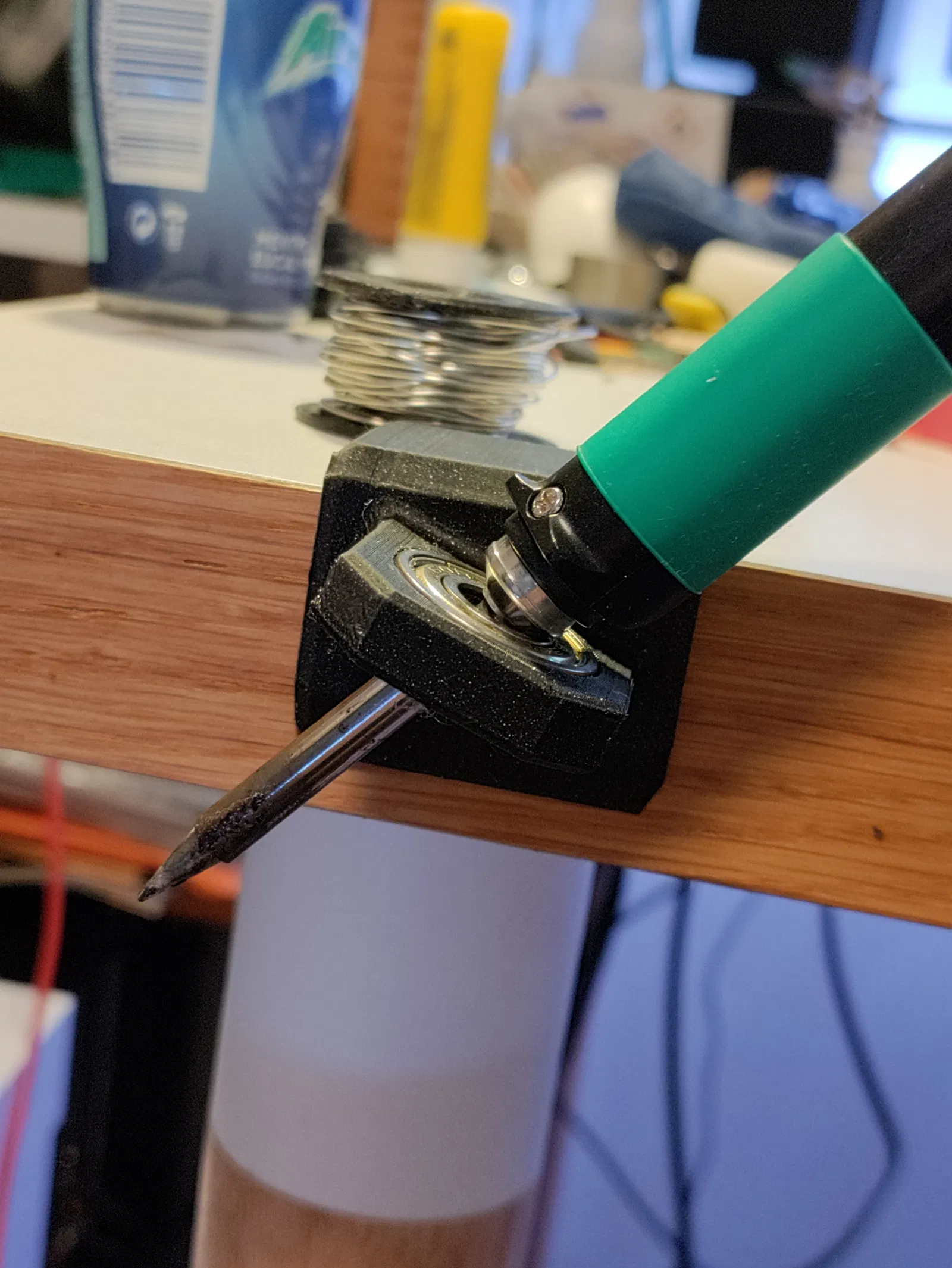 Một chỗ đơn giản để cây hàn của bạn. Tôi dùng keo dán hai mặt loại rẻ tiền để gắn cây hàn của mình. Cần vòng bi ván trượt 22mm làm bề mặt tiếp xúc chịu nhiệt. Cách thiết kế này chỉ dùng được cho bên trái. In ngược lại để dùng cho bên phải.