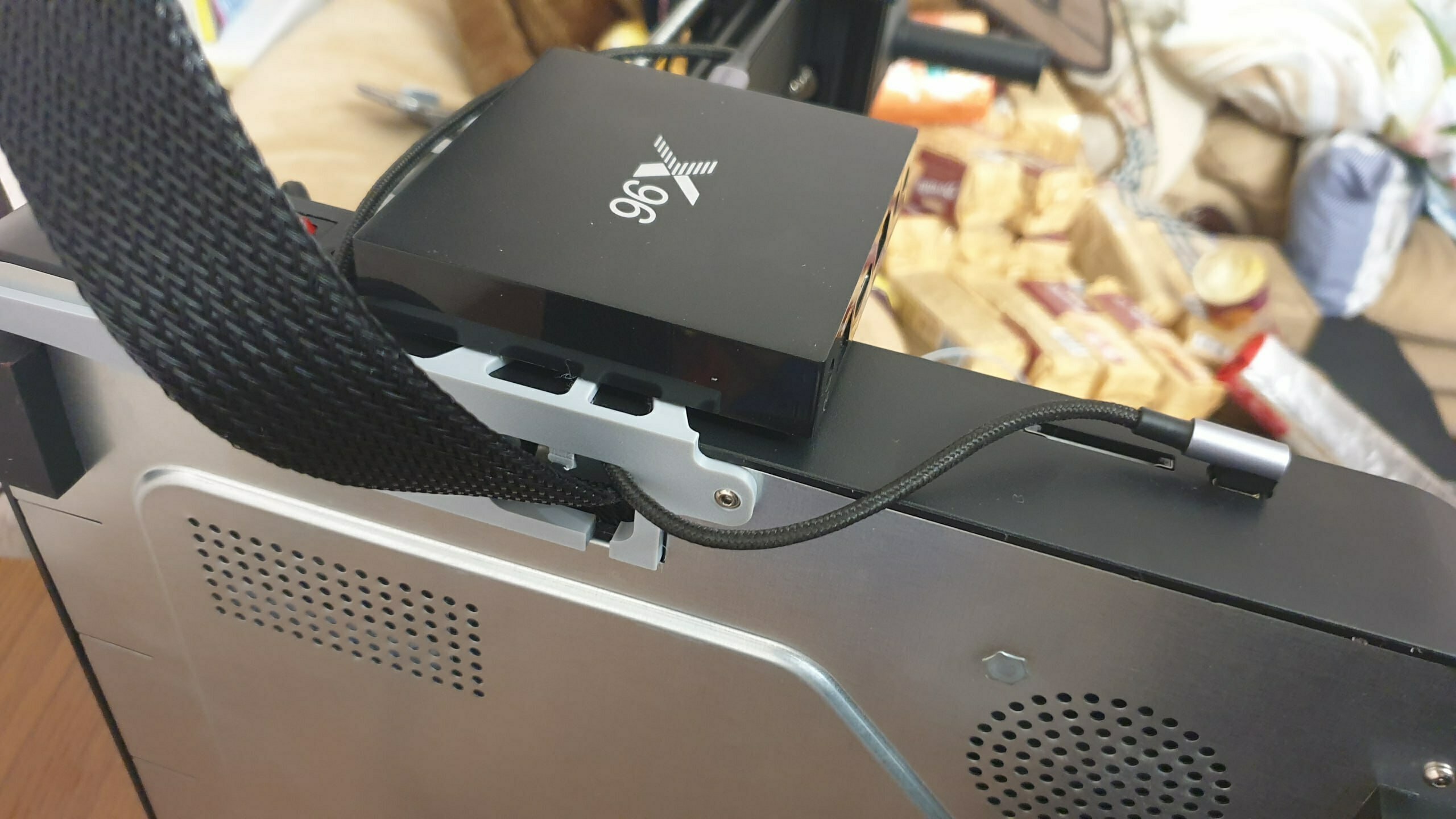 Giá đỡ cho hộp TV (X96w, X96 mini) gắn vừa vặn trên Ender 3 v3 SE/KE. Lưu ý: Không nên in bằng nhựa PLA vì hộp TV tỏa nhiệt cao (55+ độ C) có thể làm nhựa bị chảy hoặc gãy. Nên sử dụng vật liệu chịu nhiệt tốt hơn và in bằng tree support để có kết quả tốt nhất.