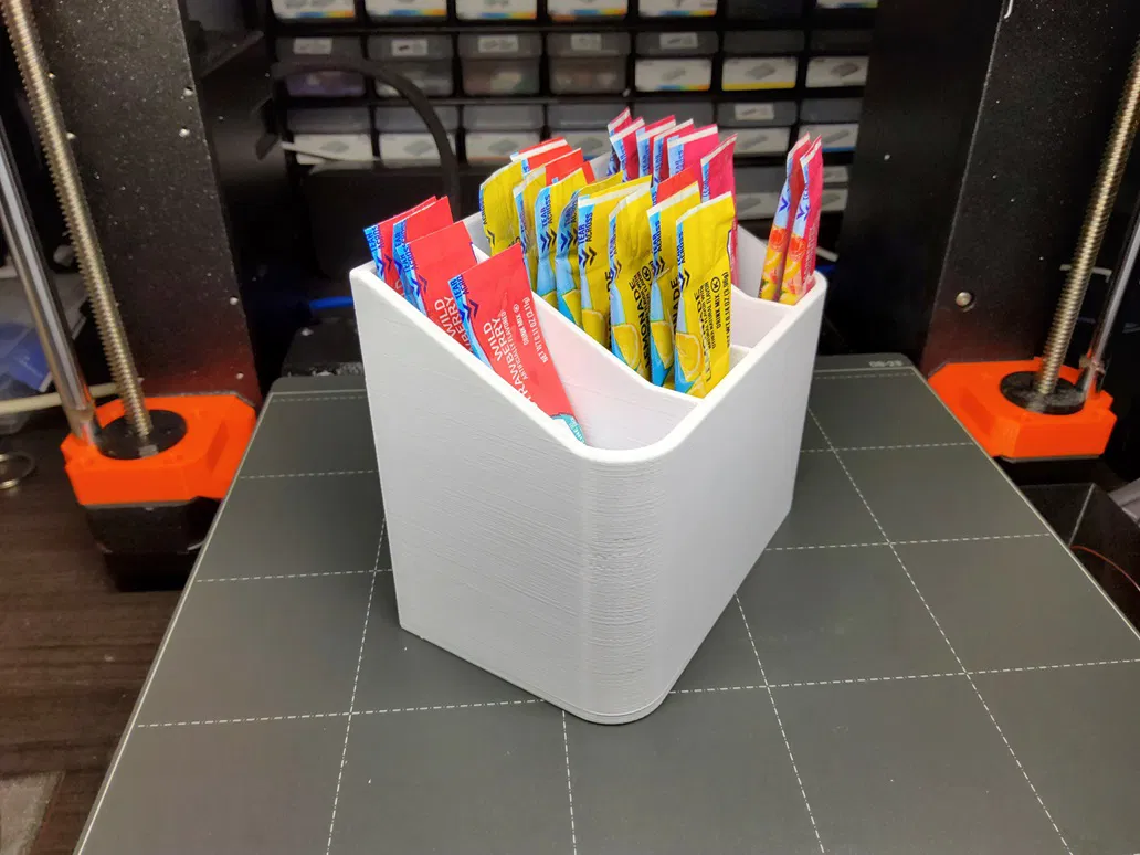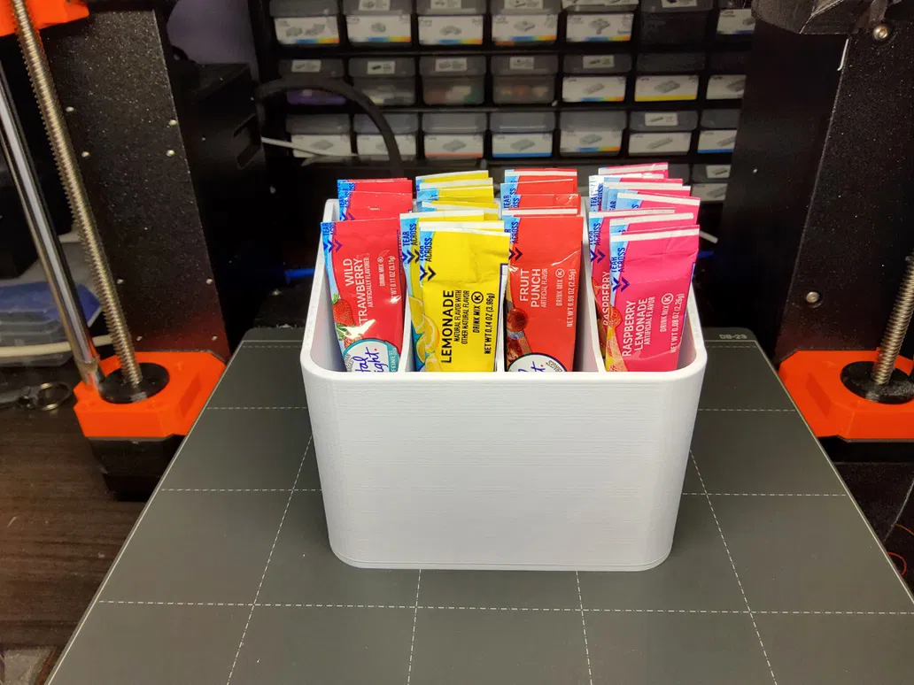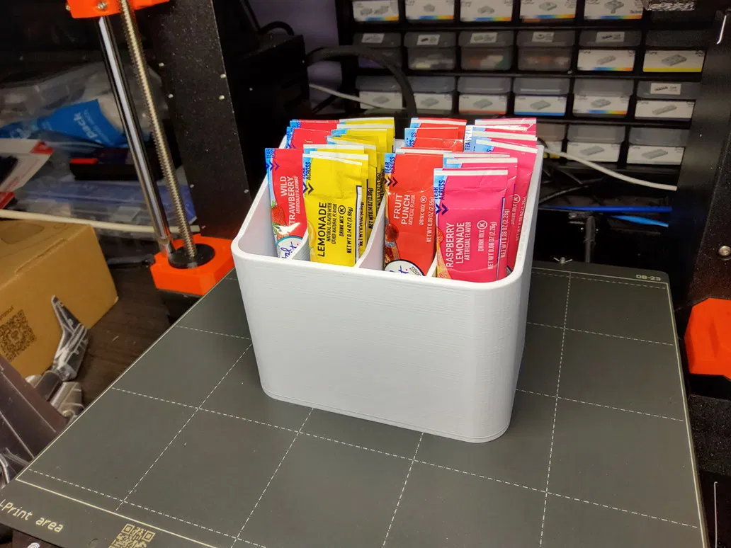 Tui làm cái thùng này để sắp xếp và chứa mấy gói bột pha đồ uống loại một phần trên bàn làm việc nè. Chắc là nó cũng chứa được mấy thứ khác nữa đó. Măng tây chẳng hạn? Tui không biết nữa. Tui đâu phải quản lý của ông đâu.