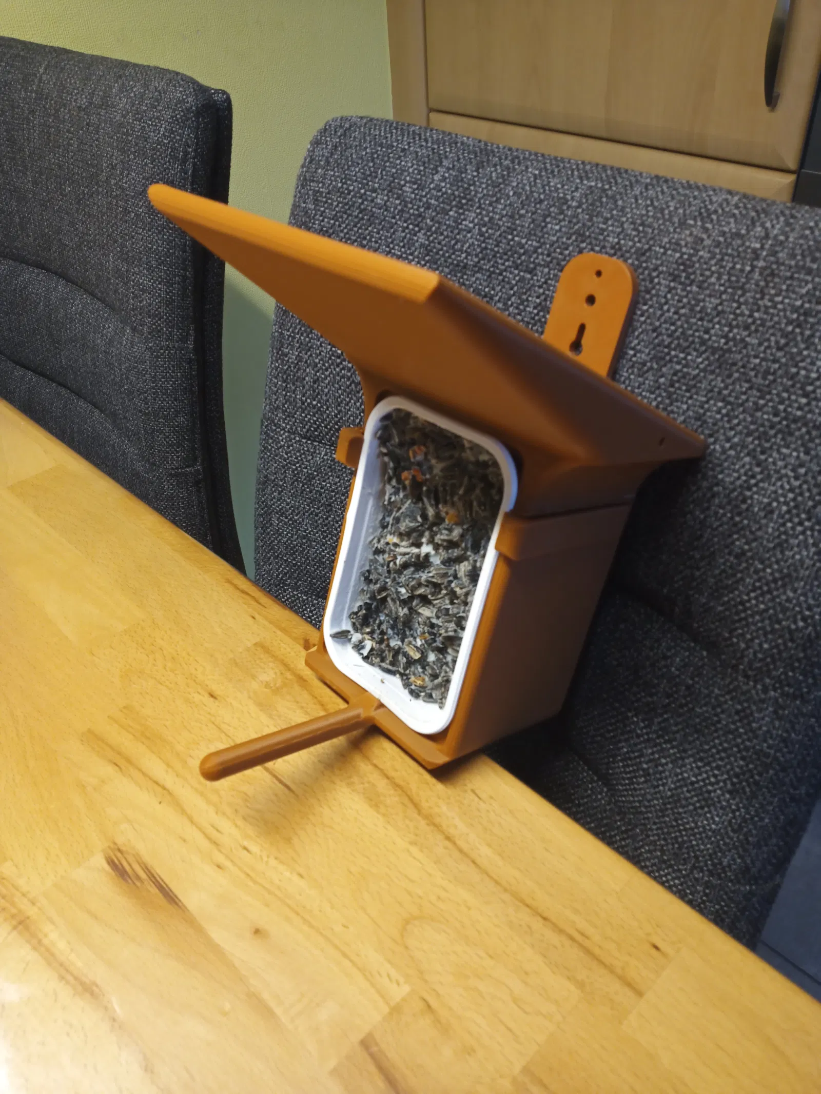 Cái nhà cho chim ăn này được thiết kế để kẹp vừa một ly bơ thực vật 500g đã được đổ đầy thức ăn cho chim.