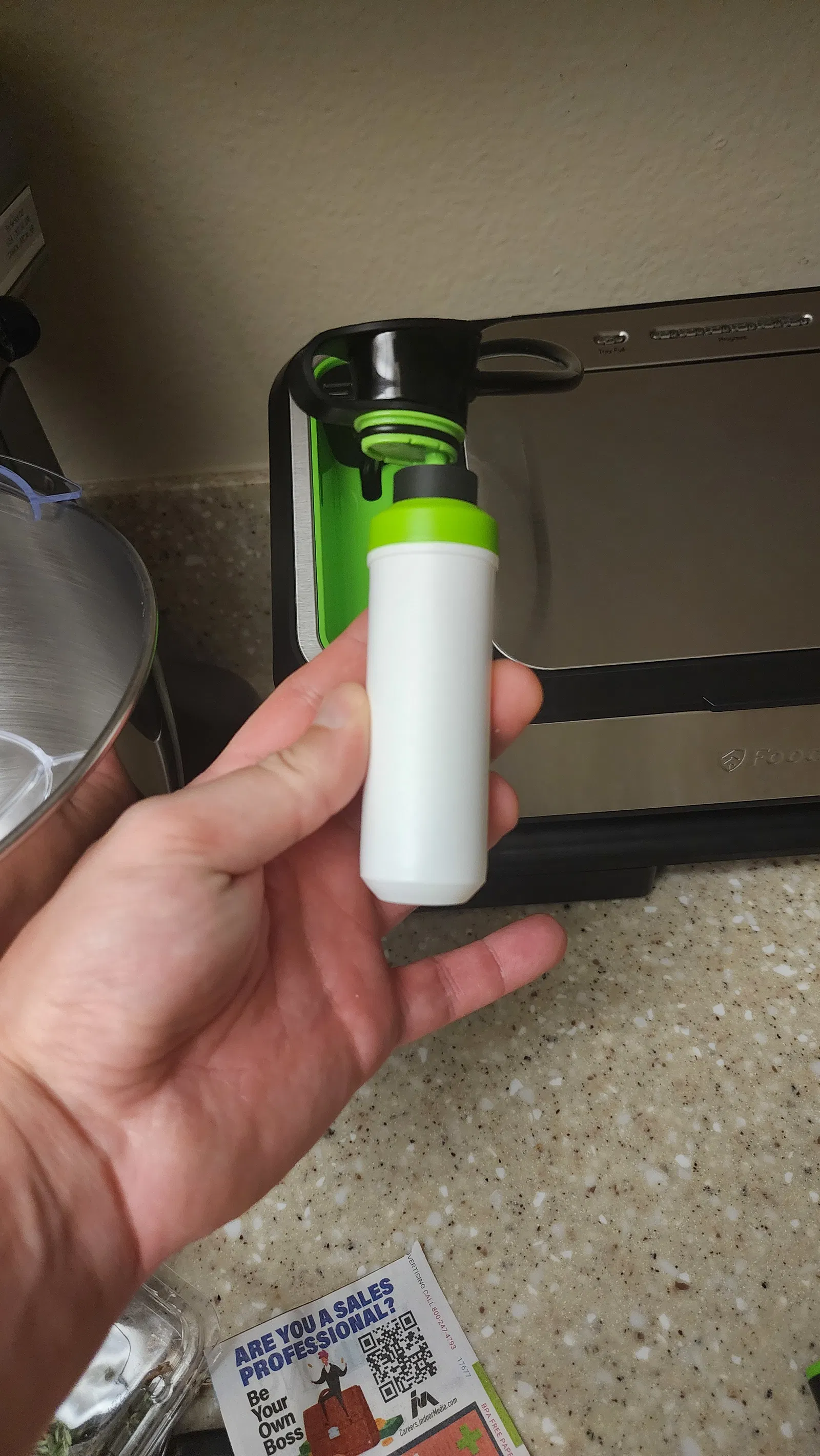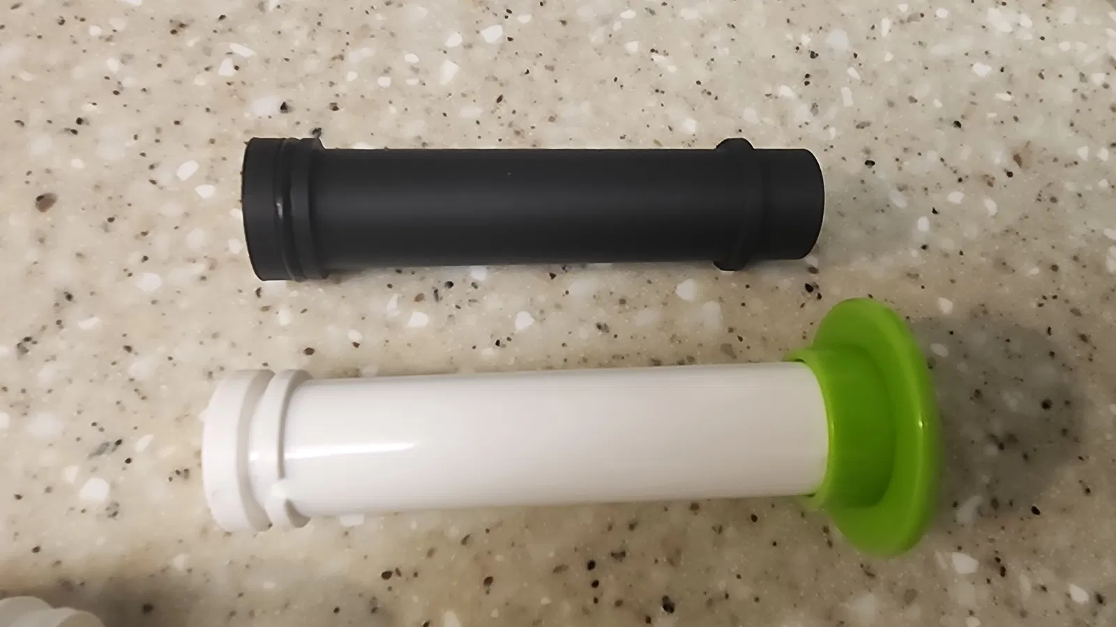 Tui mới mua mấy cái hộp "tương thích" Vac seal của Lasting Freshness trên Amazon, loại mà bảo là dùng được với cổng phụ kiện của food saver á. Mà xài hổng có được. Nên tui chế cái cục thay thế cho cái piston của bơm tay đi kèm bộ luôn.