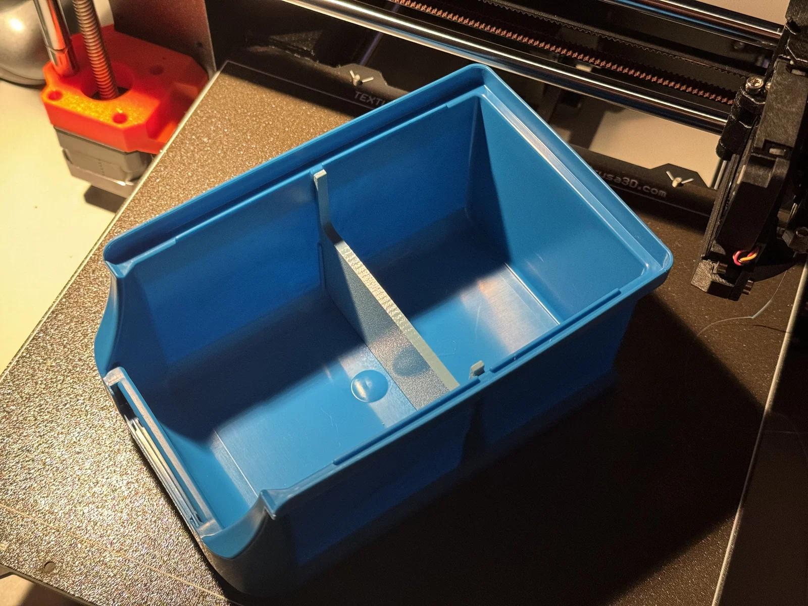 Vách ngăn này dùng để chia ngăn cho cái hộp nhựa màu xanh dương. Nó gắn vừa khít, có khớp cài và được in bằng PETG với độ dày lớp cắt 0.15mm. Bạn cũng có thể in bằng PLA.