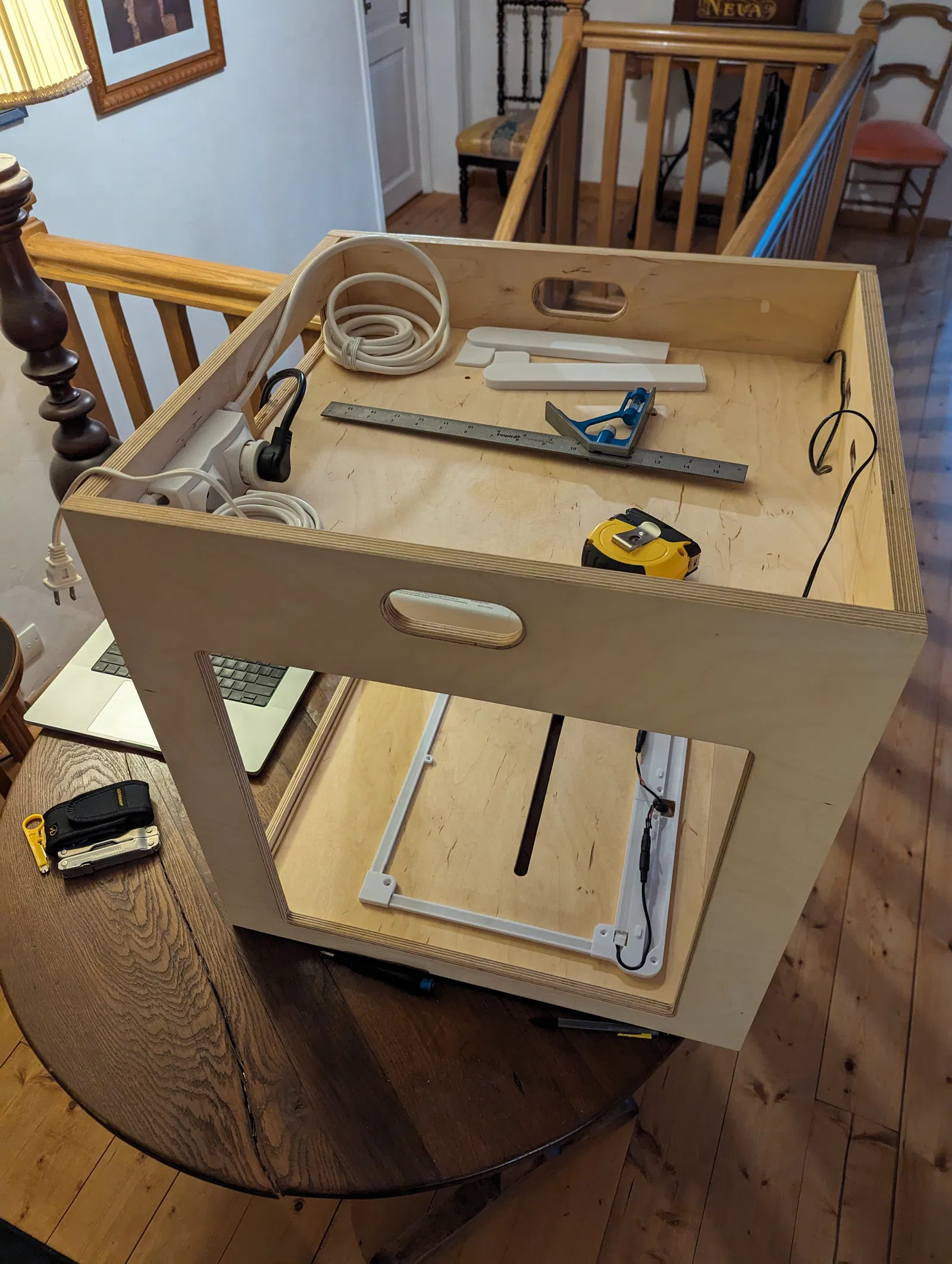 Toàn bộ hệ thống được giữ bằng 7 con vít gỗ, còn mấy cái nắp đậy phía trước thì trượt vào thôi. Lưu ý là vì vậy, bạn cần có một khoảng trống nhỏ ở hai bên trong tủ máy in để có thể đóng lại được.