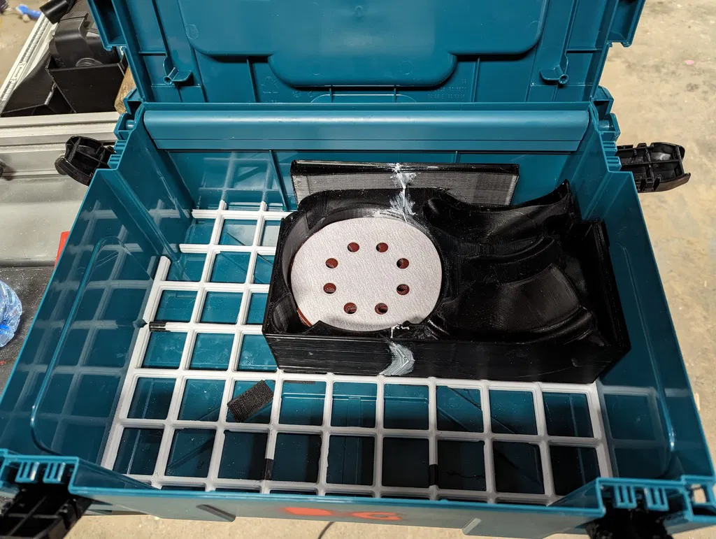 Khay đựng máy chà nhám Makita B5041, có chỗ cất đĩa chà nhám 125mm và dễ dàng lấy ra. Thiết kế vừa vặn cho Mbox2 (MakPak), chỉ cần dán lại với nhau. Sử dụng keo silicone để lắp ráp.