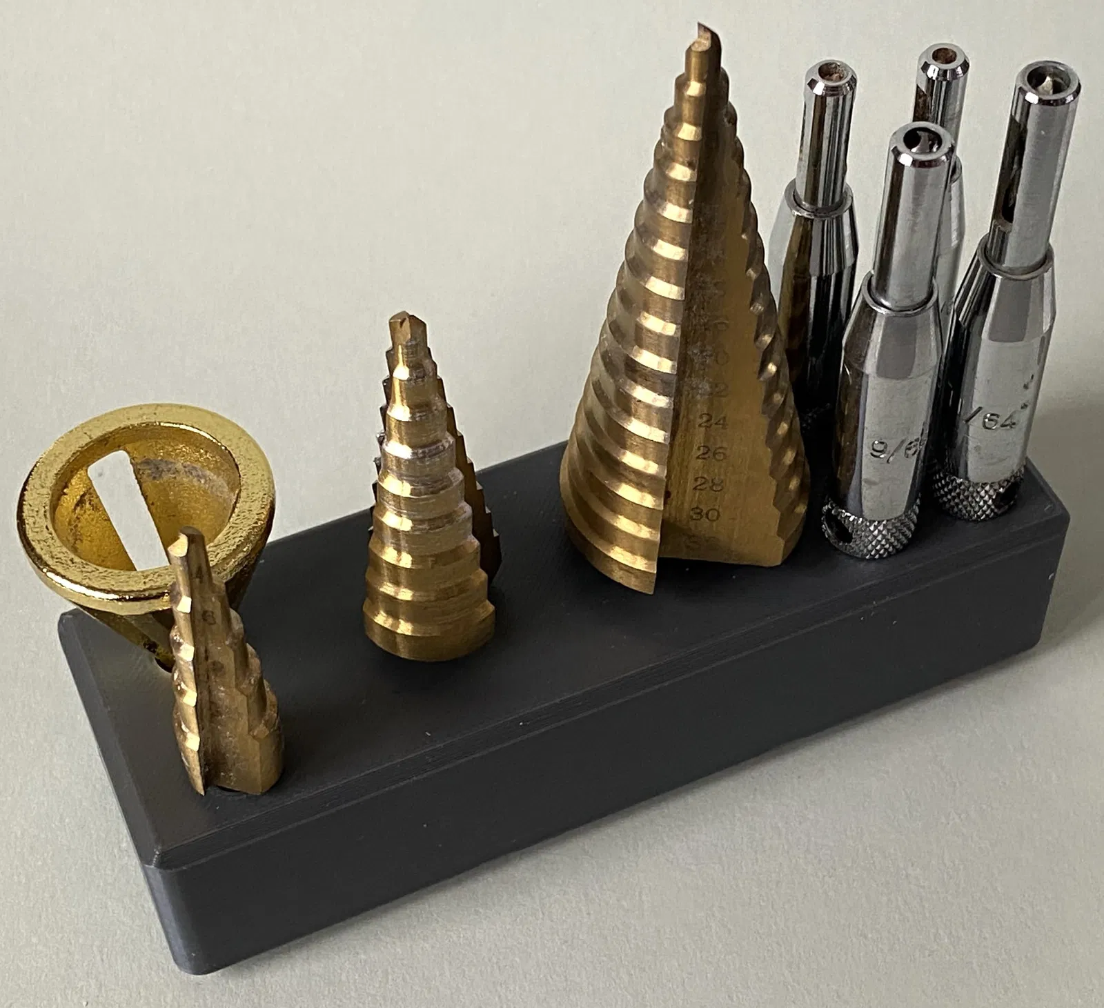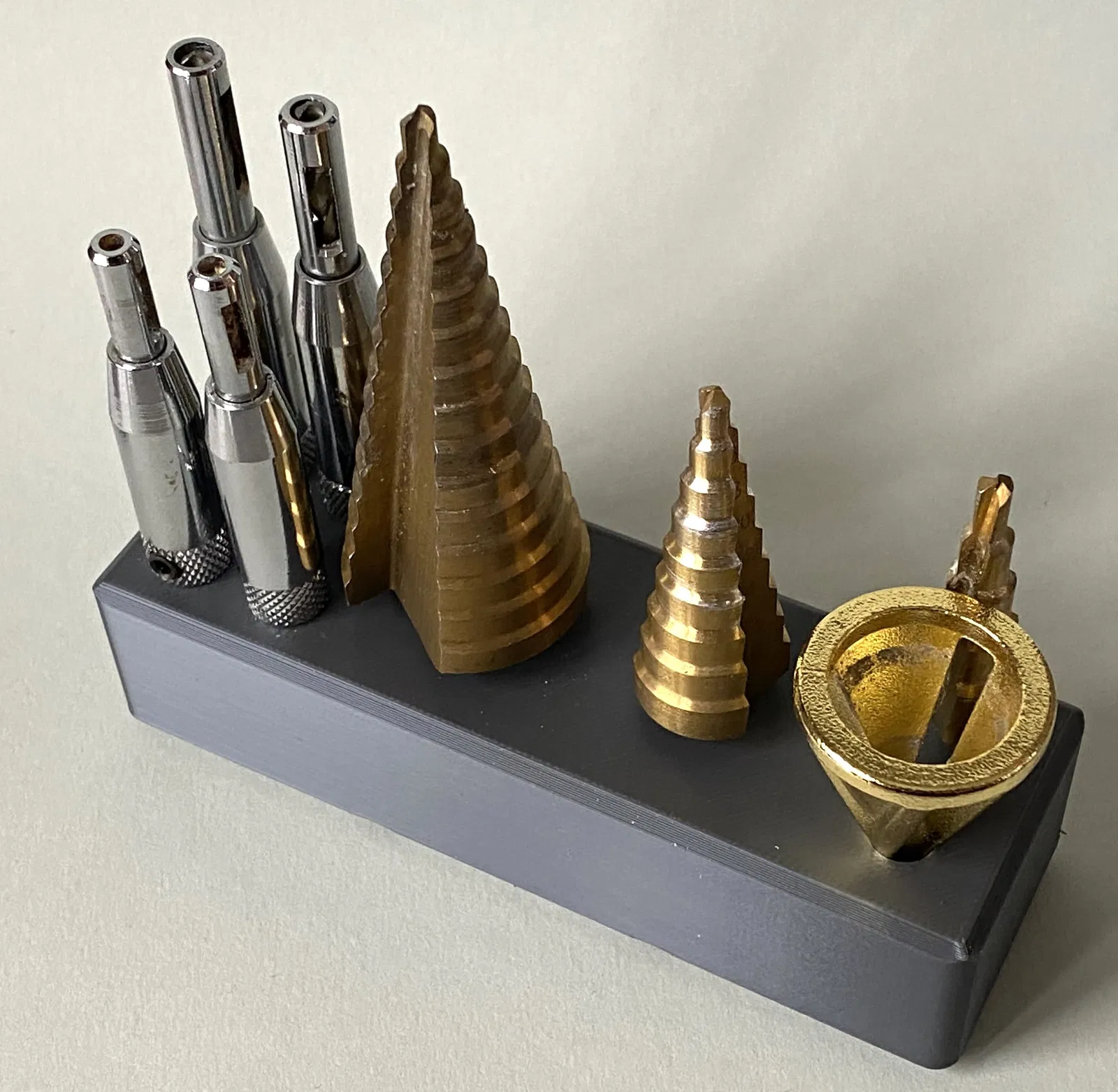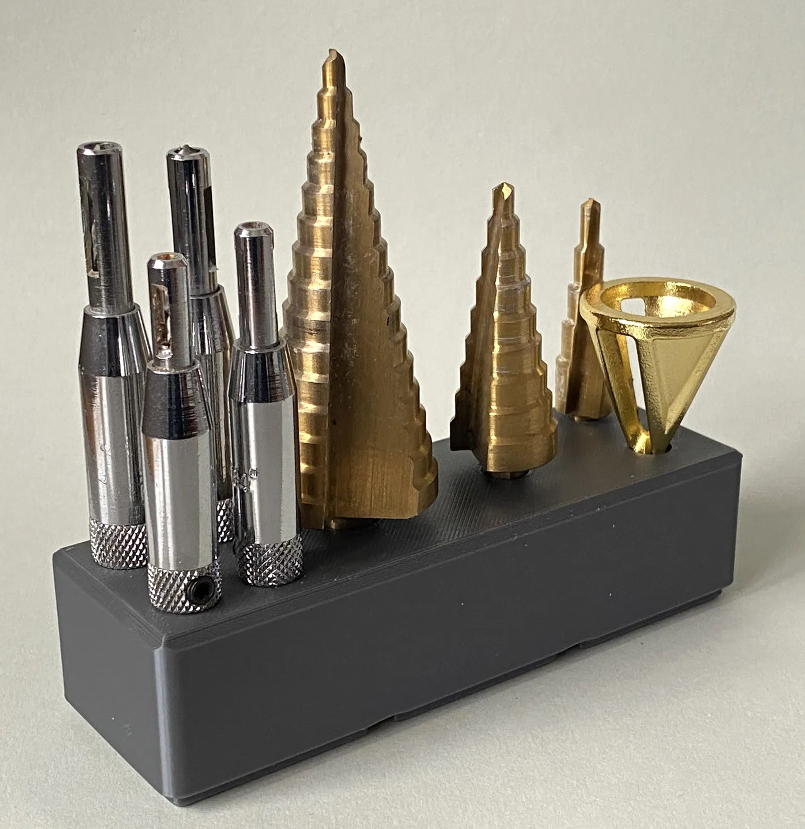 Tui cần sắp xếp lại cái hộp mũi khoét bậc của tui, nên sao không áp dụng hệ thống Gridfinity luôn? Lấy kích thước mấy mũi khoét của tui, cộng thêm mỗi đường kính 0.5mm để làm lỗ. Làm vầy ngon lành. Sử dụng hộp Gridfinity 1x2. Chêm mấy cái tấm solid vô đế, tui không thích mấy cái lỗ tròn ở giữa đâu. Chêm cái bin Gridfinity cho đặc luôn. Khoét lỗ cho mấy mũi khoét. Thiết kế bằng TinkerCad. Xem mấy cái đồ tui in khác nè: https://www.printables.com/de/@Tritschi