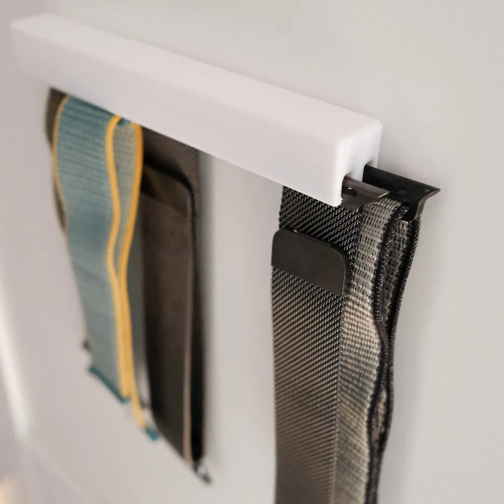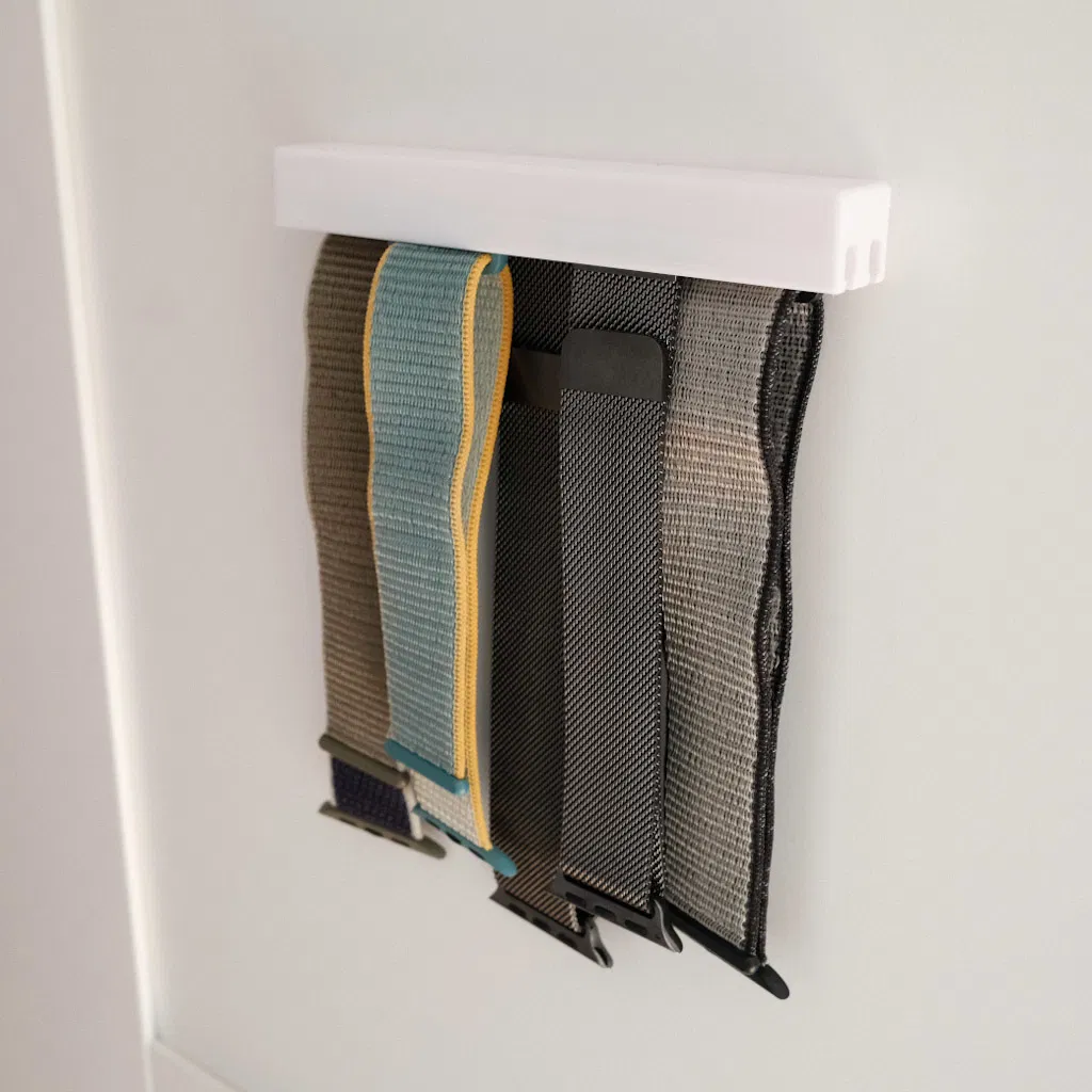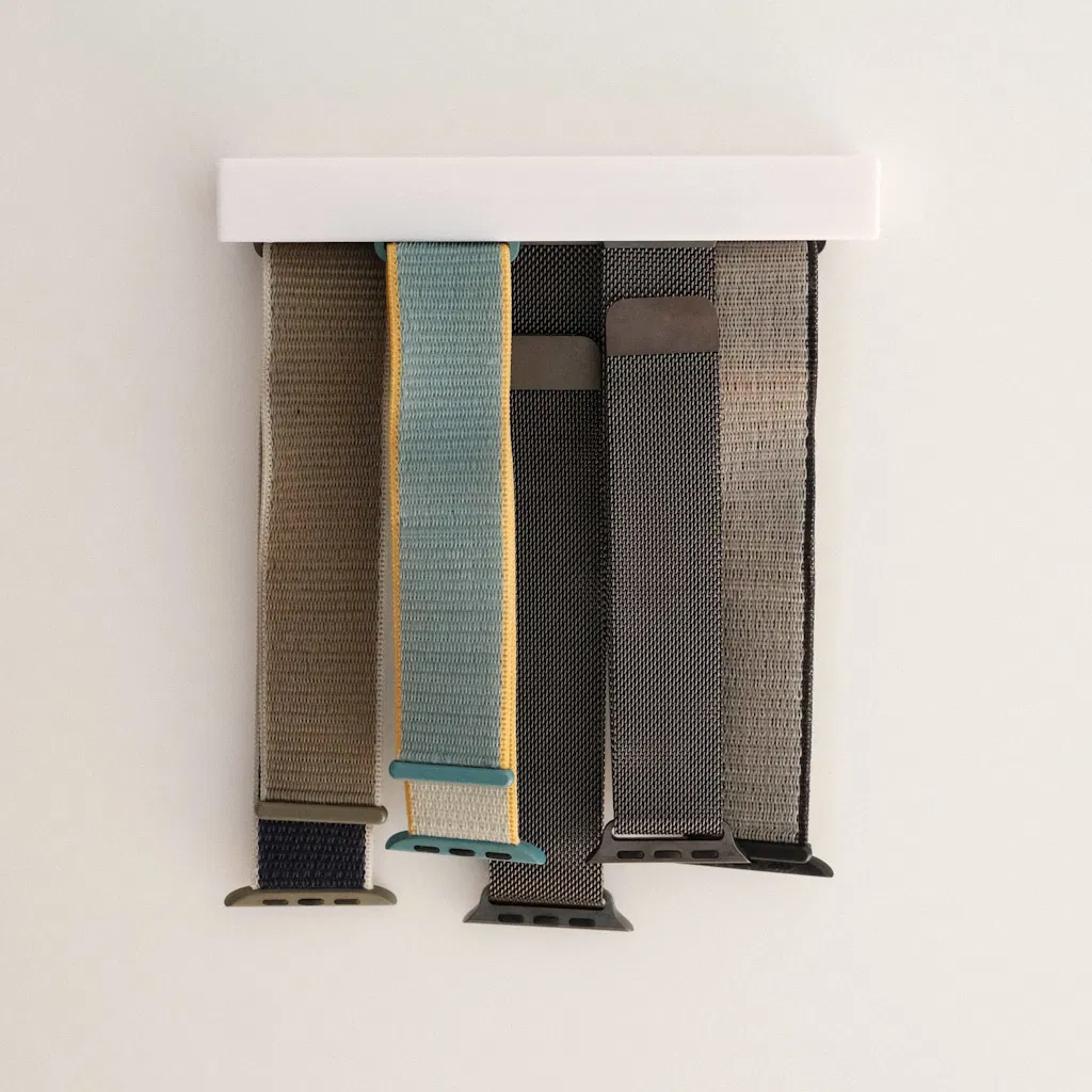 Không còn dây Apple Watch rớt lung tung nữa! Cái kệ này được thiết kế đặc biệt để giữ chặt tối đa 6 dây (40mm hoặc 44mm), nhét dây từ bên hông, gọn gàng và thẩm mỹ. Rất thích hợp treo trong tủ quần áo.