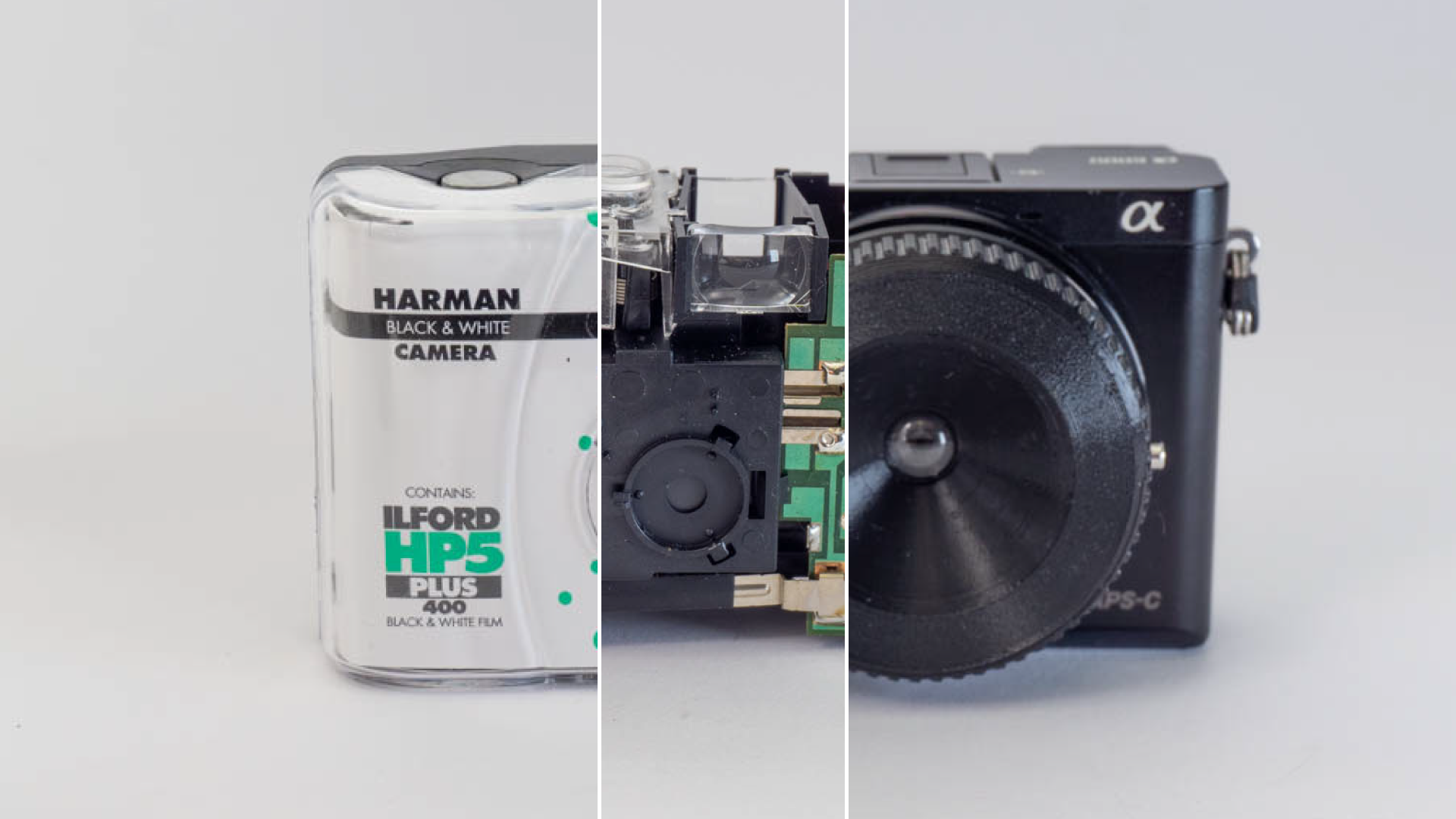 Nếu mình xài một cái ống kính thì mình sẽ có một cái ống kính có tiêu cự khoảng 35mm trên máy full frame và khoảng 50mm trên máy APS-C. Nếu mình có hai cái máy ảnh phim dùng một lần á thì mình có thể làm cái bộ đôi ống kính với 17mm (full frame) hoặc 26mm (APS-C):
