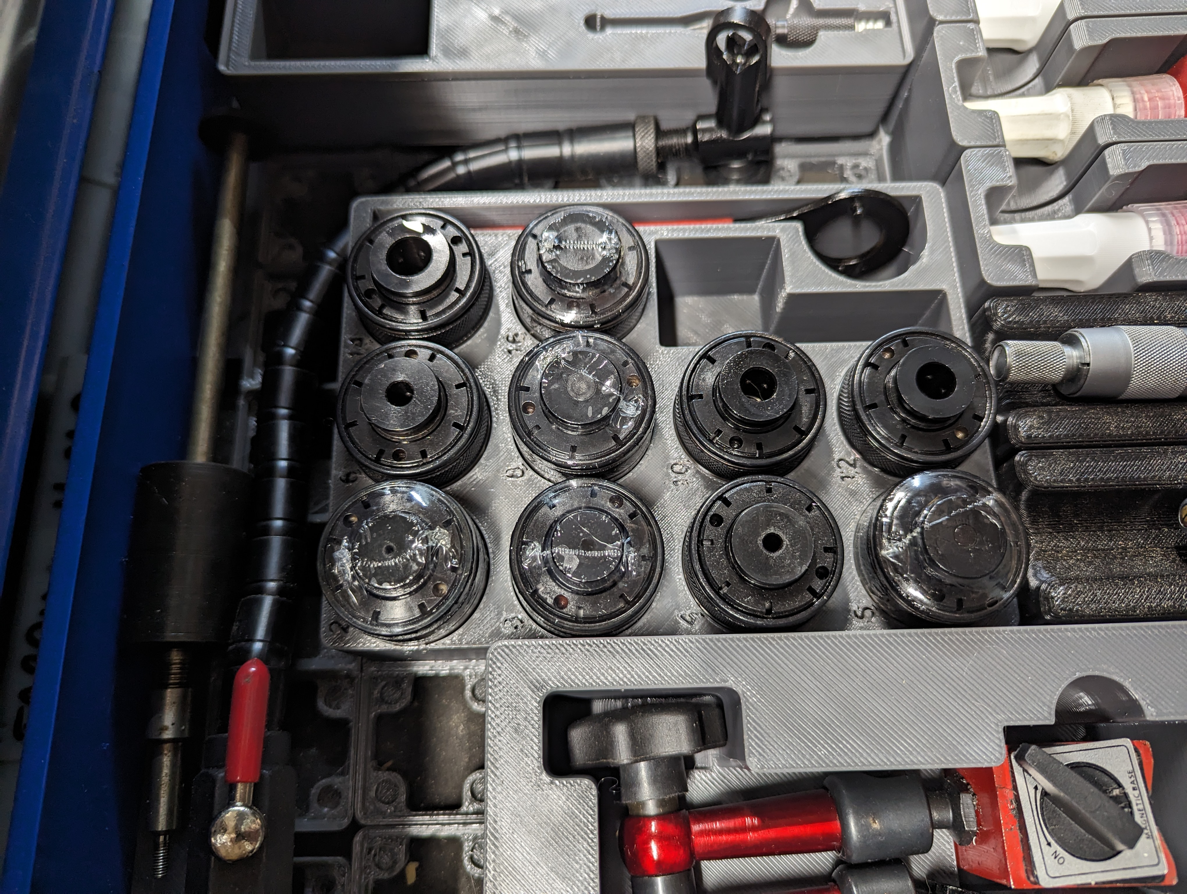 Một khay Gridfinity để chứa trọn bộ GT12 tapping collet chucks (tổng cộng 10 cái). M1-M16.