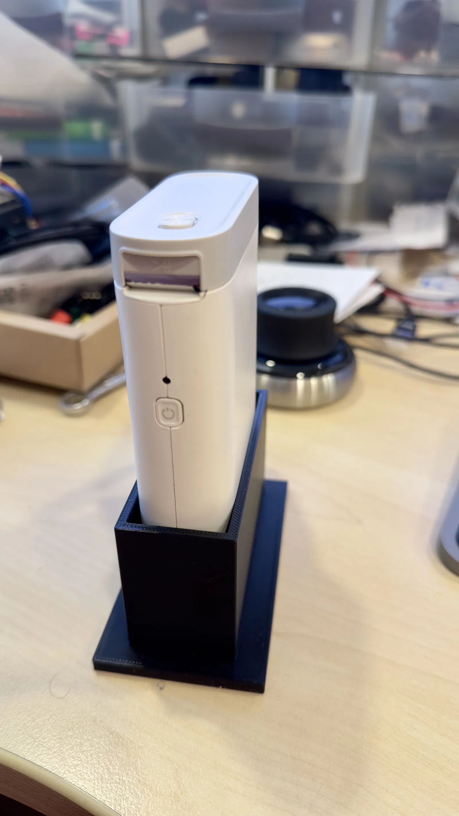 Tui có làm một cái đế để bàn đơn giản, chắc chắn cho máy in nhãn Nimbot D11. Cái đế này chỉ để đặt máy in thôi nha, không có sạc được đâu. Phù hợp để bàn làm việc gọn gàng hơn.