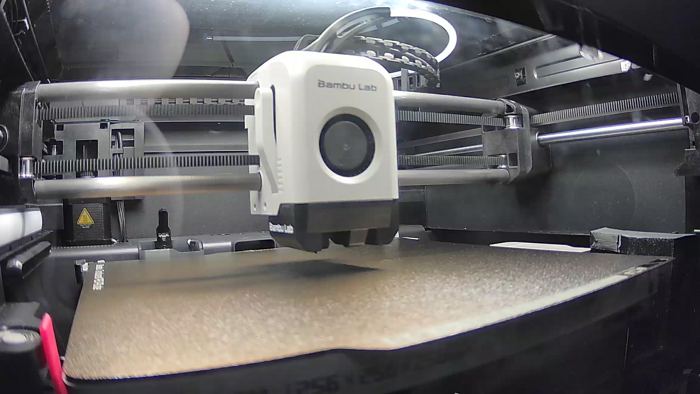 - Camera hơi nghiêng xuống khay in để nhìn rõ hơn lớp đầu tiên