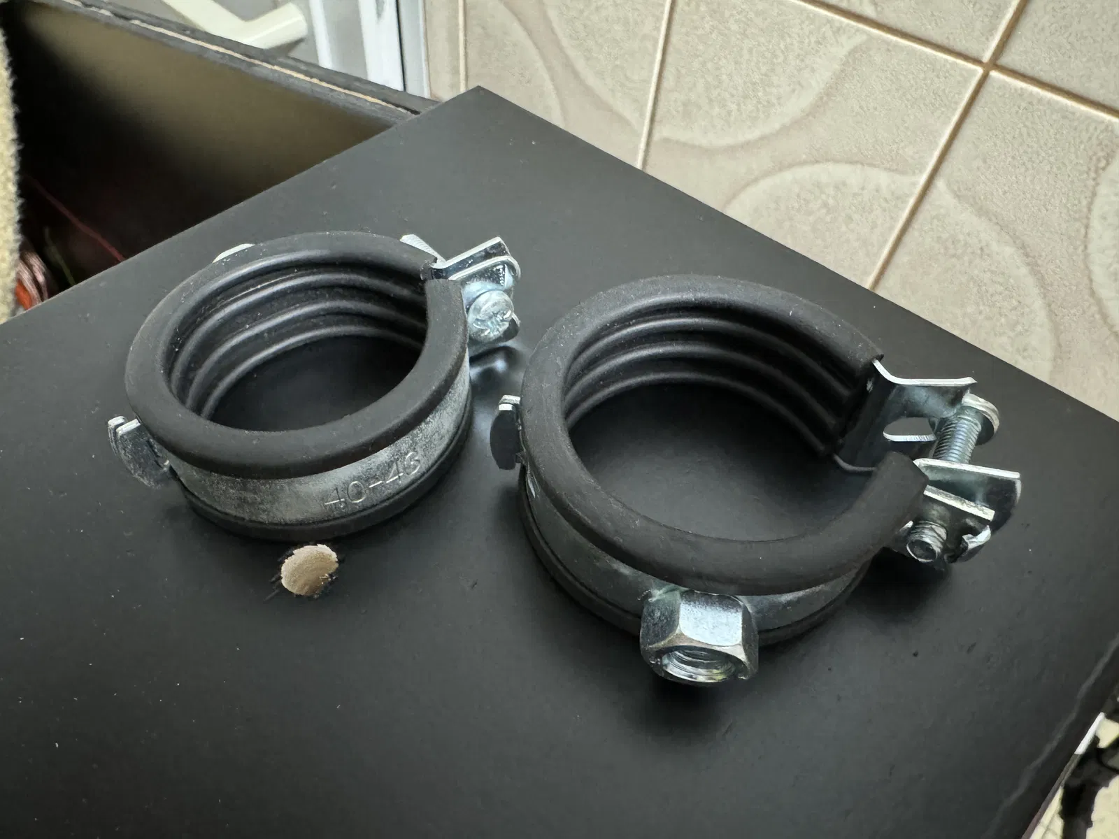 The holder can be screwed on with 4x screws. Two holders are used here, which are actually intended for pipes. These have a rubber coating that perfectly accommodates the motor. You will also need 2x M8 screws to attach the rubber holders.