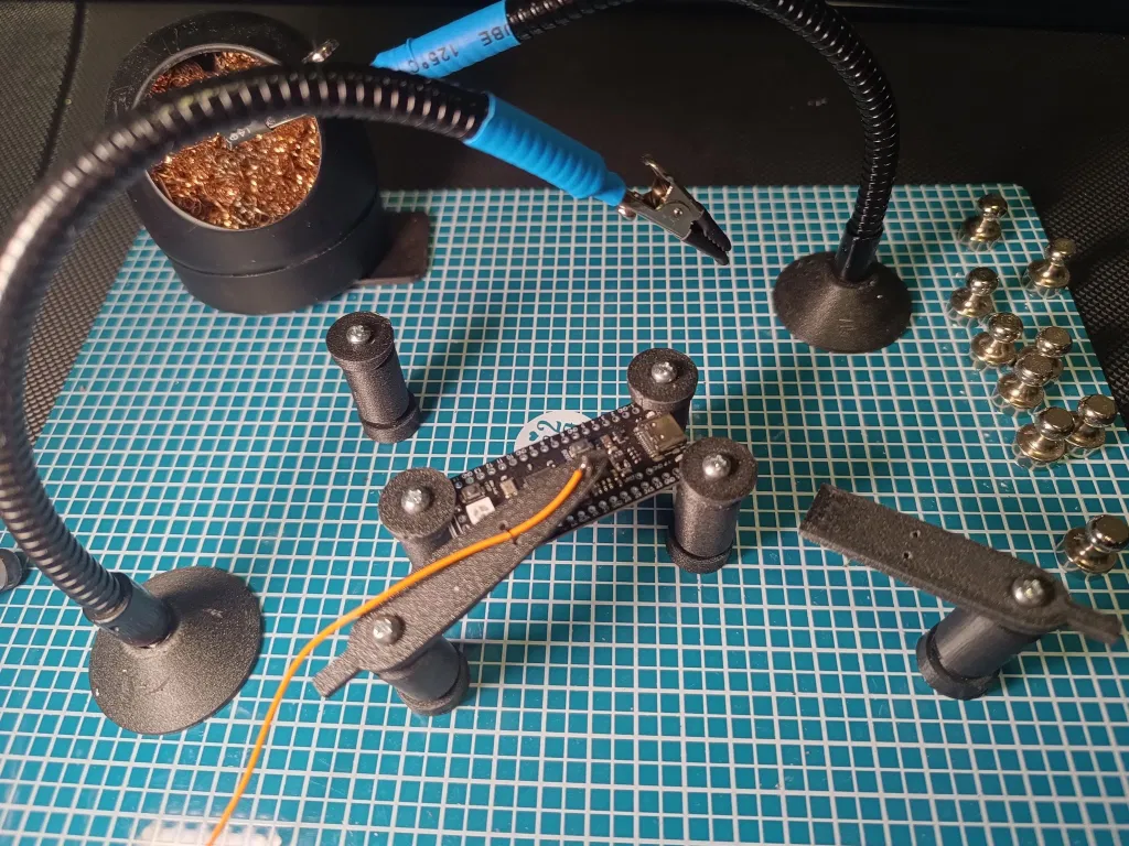 Dụng cụ hỗ trợ hàn và kẹp giữ bo mạch (PCB) với các đầu dò, dùng trên đế nam châm. Bạn cần lò xo, ốc m3, insert nhiệt và các bộ phận tùy chỉnh cho nam châm hoặc kẹp.