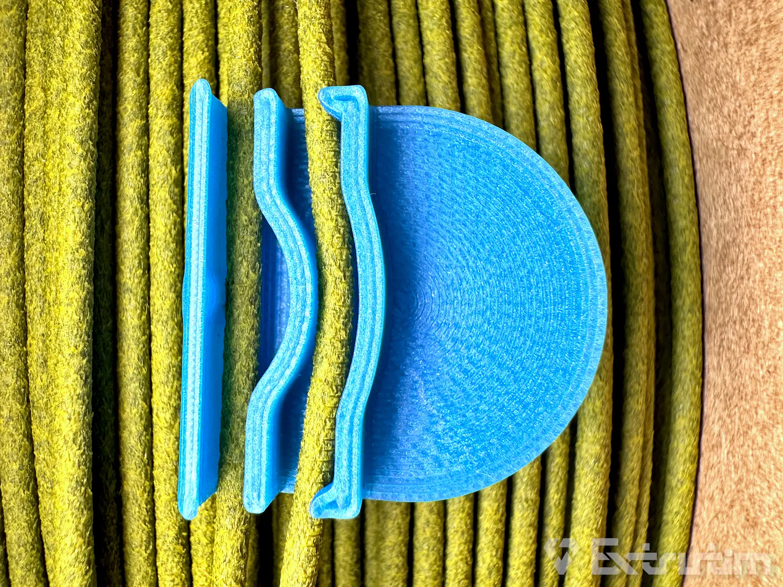 The classic, unchanged because the vast majority are perfectly satisfied with this clip. The stronger clip. If you use Silky PLA or another filament with poorer layer adhesion, this scoop will be more sturdy. The clip for beasty filament. Filaments like PC are very slippery and stiff at the same time. The previous turn is clamped much stronger and prevents slipping. The closed clips. If the filament is fed into a Bowden tube these clips can stay on the filament. The hole is shaped so that the filament when it is straight simply slips through, if it is wound on the spool it holds the filament by its bending.