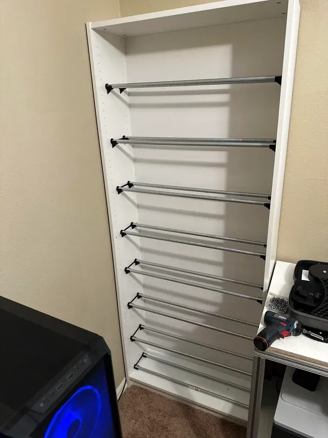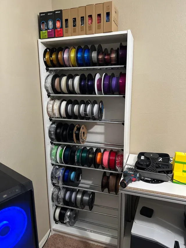 Biến tủ IKEA Billy thành giá đỡ filament hiệu quả với bộ phận in 3D và ống EMT. Hướng dẫn chi tiết cách lắp ráp, vật liệu cần thiết và mẹo để tối ưu hóa không gian lưu trữ cho khoảng 88 cuộn filament 1kg.