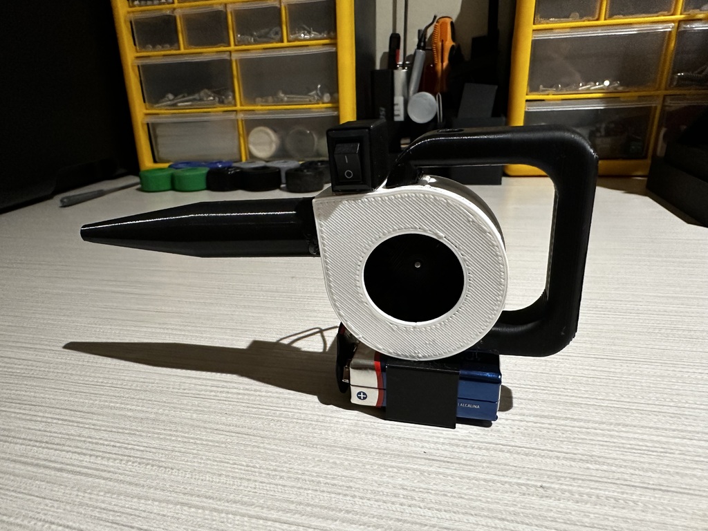 Bản remix Máy thổi lá mini này tập trung vào việc cải tiến hộp công tắc điện và bộ giữ pin 9V. Người dùng đã làm lại hộp công tắc cho phù hợp với loại "Mini boat rocker switch" phổ biến hơn và làm lại bộ giữ pin 9V cho vừa vặn hơn. Vỏ máy thổi được lắp ngược để công tắc gắn trên đỉnh, trông thực tế hơn.
