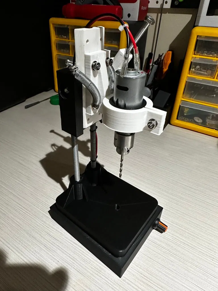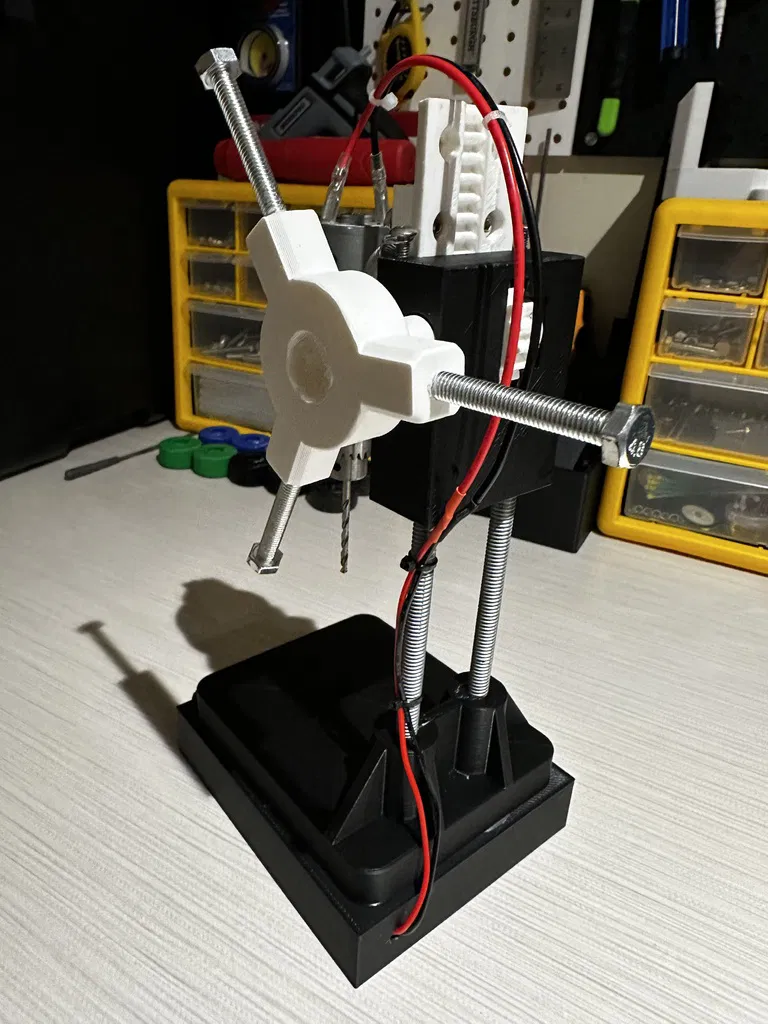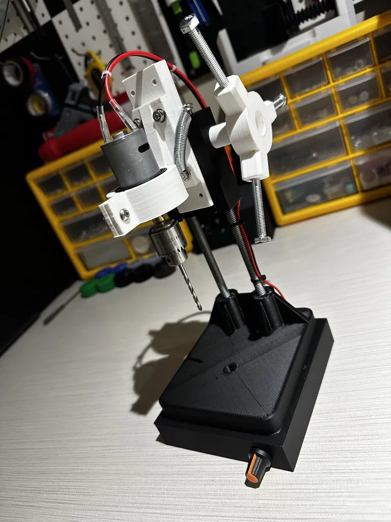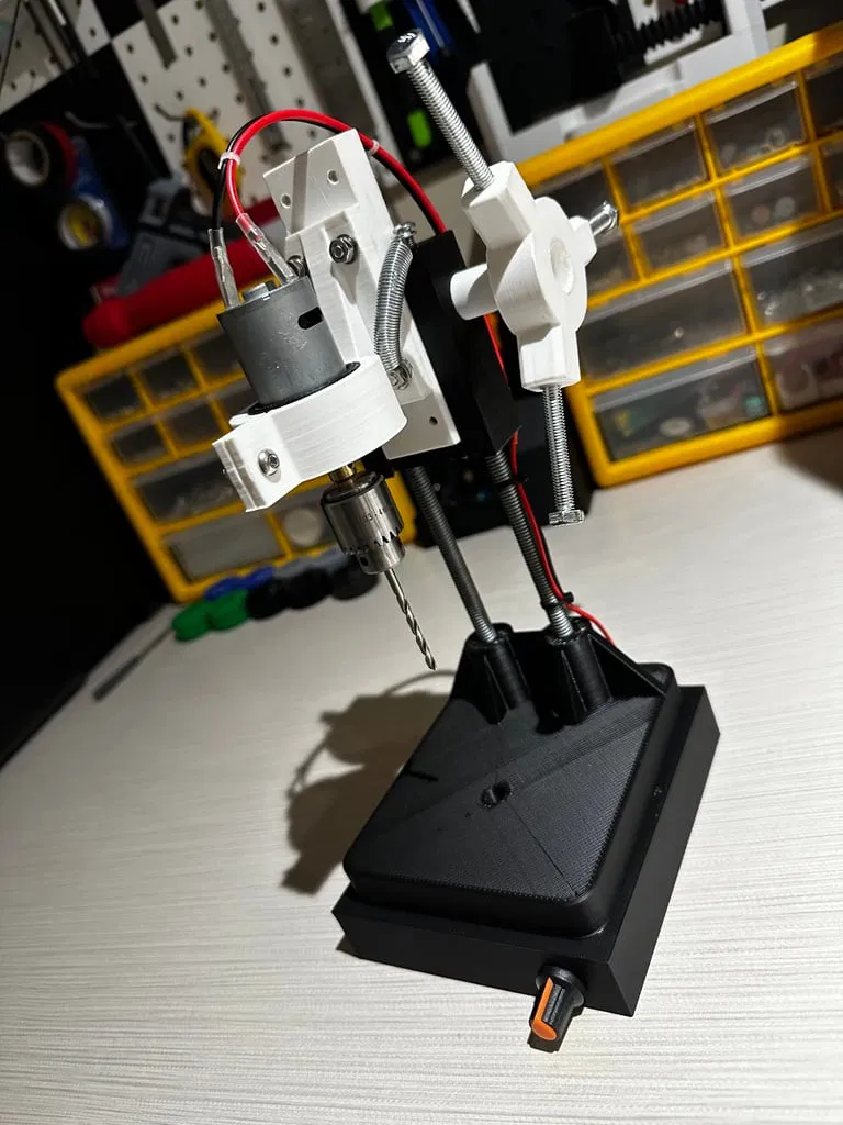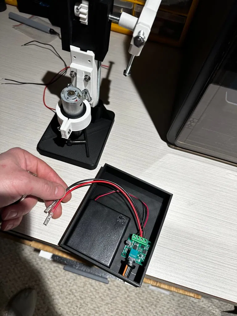 Tui đã chỉnh sửa từ thing:2763330 vì tui muốn xài cái mũi khoan điện tử thủ công 12V rẻ tiền (Bộ khoan tay) mà bên Amazon bán. Link: https://www.amazon.com/AUTOTOOLHOME-Electric-Drill-Motor-Drills/dp/B01LZYWFE4/ref=sr_1_5?crid=33LJ1XB5N8PZY&keywords=electric+motor+drill&qid=1706632744&sprefix=electric+motor+drill%2Caps%2C90&sr=8-5 vì nó rẻ bằng nửa cái motor lớn dùng trong bản gốc này.